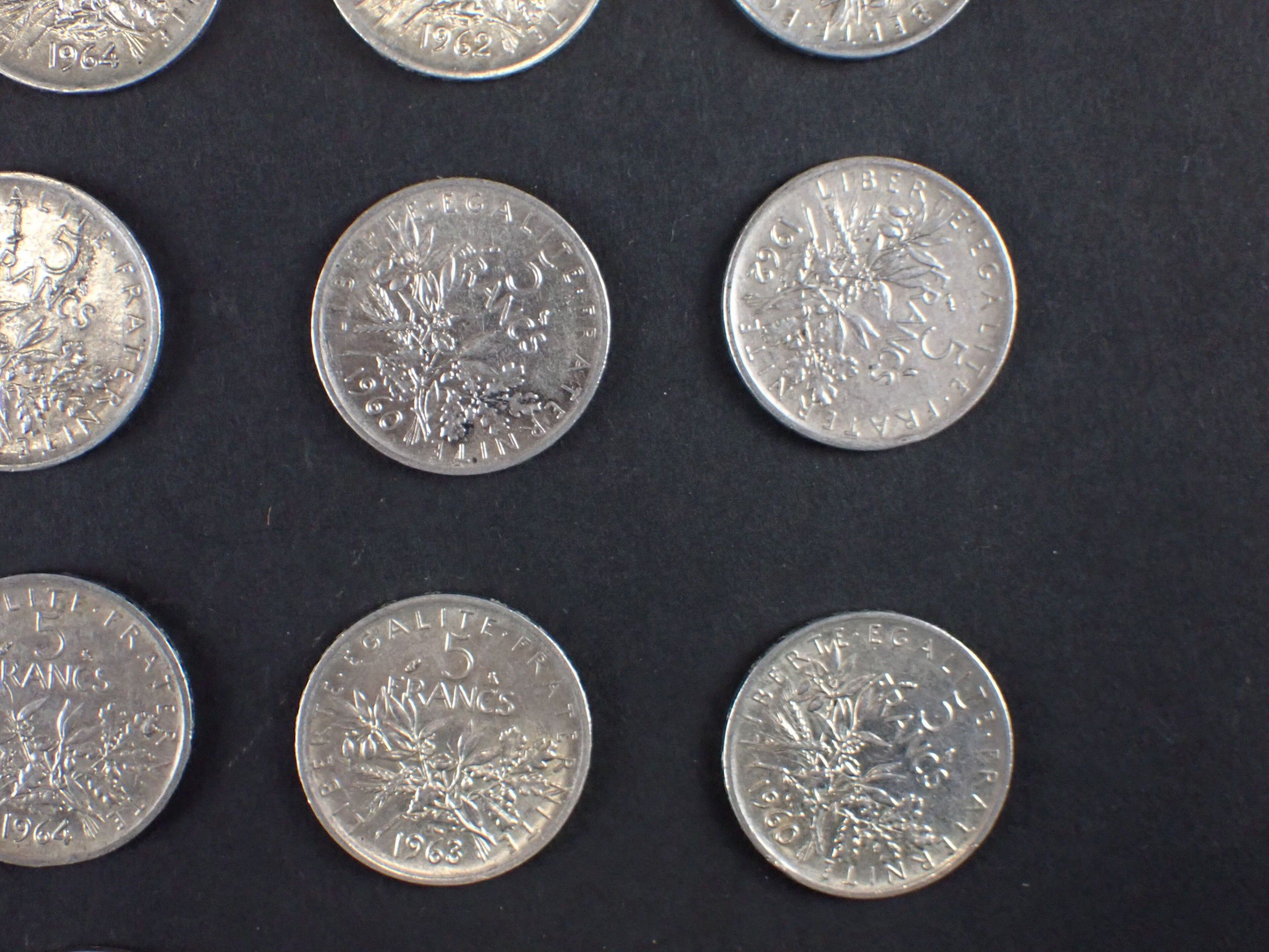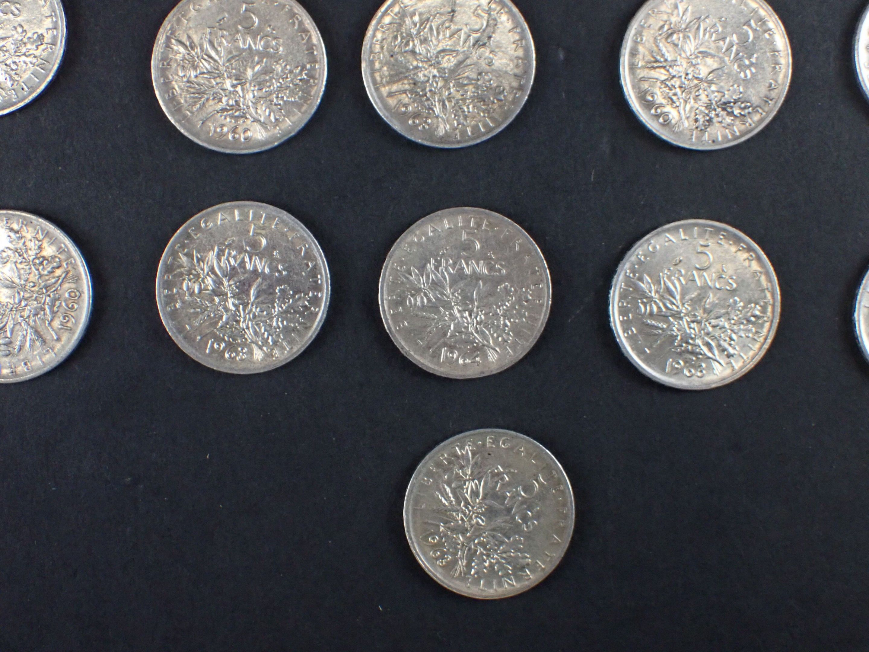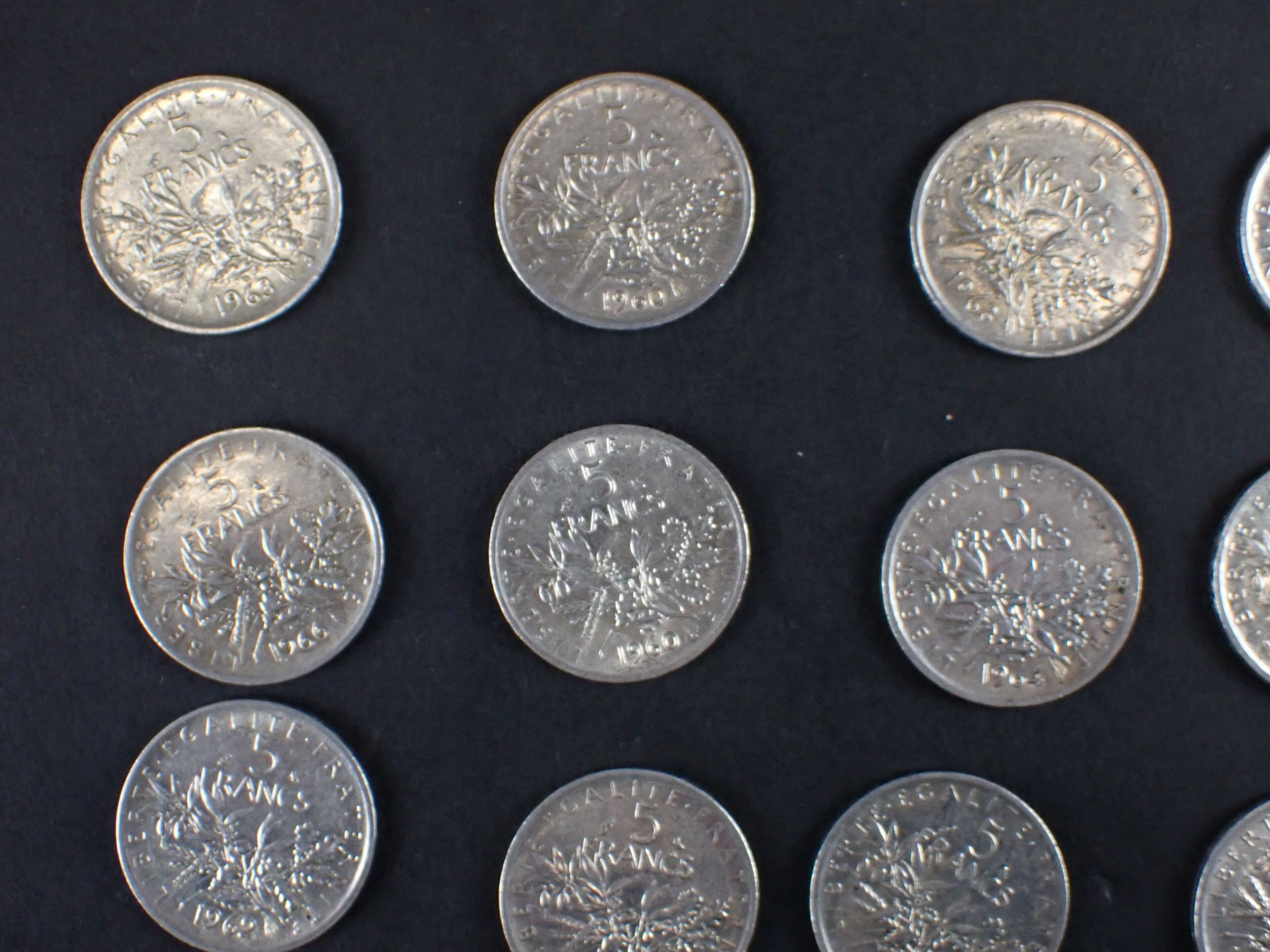 FRANCE: Reunion of 21 5-franc silver Semeuse type coins, from 1960 to 1963.