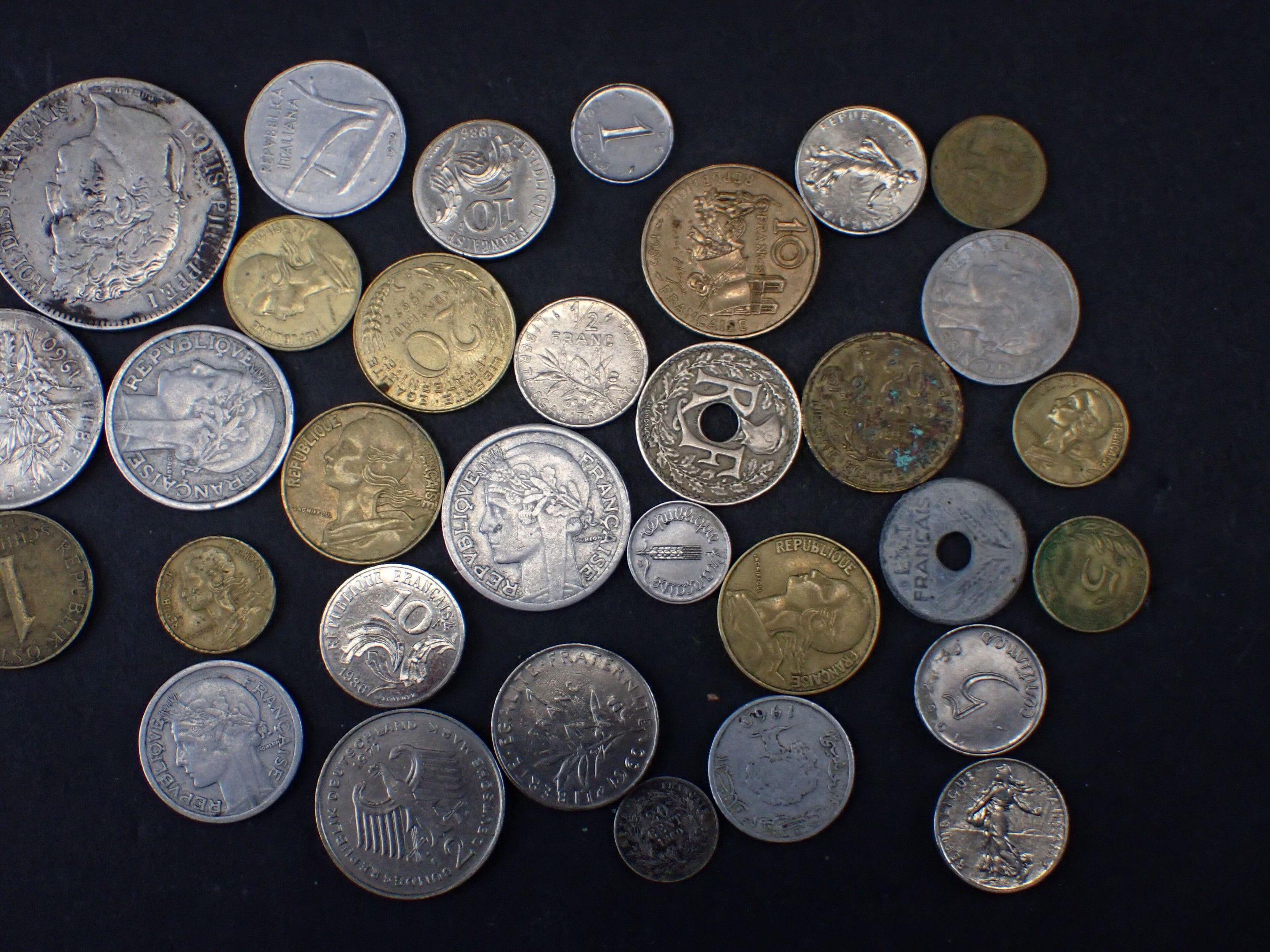 Small lot of mainly French coins, including a 5 franc silver coin 1960, a 5 franc silver coin Louis-Philippe Ier 1832, nickel coins, pierced coins, brass coins, various effigies and countries, wear from use.