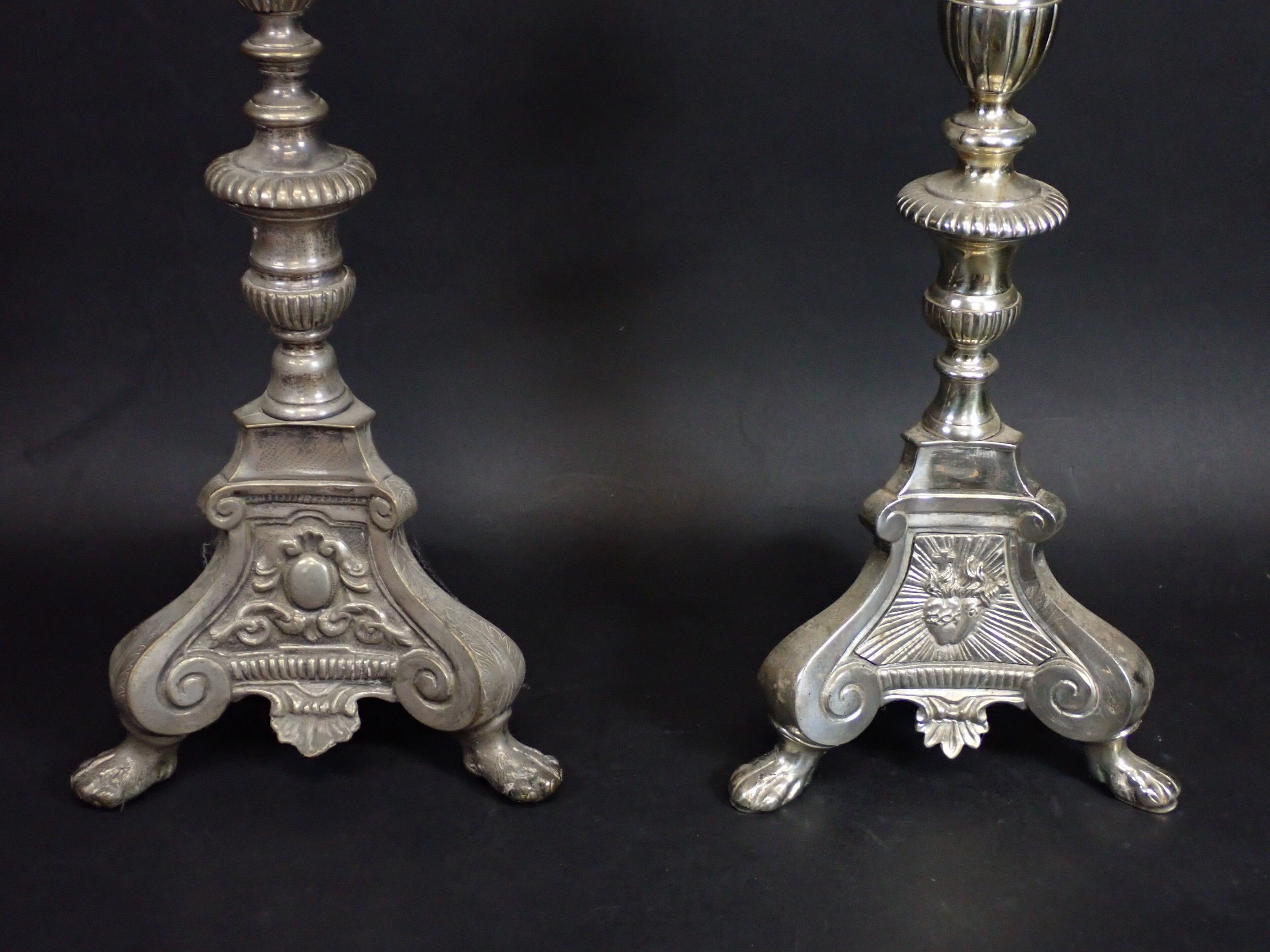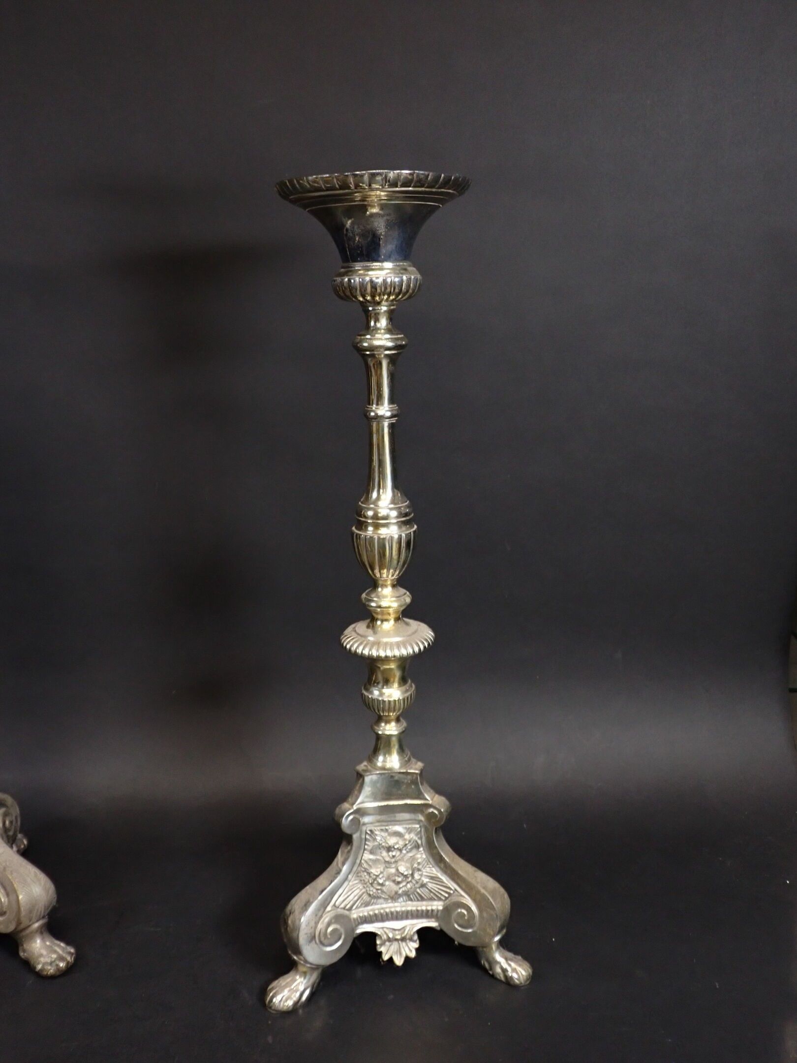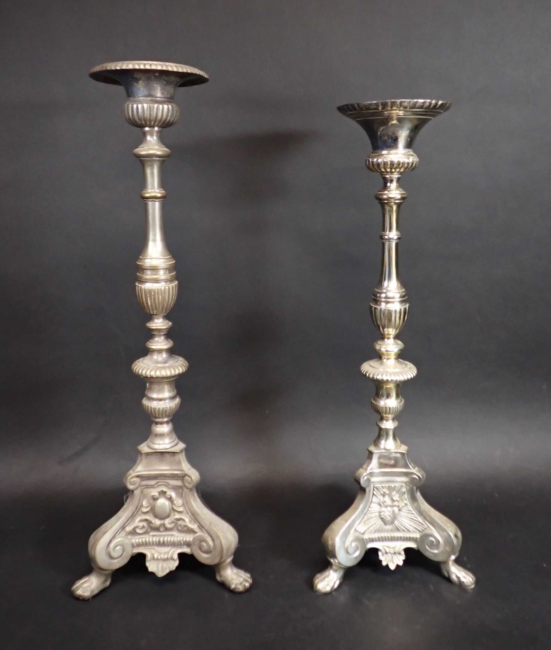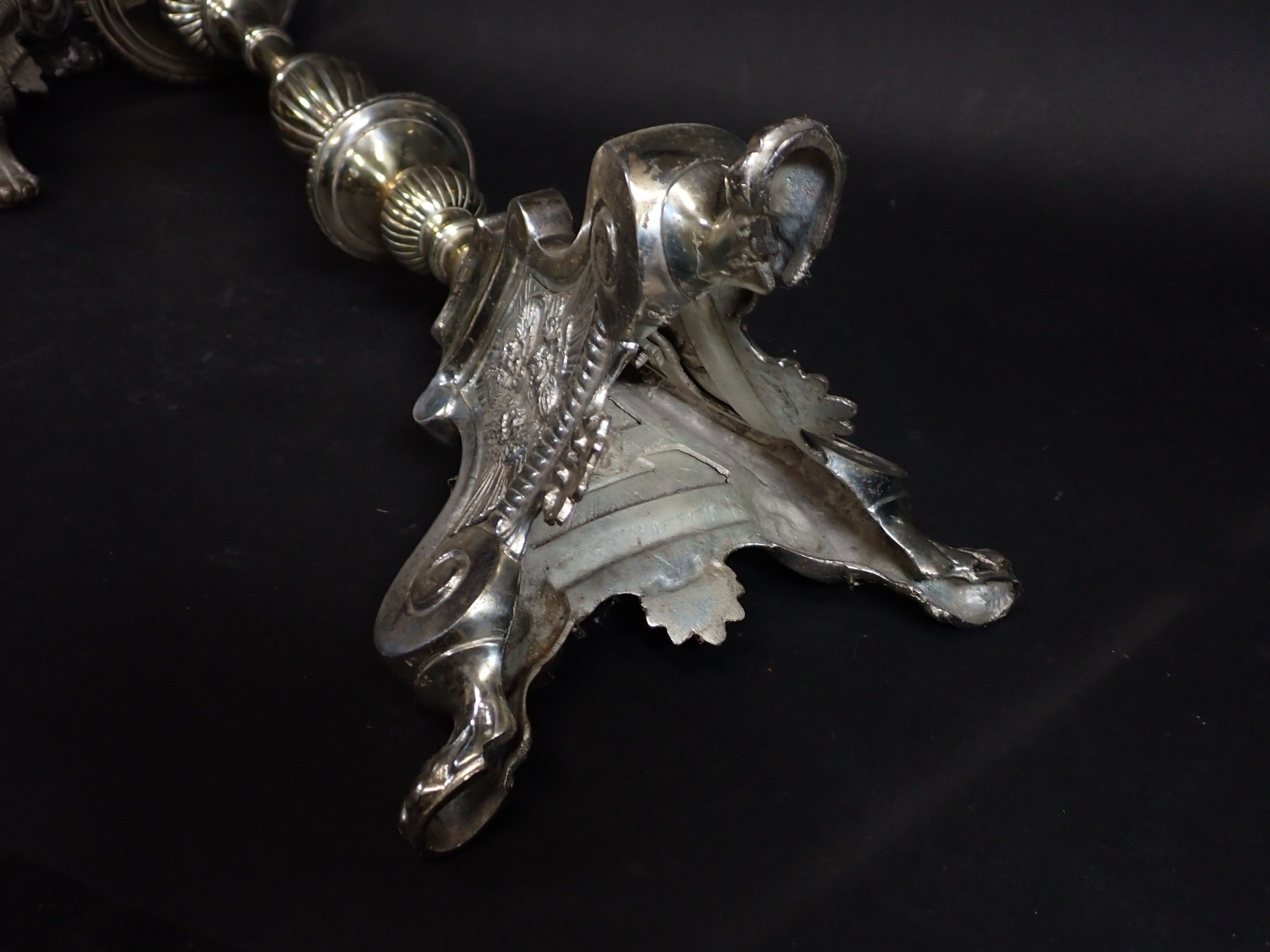 A pair of 19th century silver-plated bronze tripod candlesticks with gadrooned baluster shafts, standing on lion paws. Height: 61 cm and 65 cm (wear)