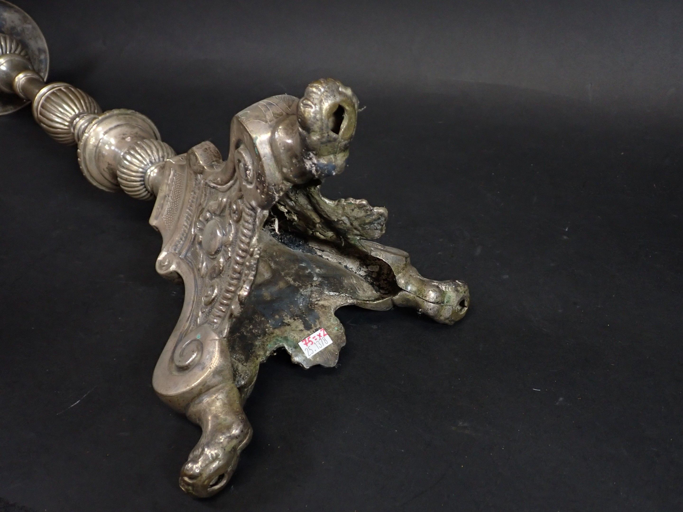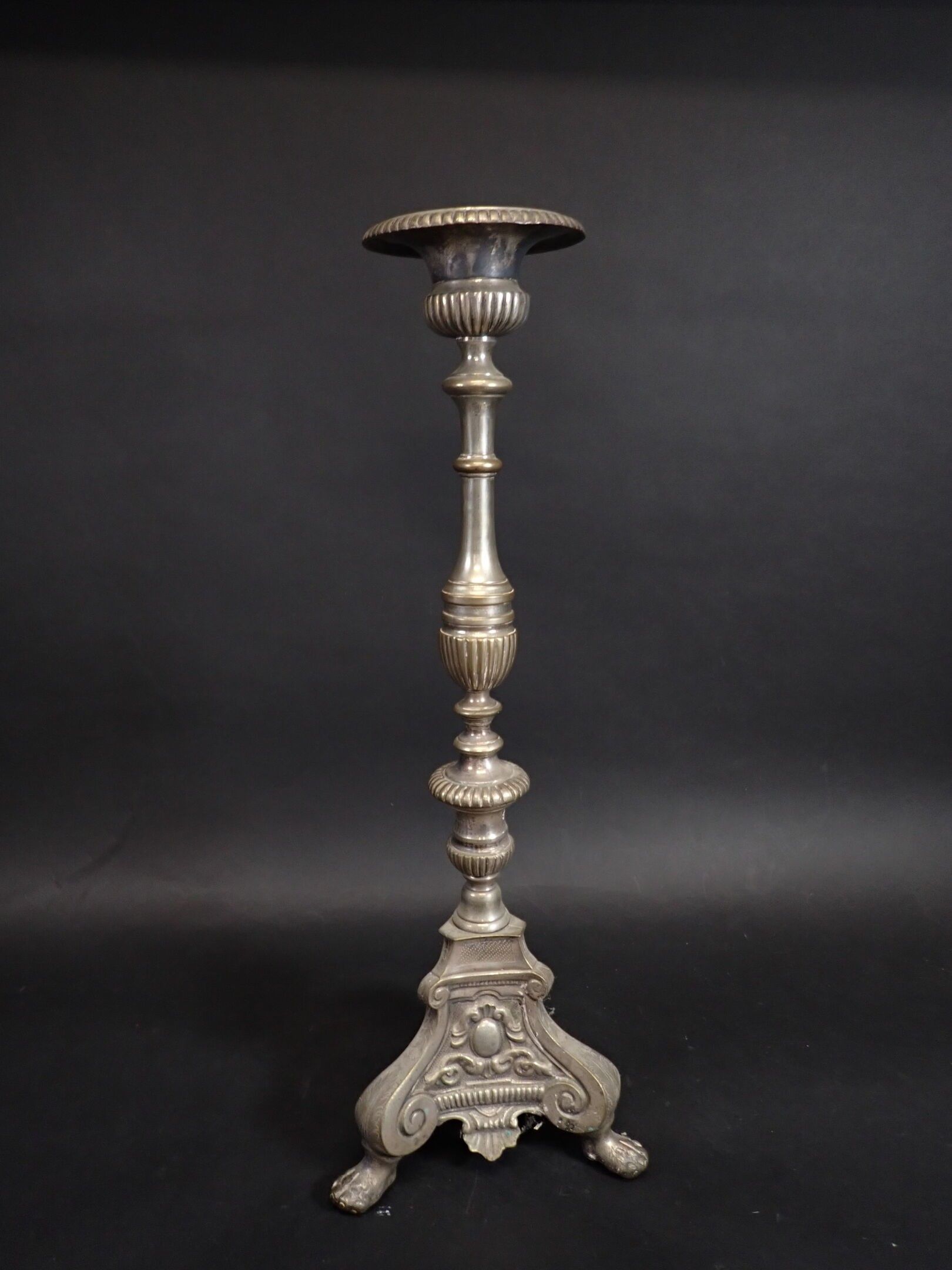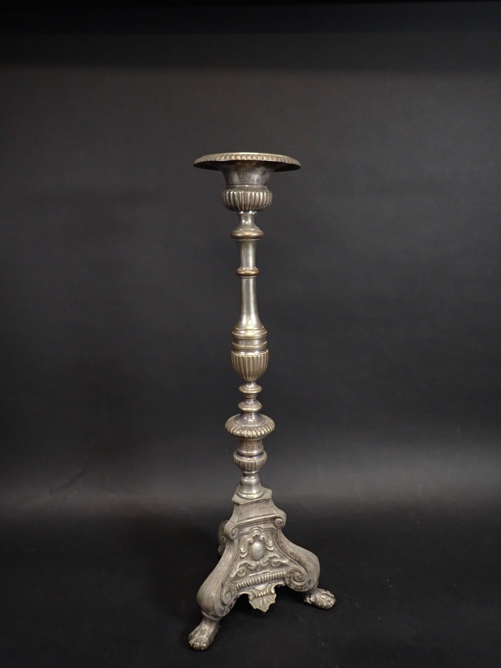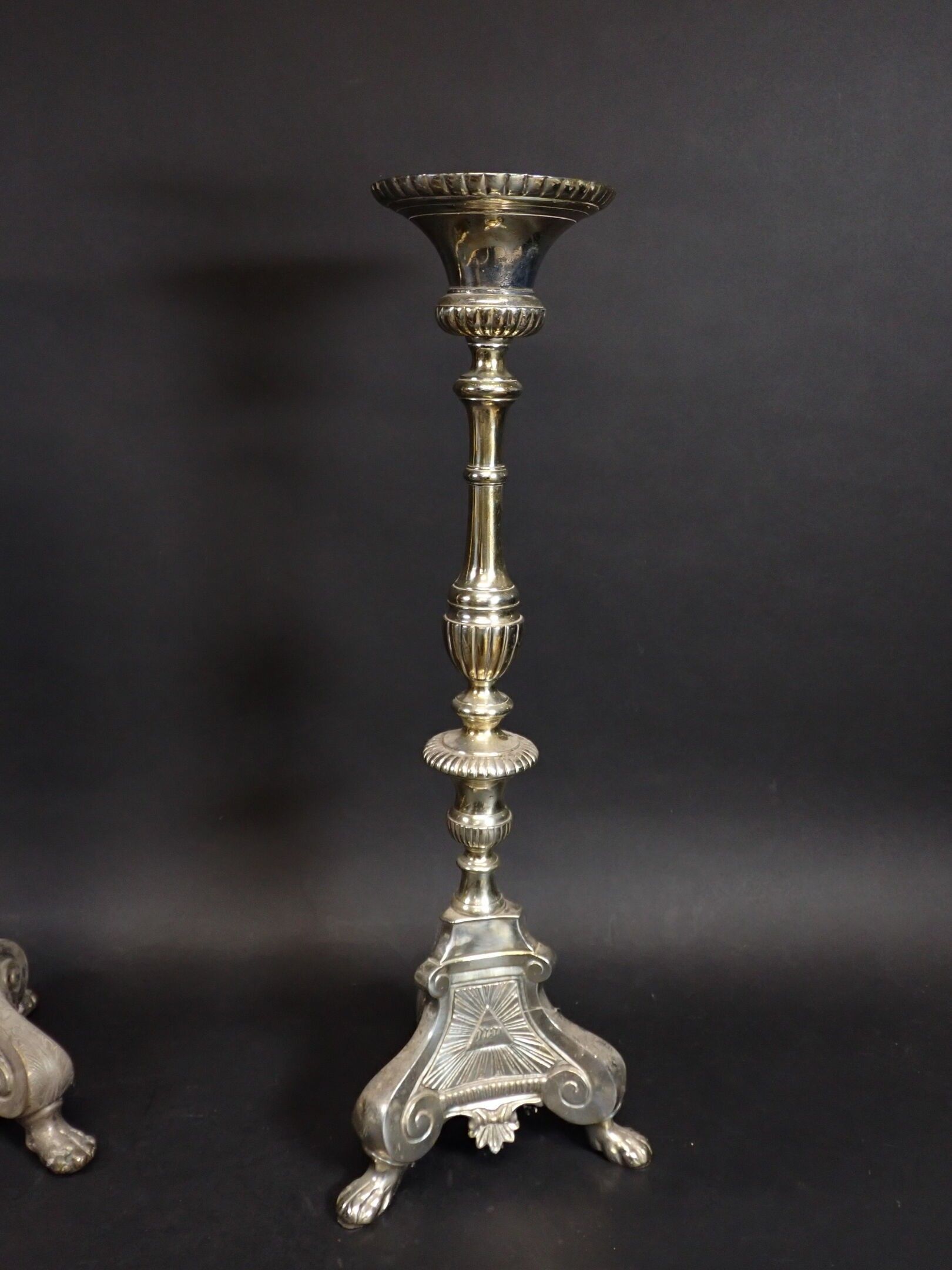 A pair of 19th century silver-plated bronze tripod candlesticks with gadrooned baluster shafts, standing on lion paws. Height: 61 cm and 65 cm (wear)