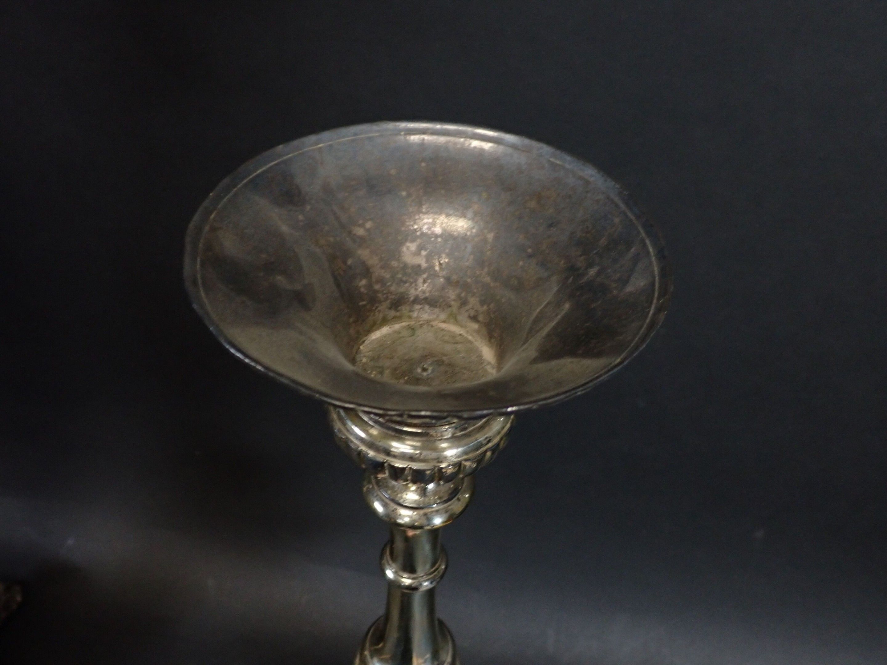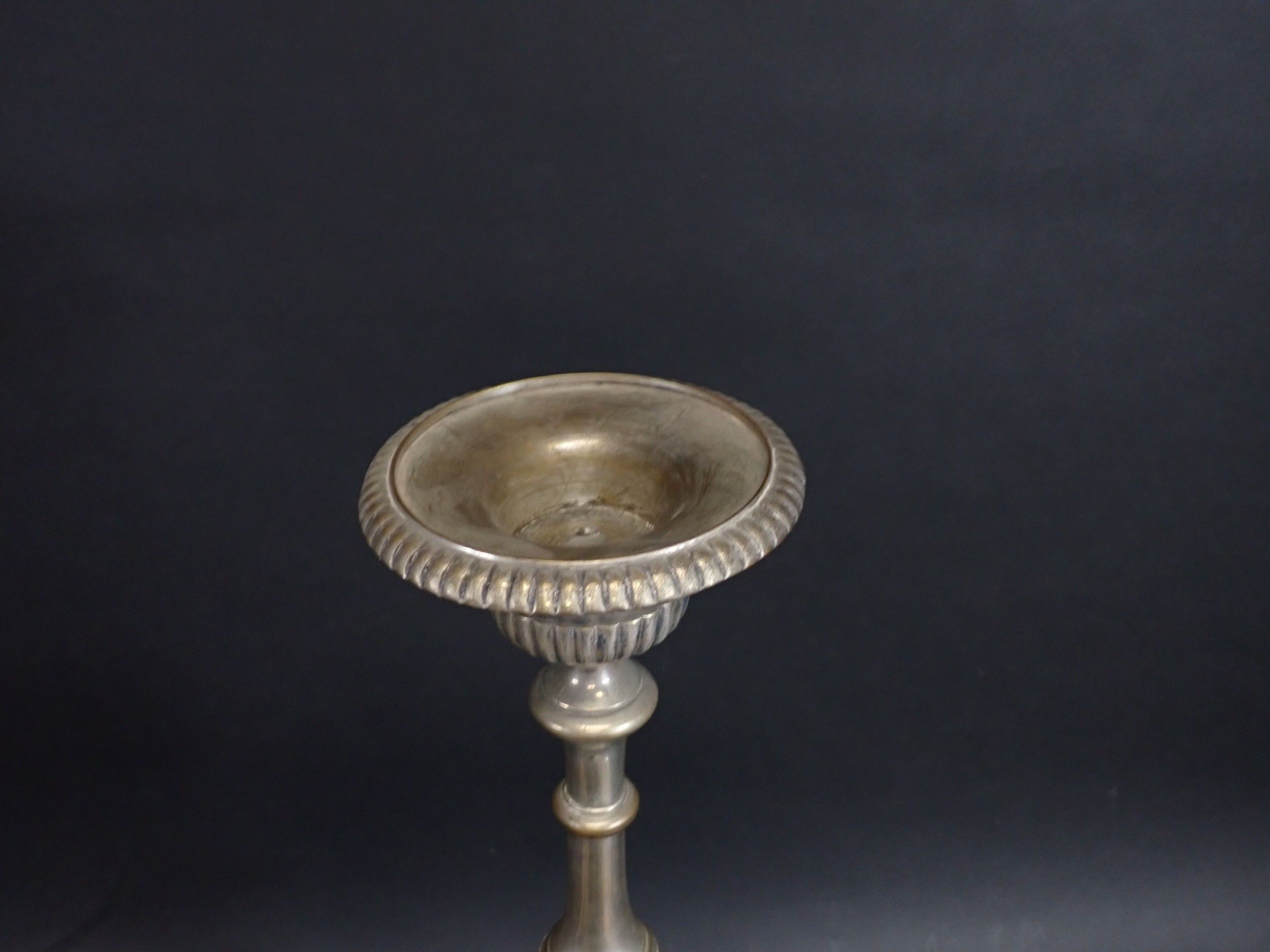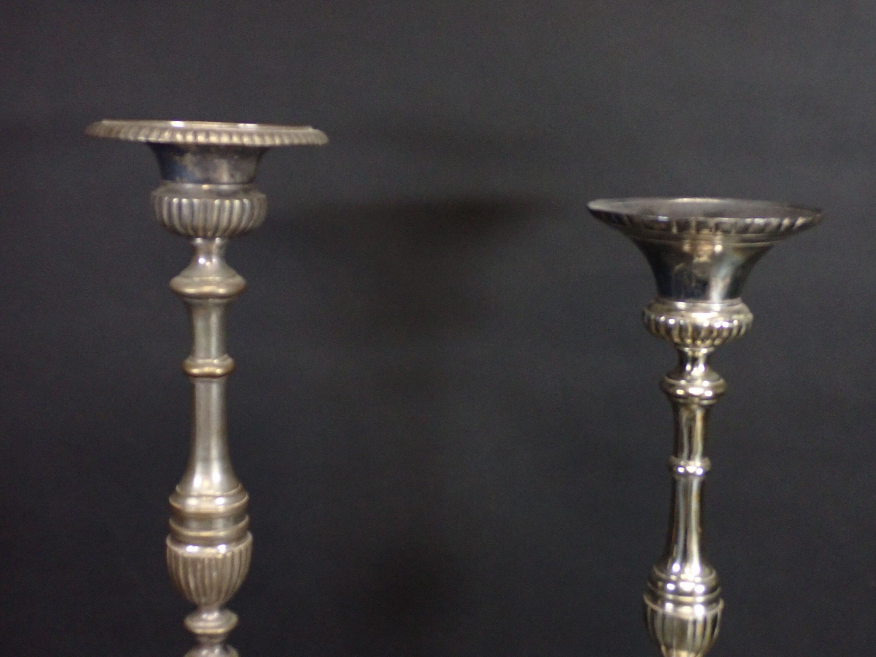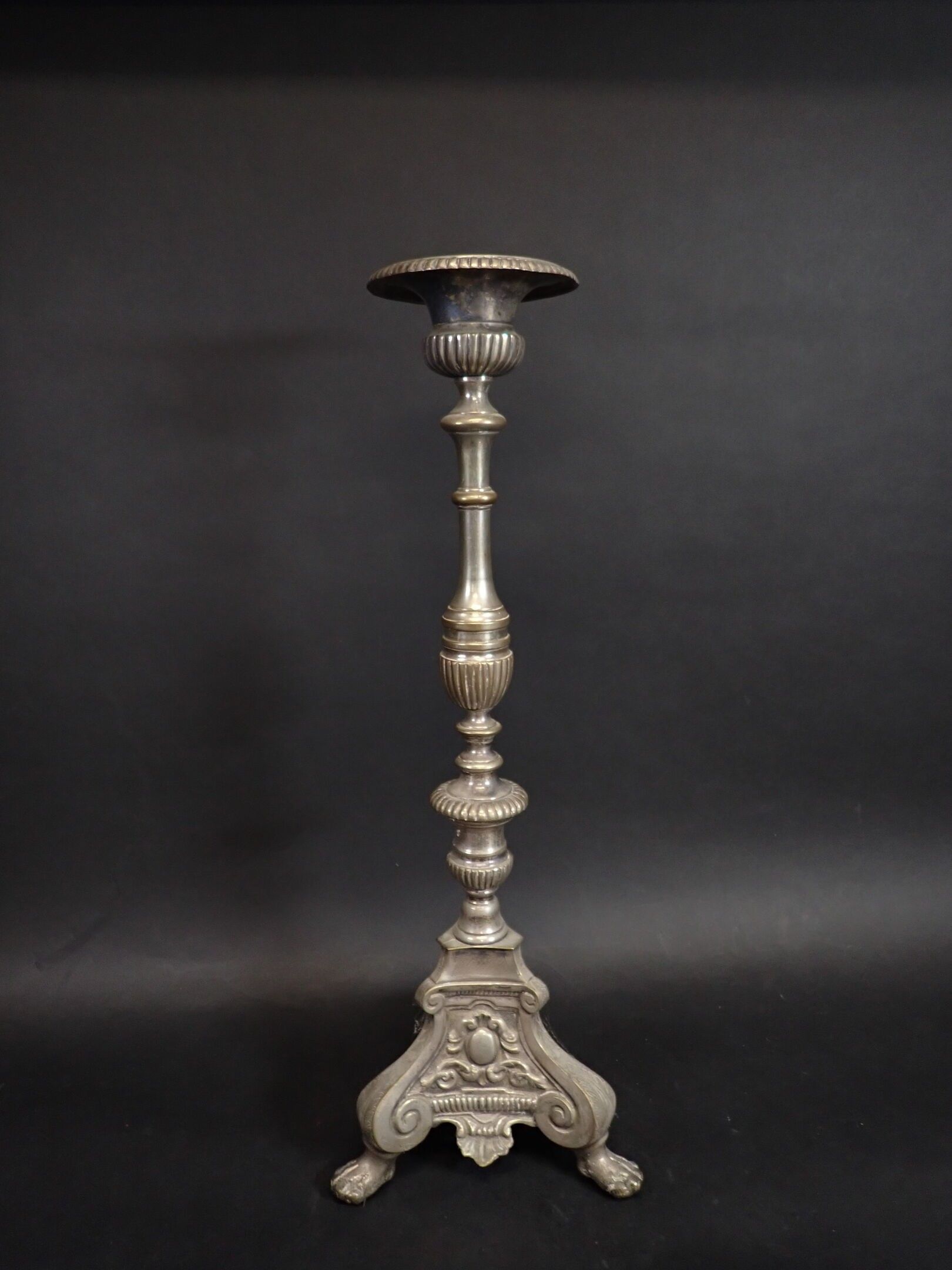 A pair of 19th century silver-plated bronze tripod candlesticks with gadrooned baluster shafts, standing on lion paws. Height: 61 cm and 65 cm (wear)