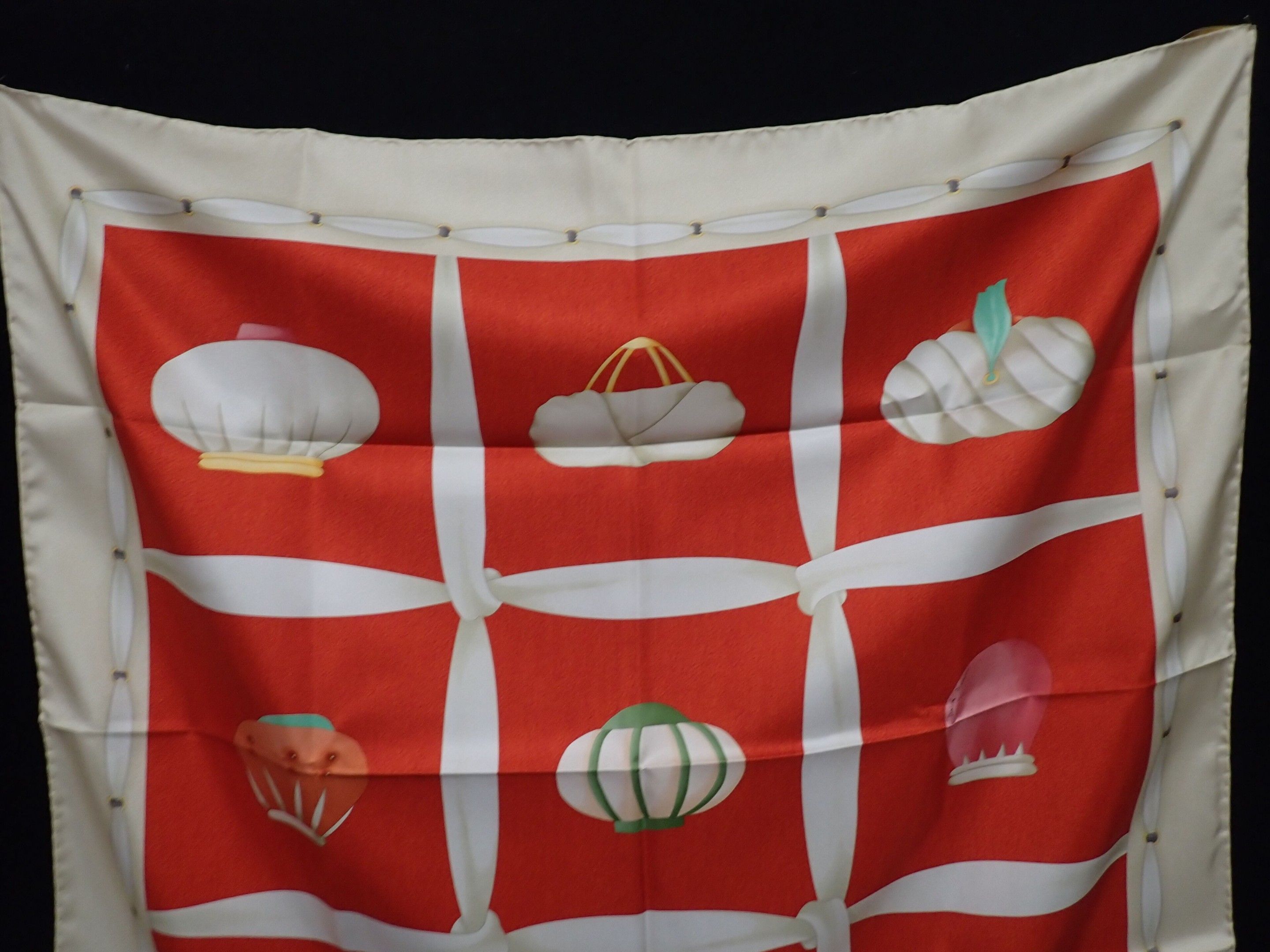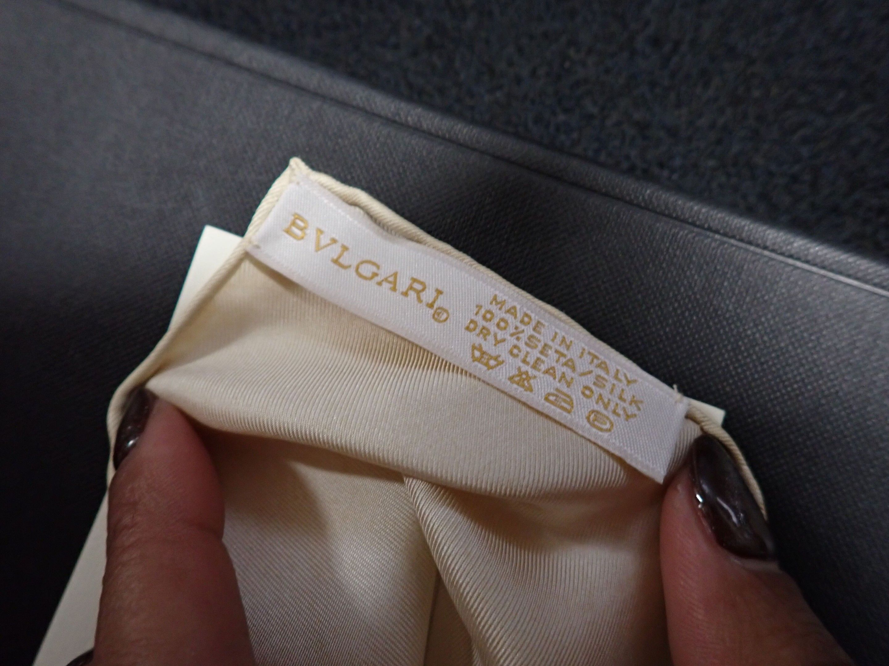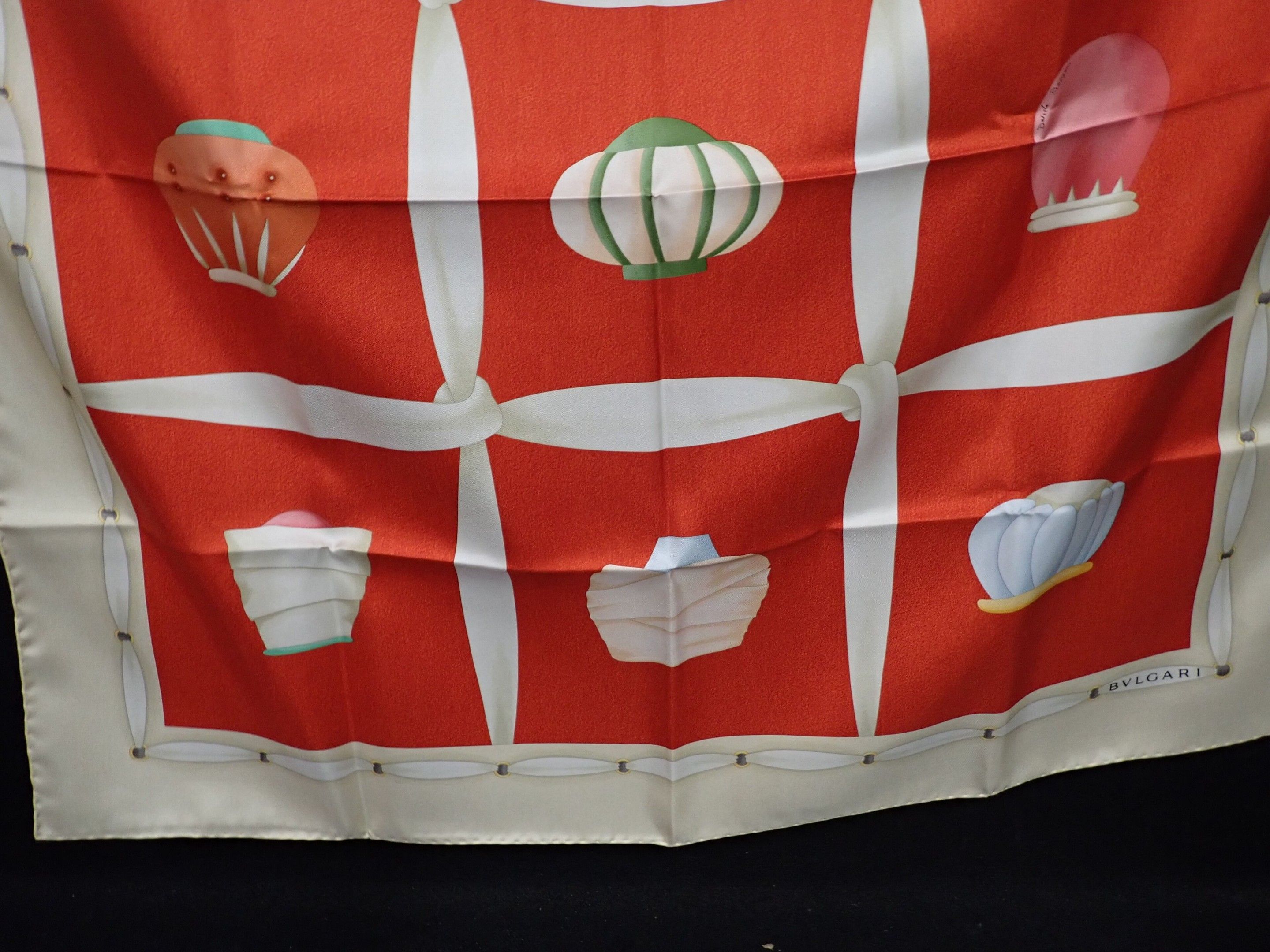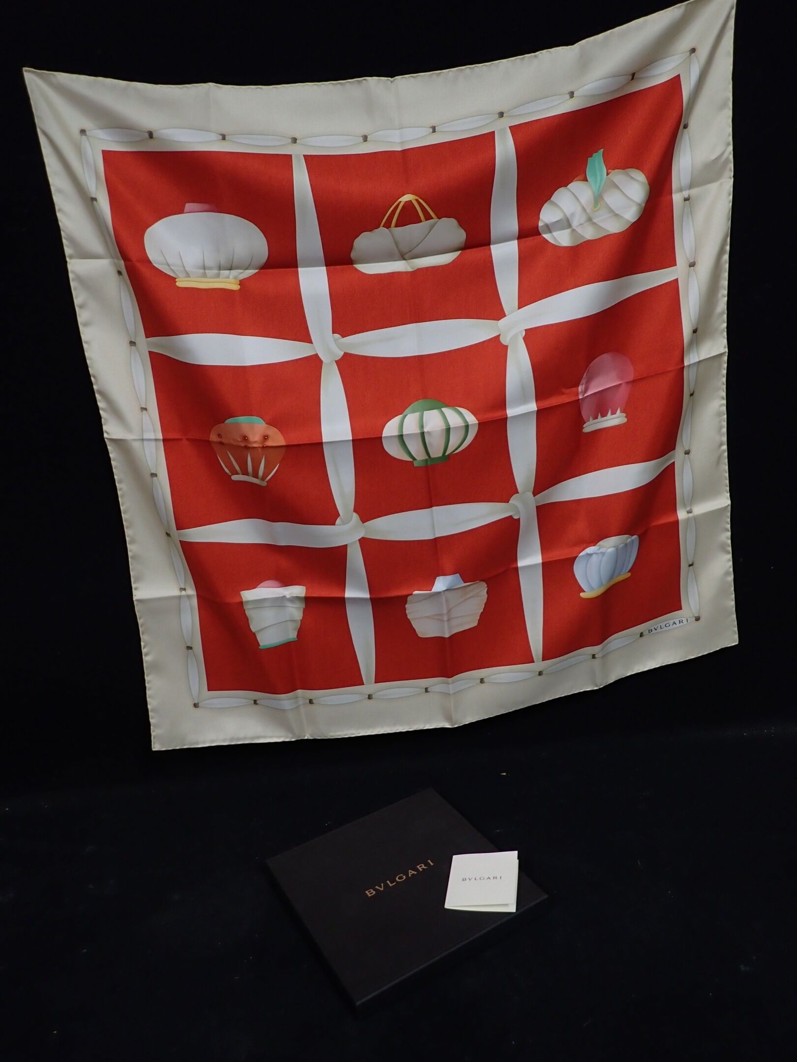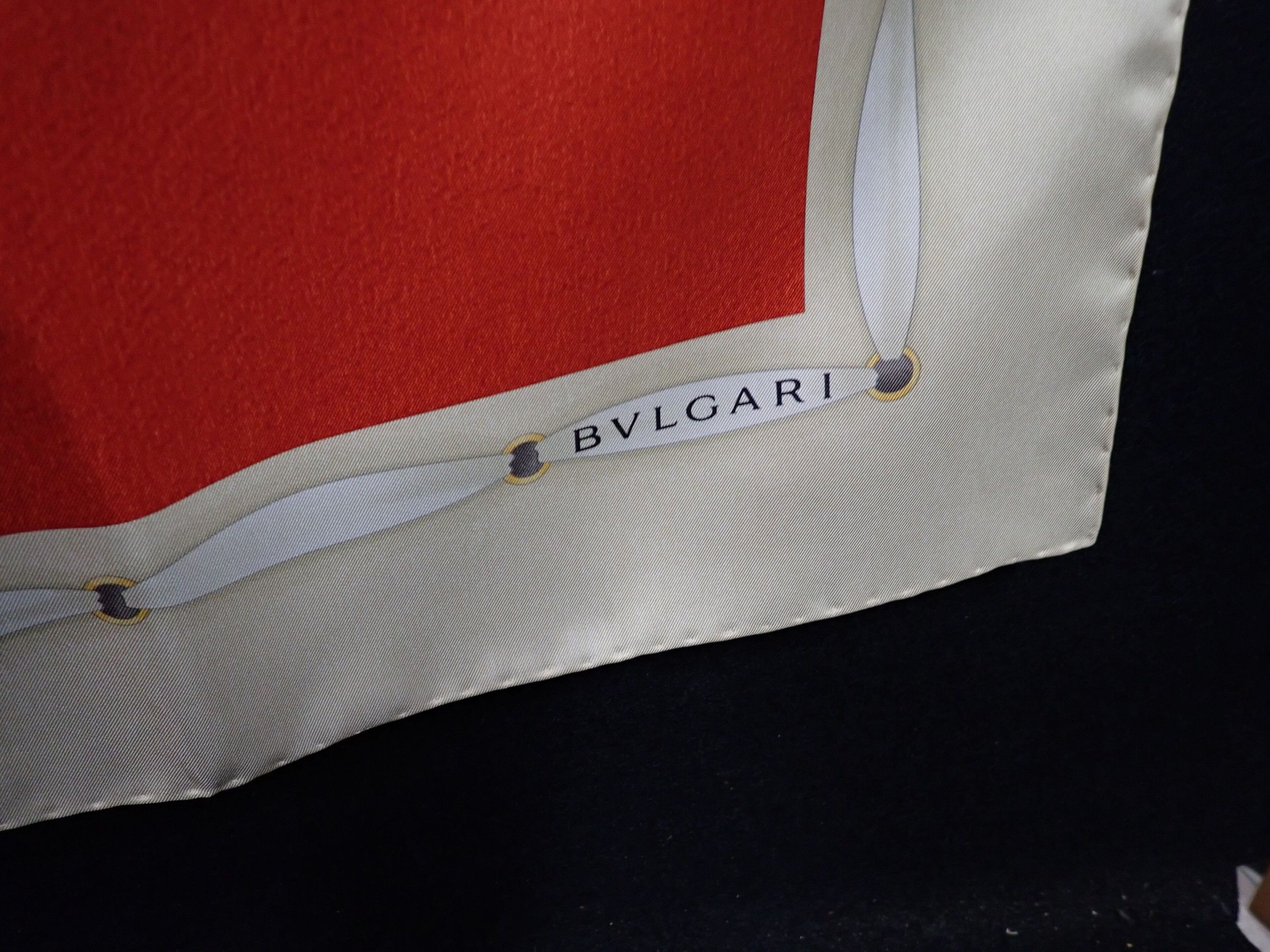 BULGARI - Printed silk square with headdress decoration, signed Davide Pizzigou, red background, new in box. 75 x 75 cm
