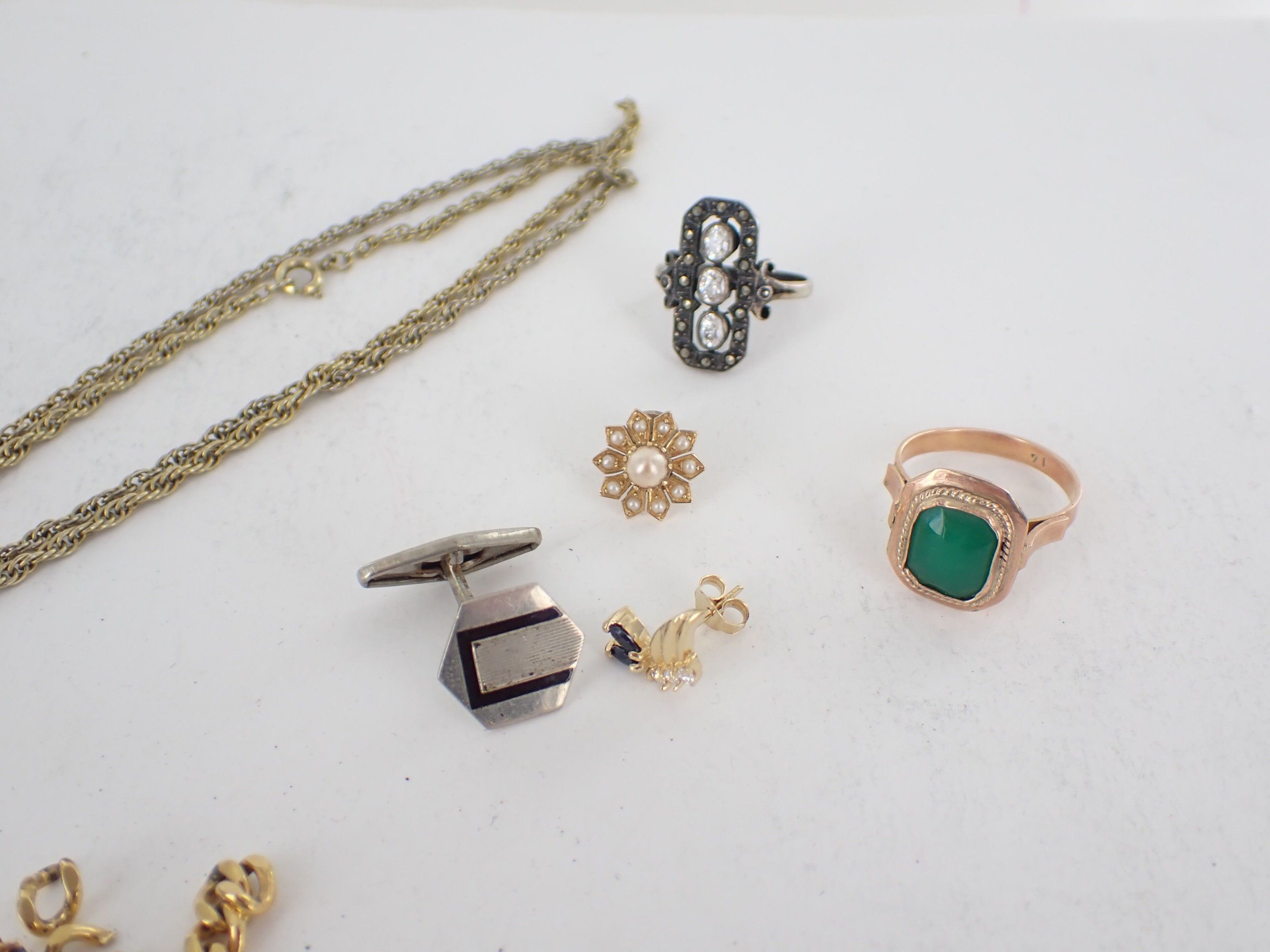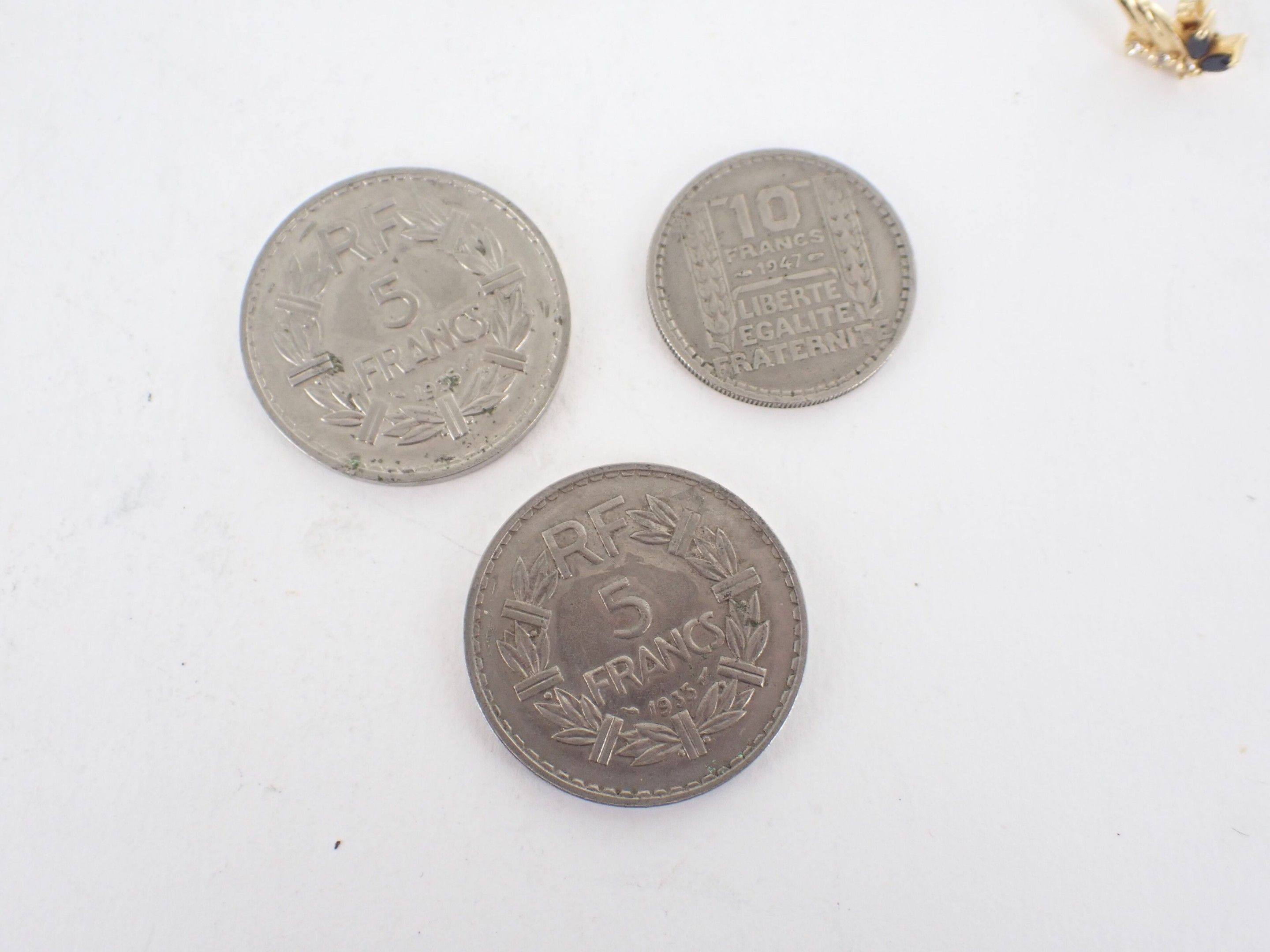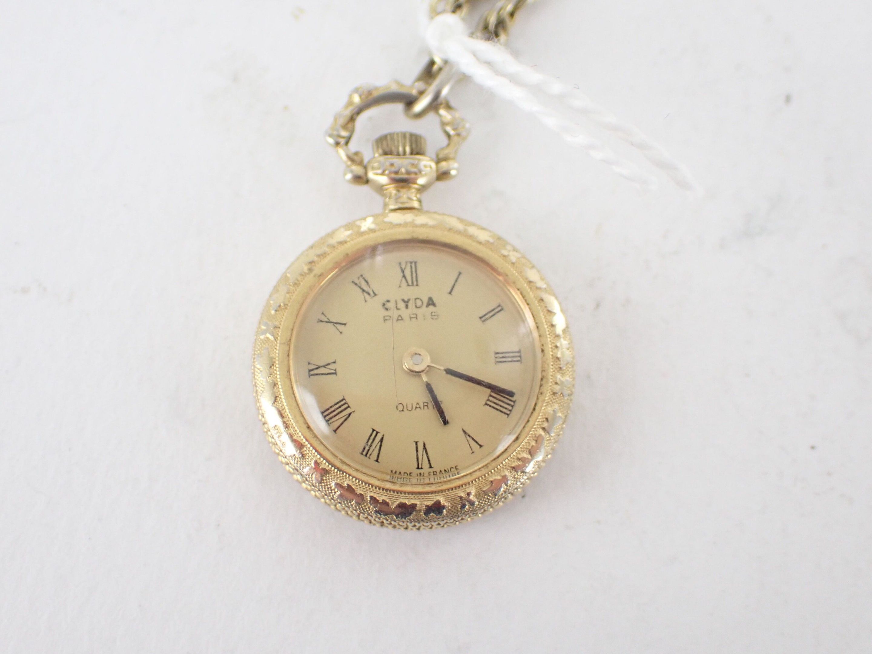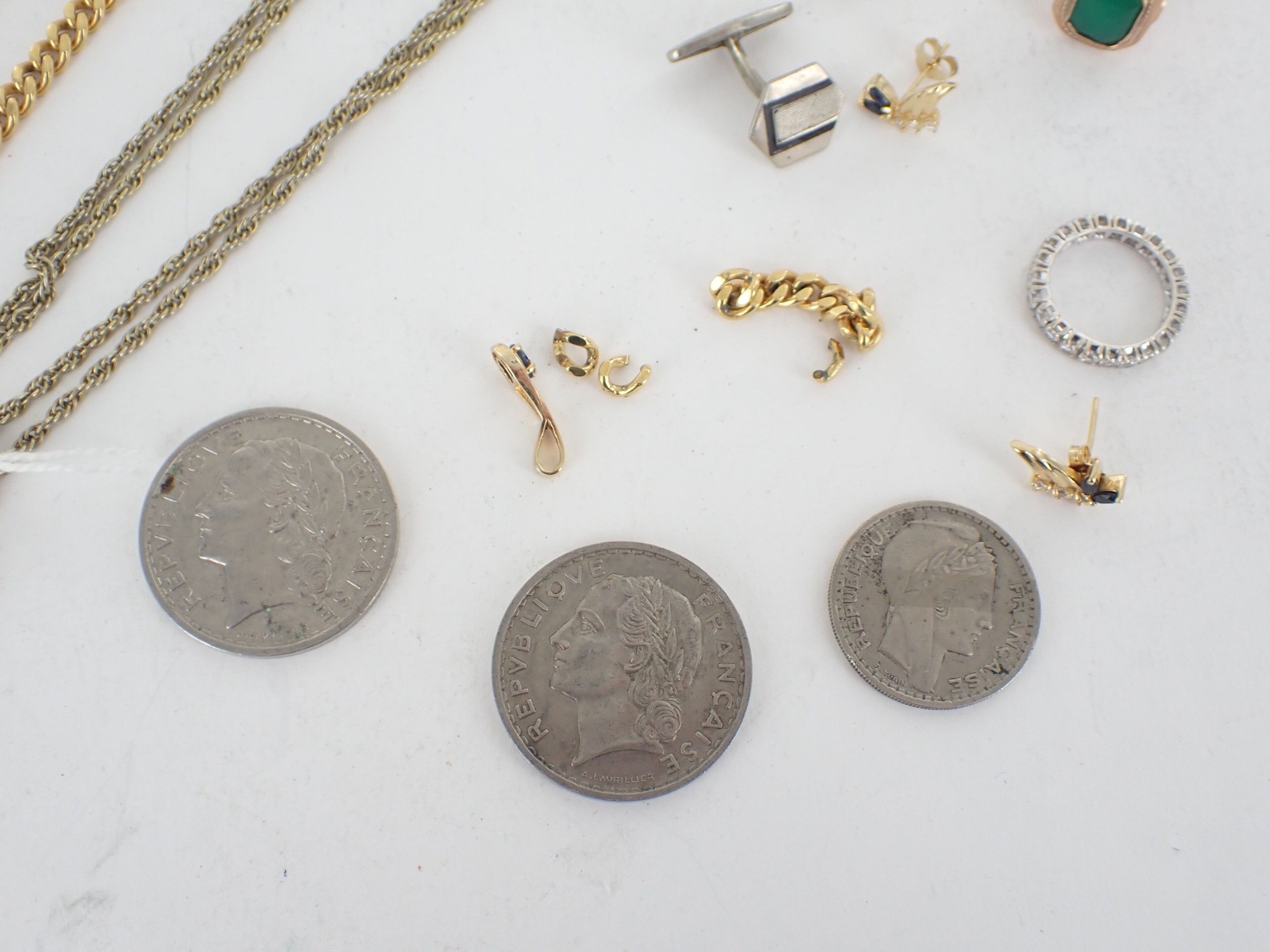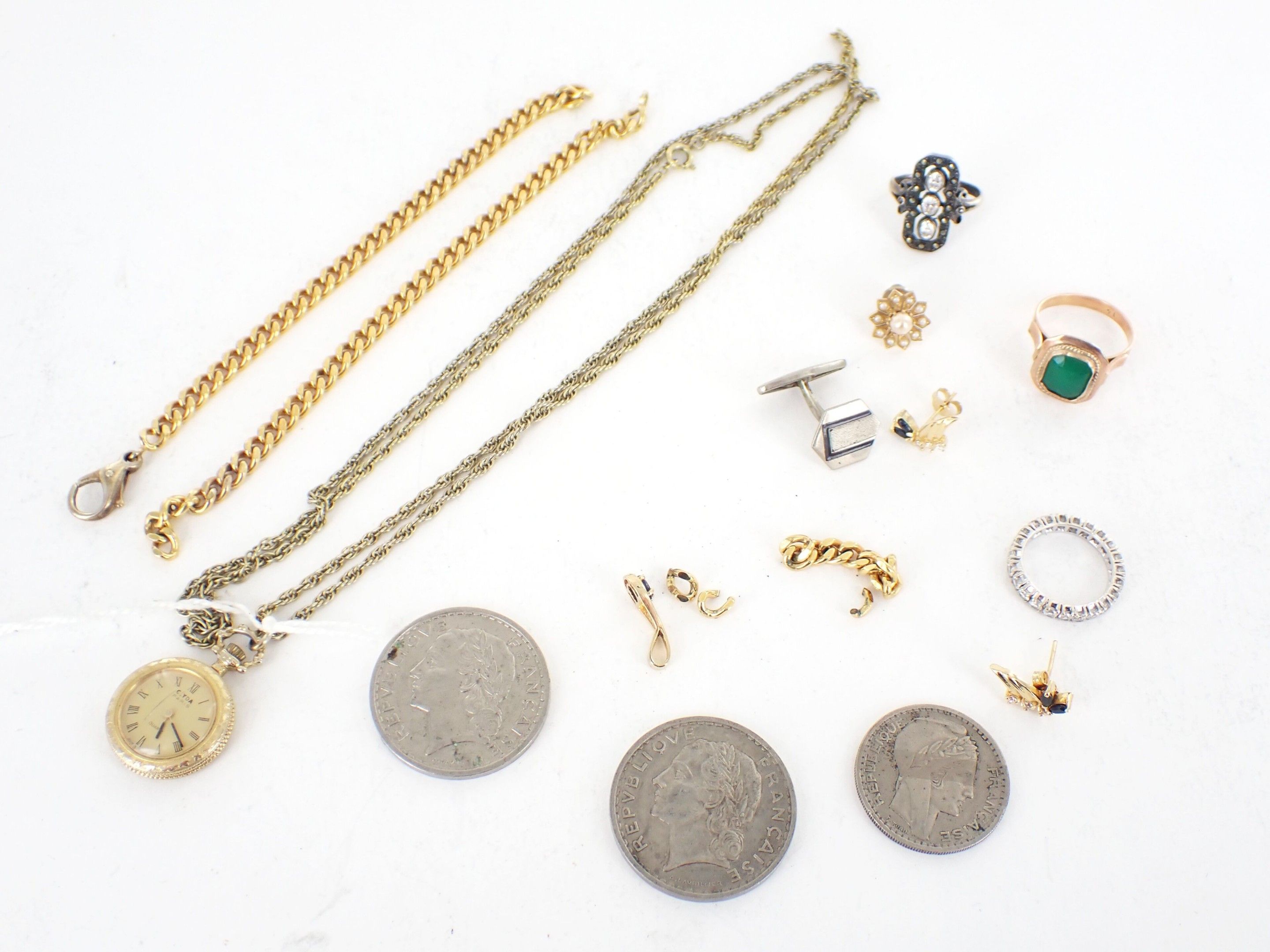 CLYDA Paris. Gold-plated collar watch and chain. Diameter: 2 cm - A piece of gold-plated chain - three rings - earrings - pendant - 2 5-franc coins and 1 10-franc coin.