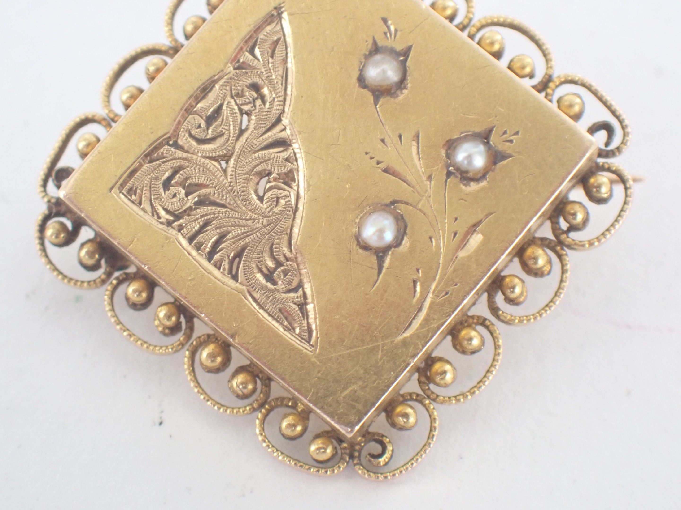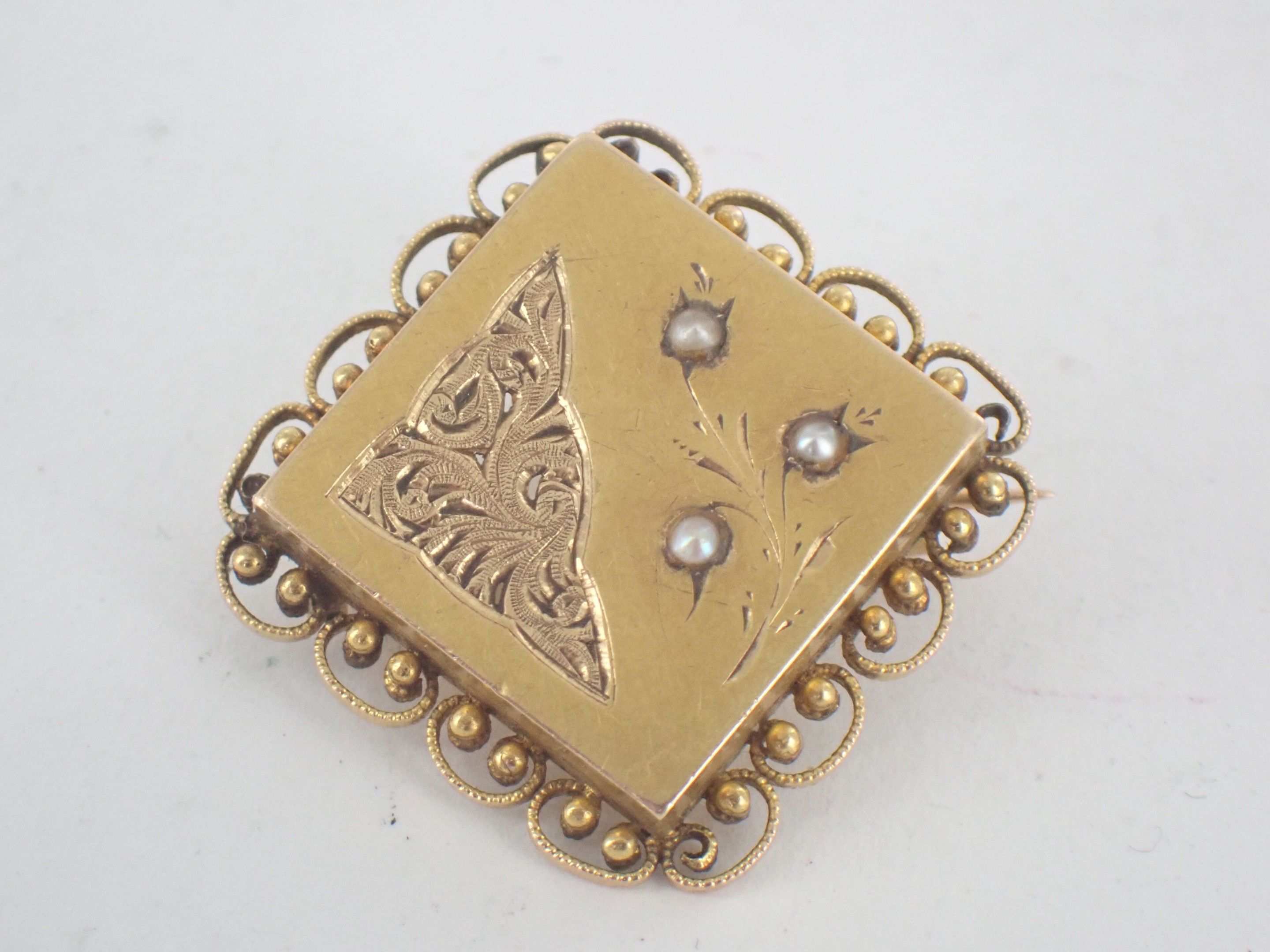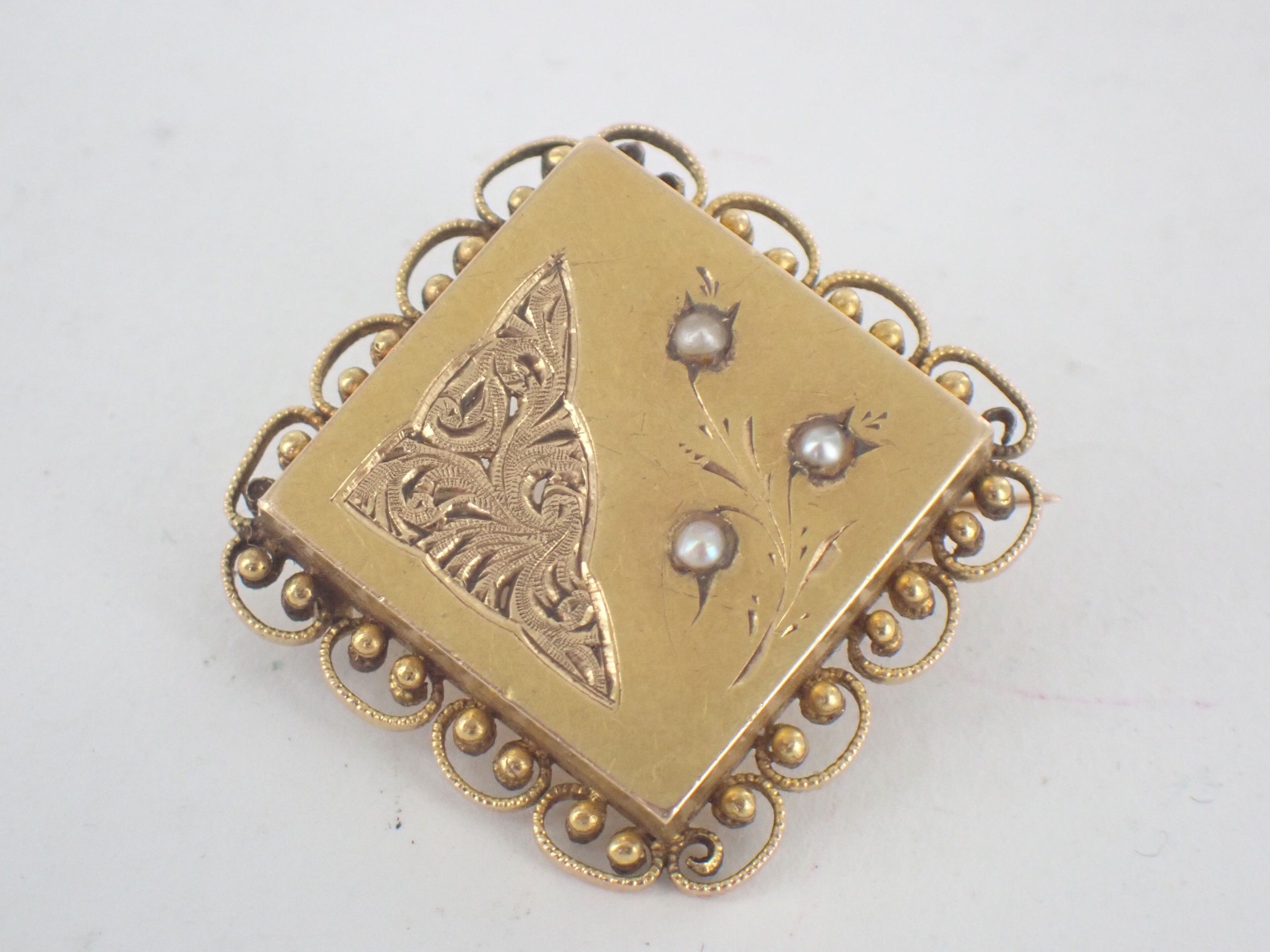 Late 19th century square brooch in 18 carat yellow gold, set with three half cultured pearls, with openwork decoration in grenetis and filigree.