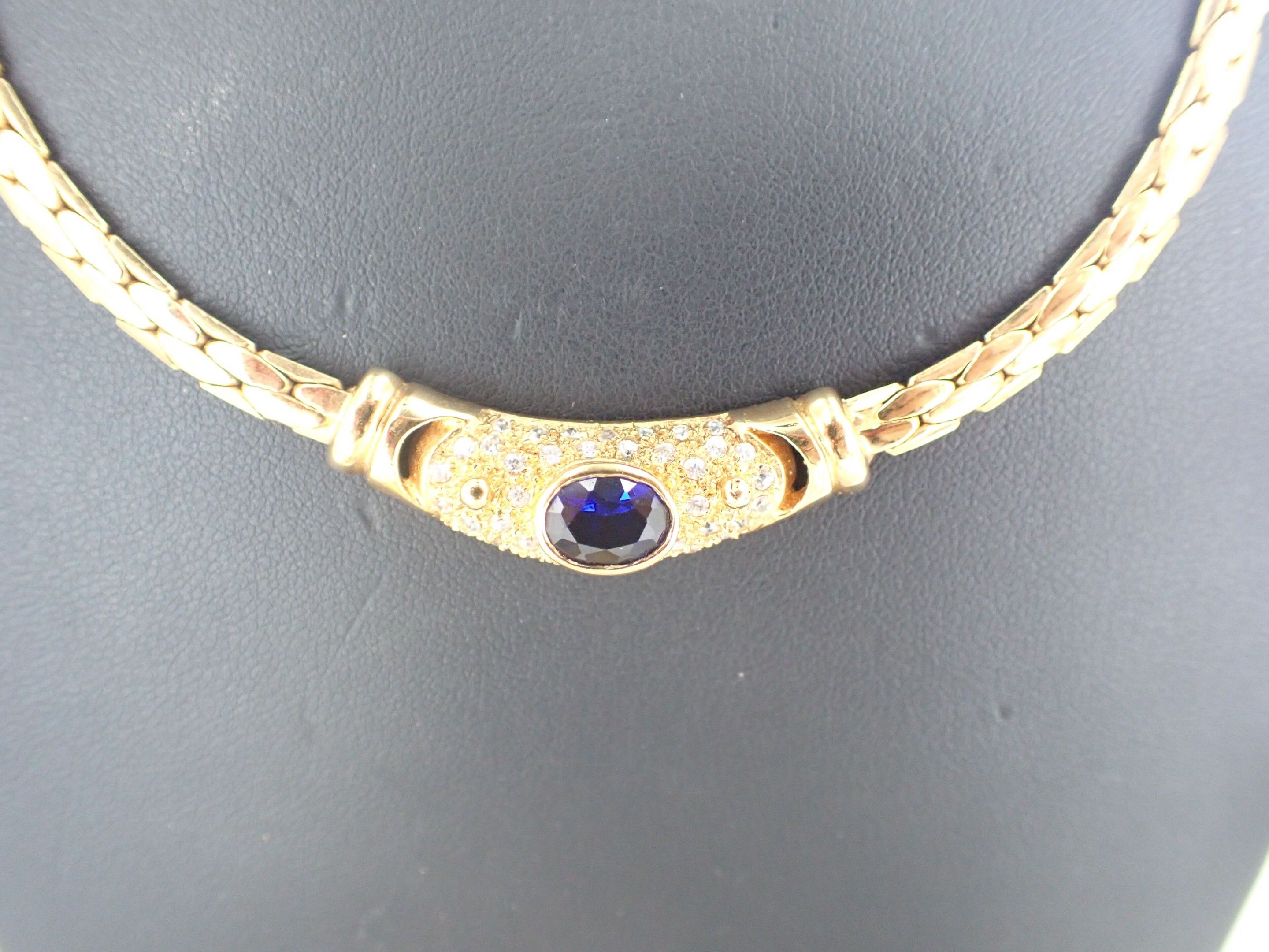 - A gold-plated necklace with a central blue stone