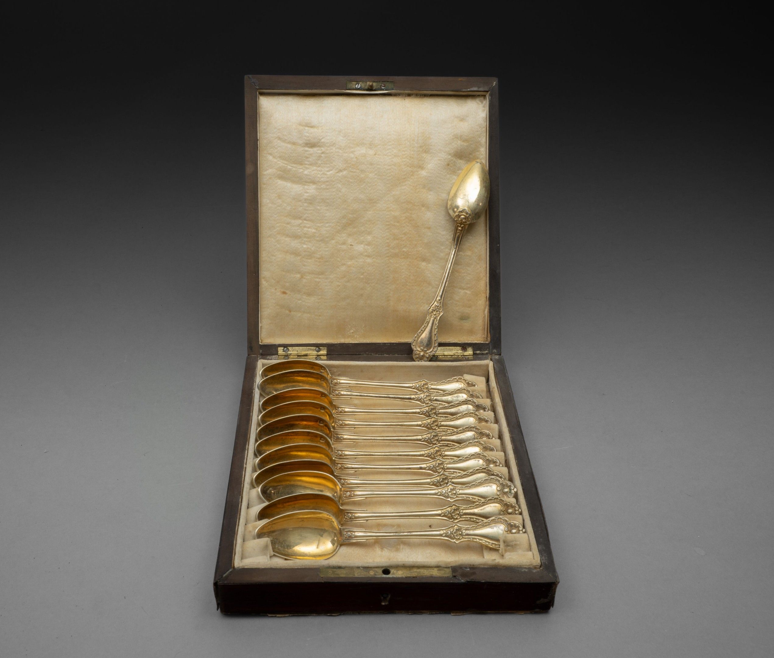 Twelve vermeil tea spoons, three-lobed violoné spatula, piriform cartouche encircled by rocaille, cabochon shell clasp on spoon attachment.