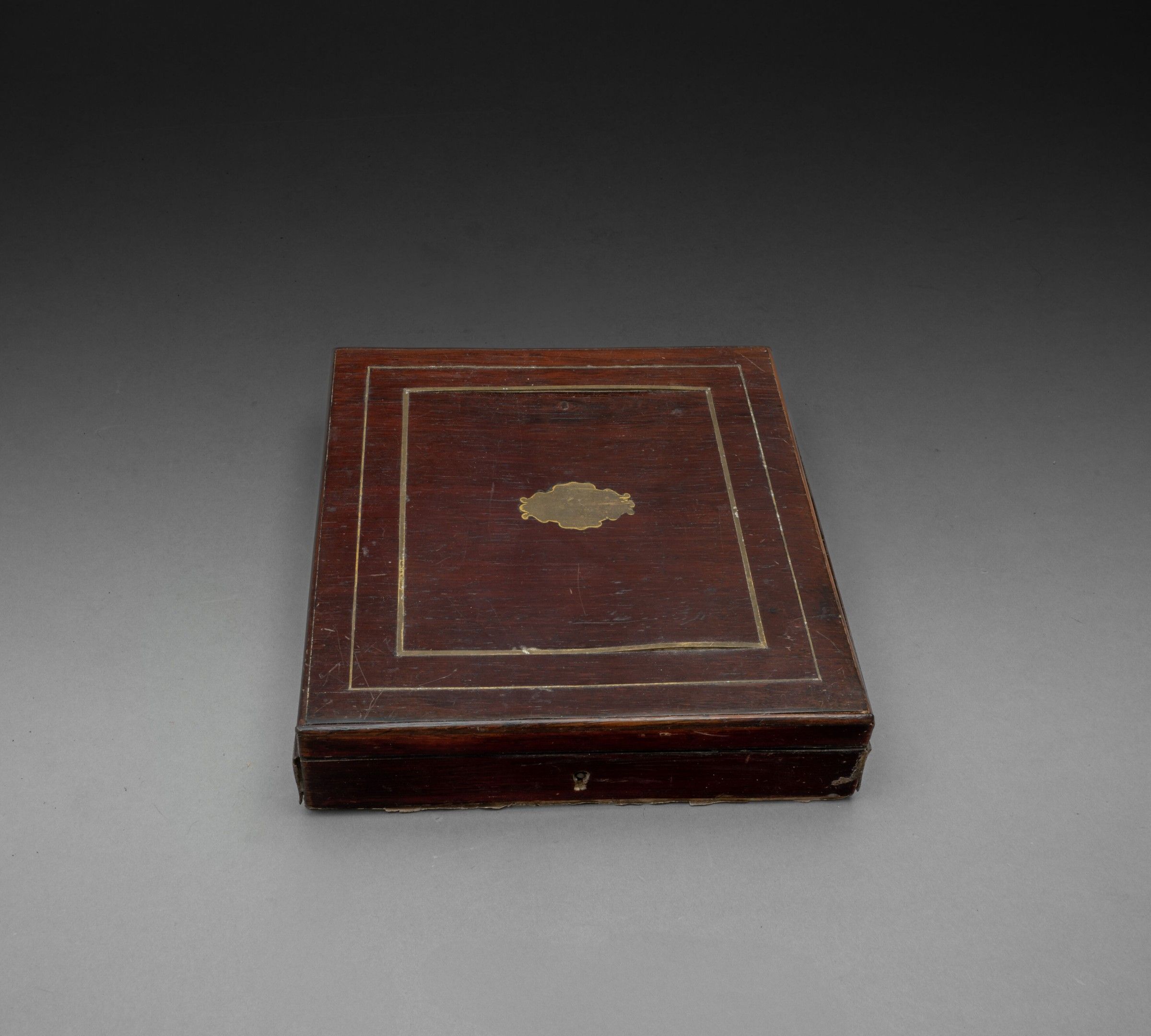 Rosewood case decorated with a cartouche and brass fillets, two fillets lifted and another very slightly, key missing, stains to the silk