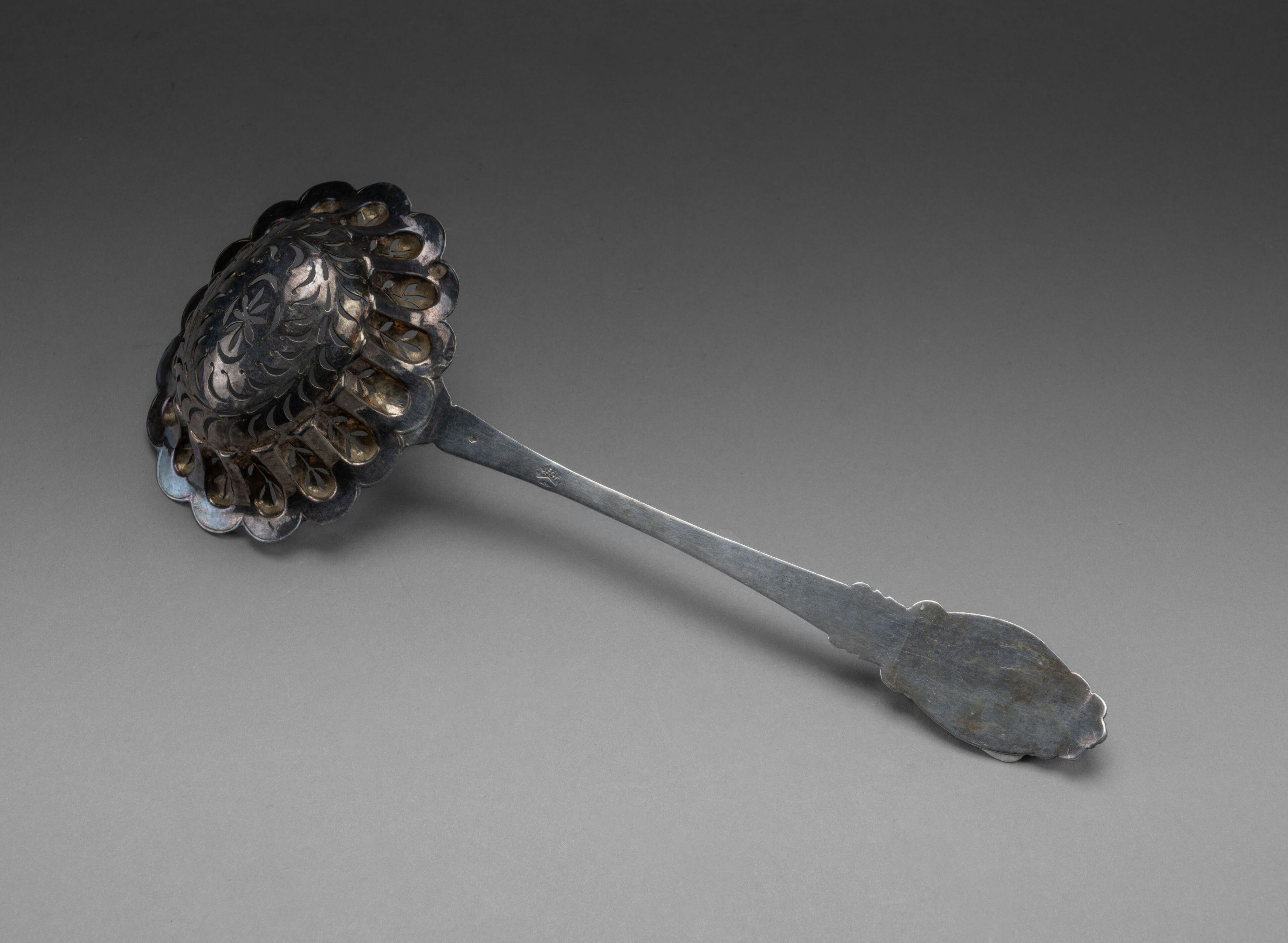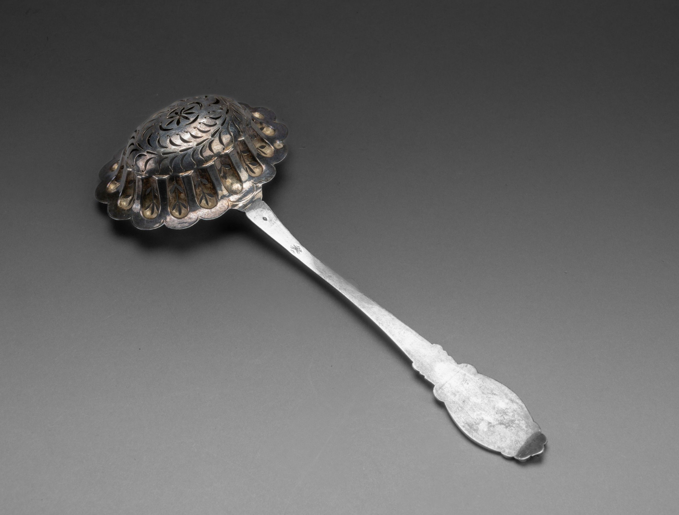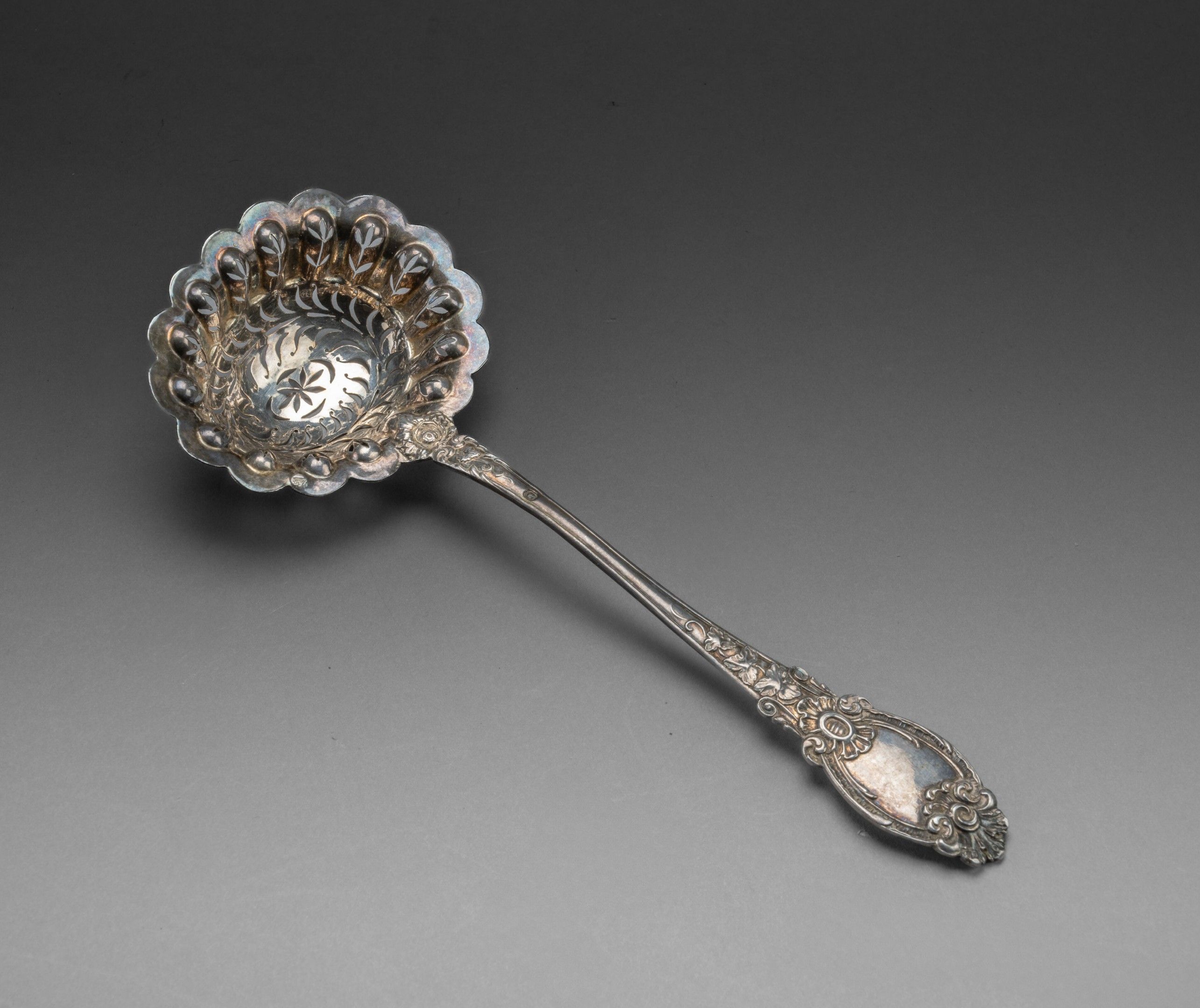 A silver sugar spoon with scalloped spoons and rounded ribs, pierced with foliage and teardrop motifs, spatula with oval cartouche and oval leaf clasps.
