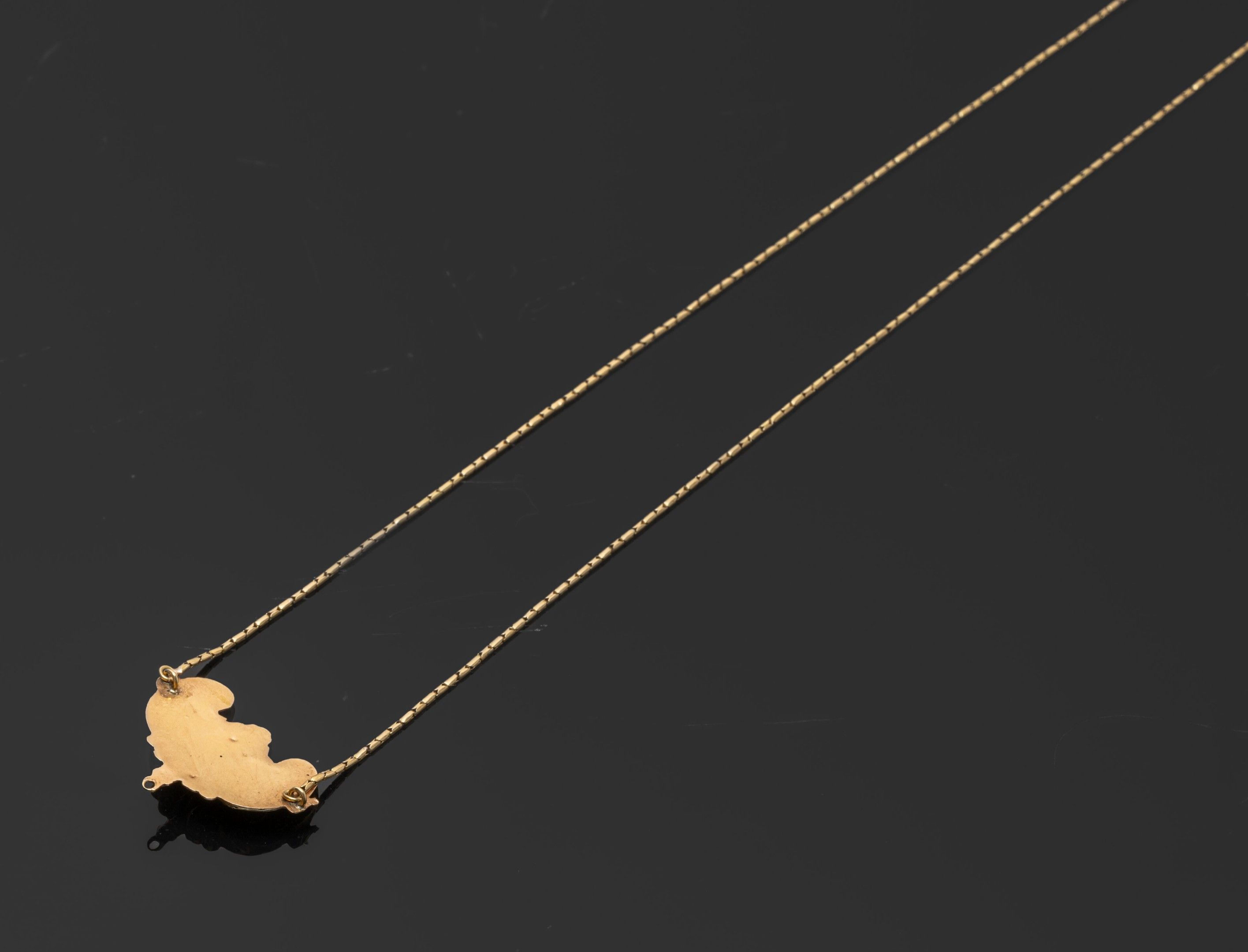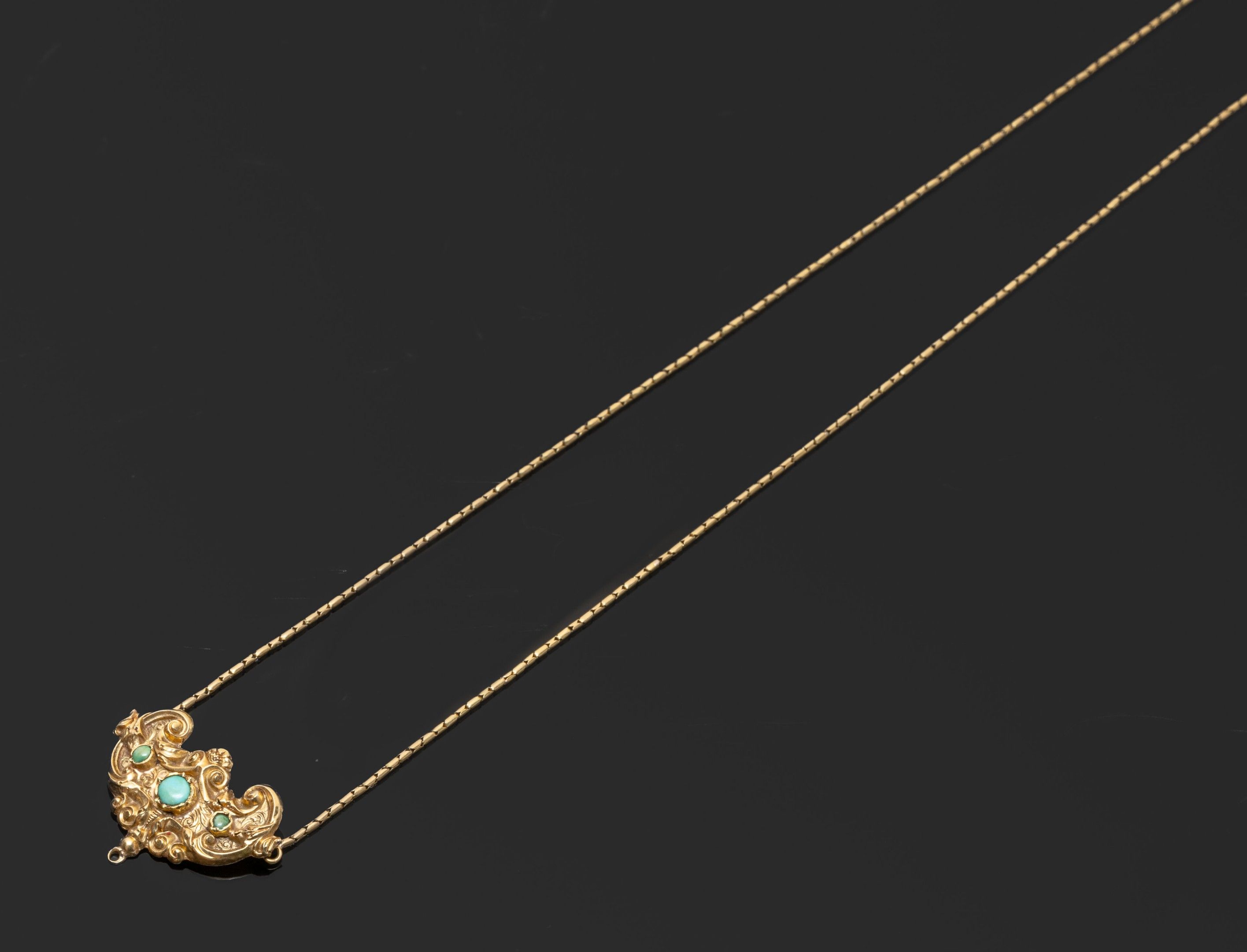 Antique necklace in 18K (750°/°°) yellow gold with fine column stitch, the central motif embossed with rocaille decoration embellished with turquoise cabochons (small dents on the back, place for pendant: missing). Missing stitches, accidents to the clasp held by the safety chain.