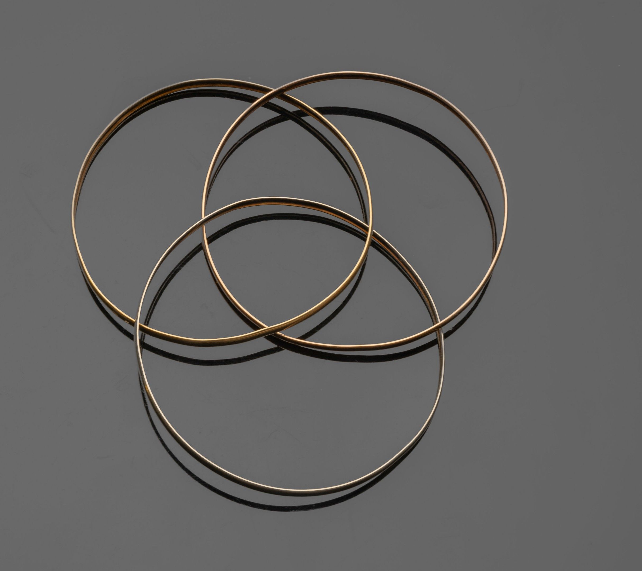 Trinity" type bracelet in 18K (750°/°°) three-tone gold composed of three intertwined smooth rigid rods