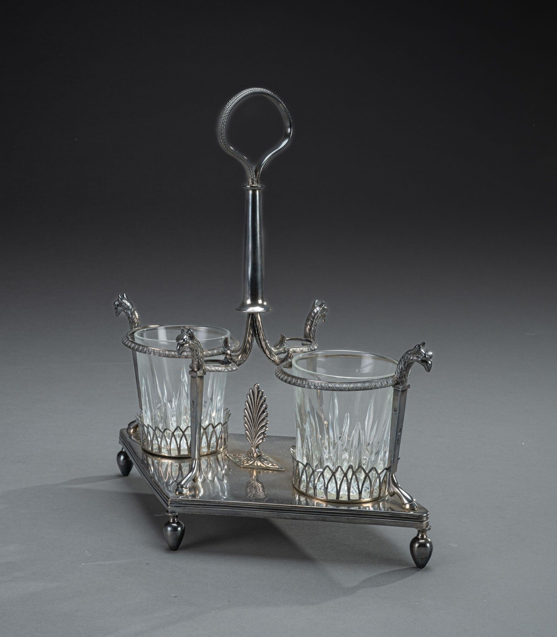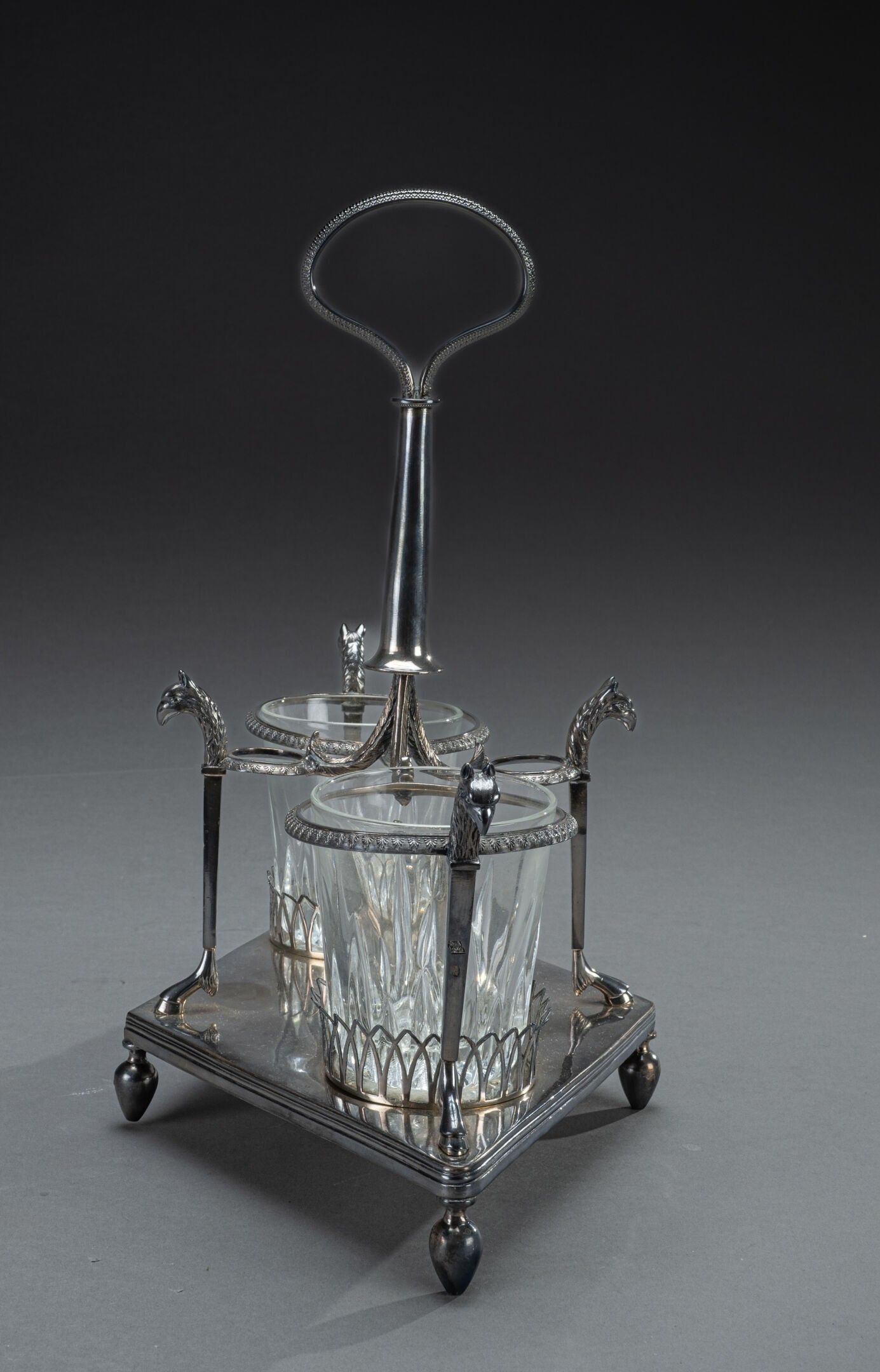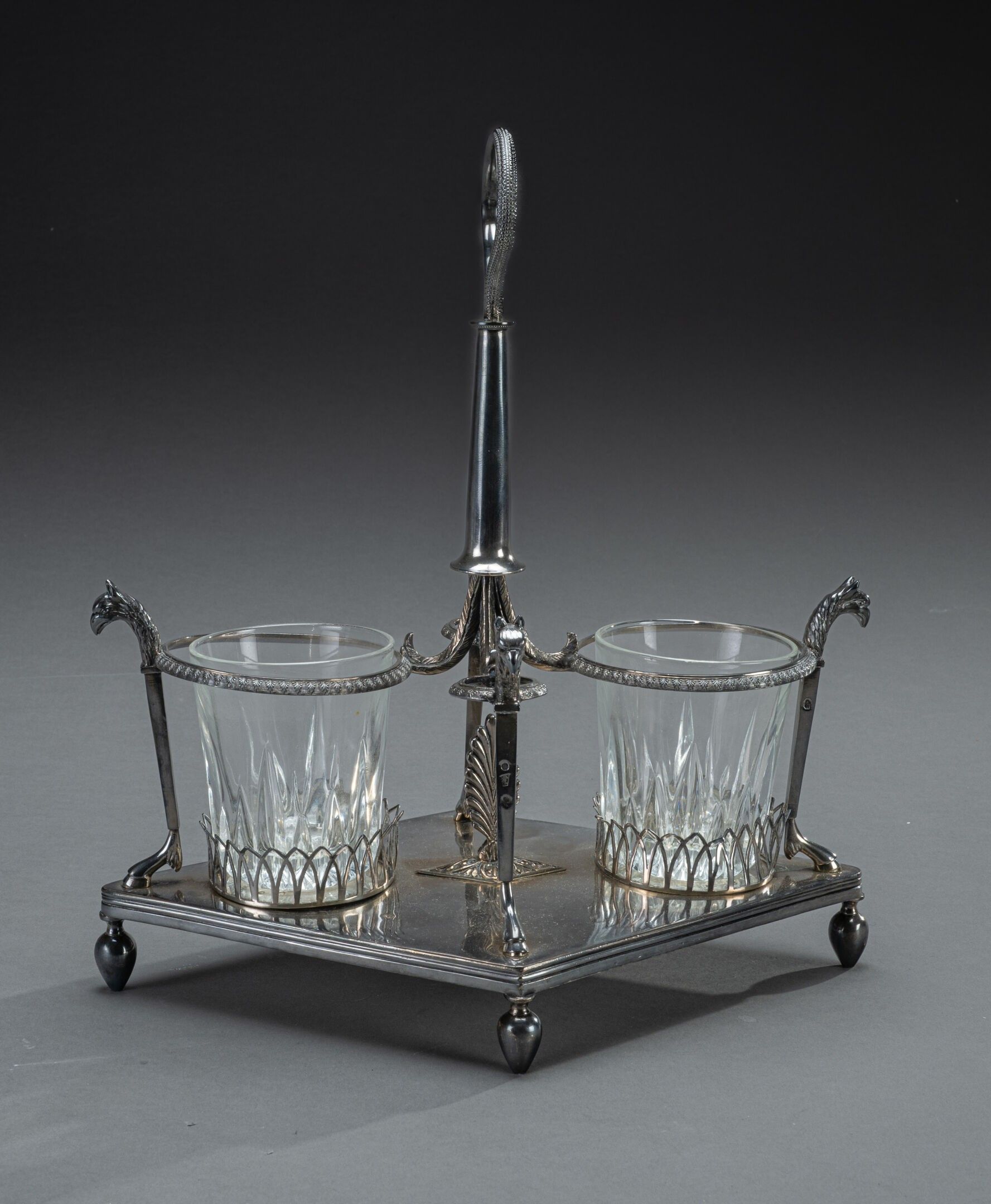 A silver oil and vinegar cruet on a diamond-shaped base with four pear-shaped feet, the bottle supports in the form of an openwork gallery, the uprights with griffon heads and a central palmette motif applied to the base.