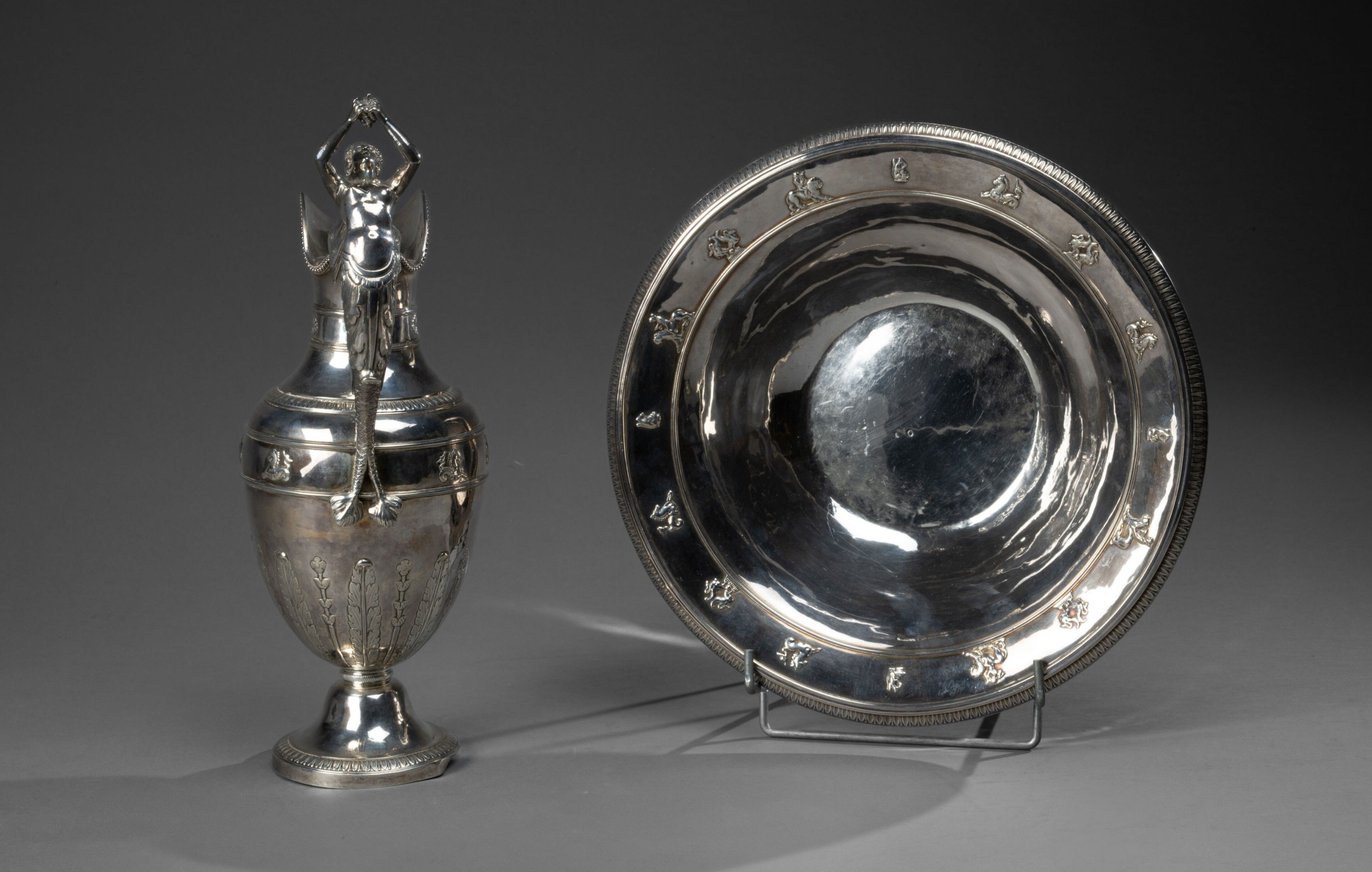 A silver ewer and its basin, the ewer with a pedestal moulded with water leaves, the body applied to the base with foliage and flowering stems and a band applied with the symbols of the zodiac, the stopper in the form of a swan, very beautiful handle in the form of a term of zephyr with a bunch of grapes, the body engraved FC, the round basin with a threaded edge with the same decoration.