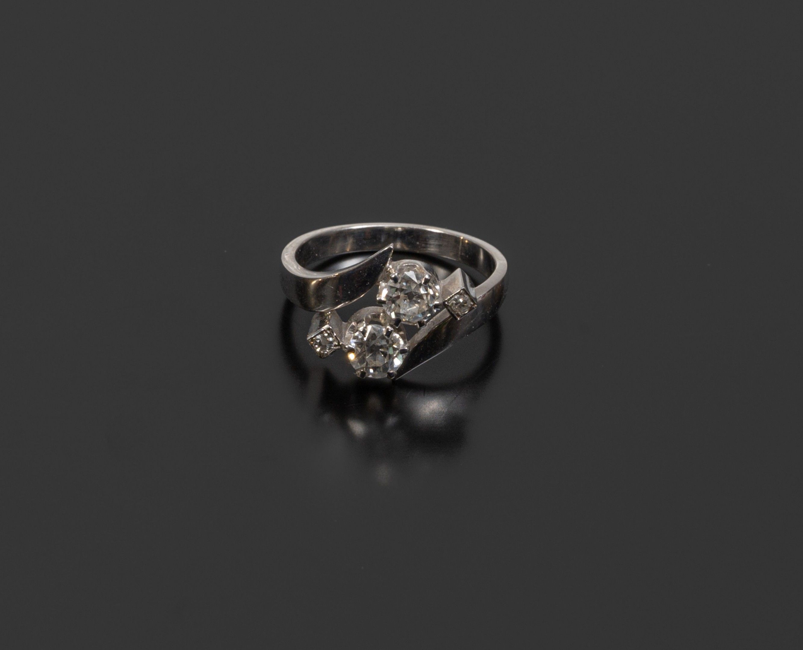Smooth 18K (750°/°°) white gold "Toi et Moi" ring set with two old-cut diamonds each approx. 0.35 ct and two smaller 8x8 diamonds (one chip)