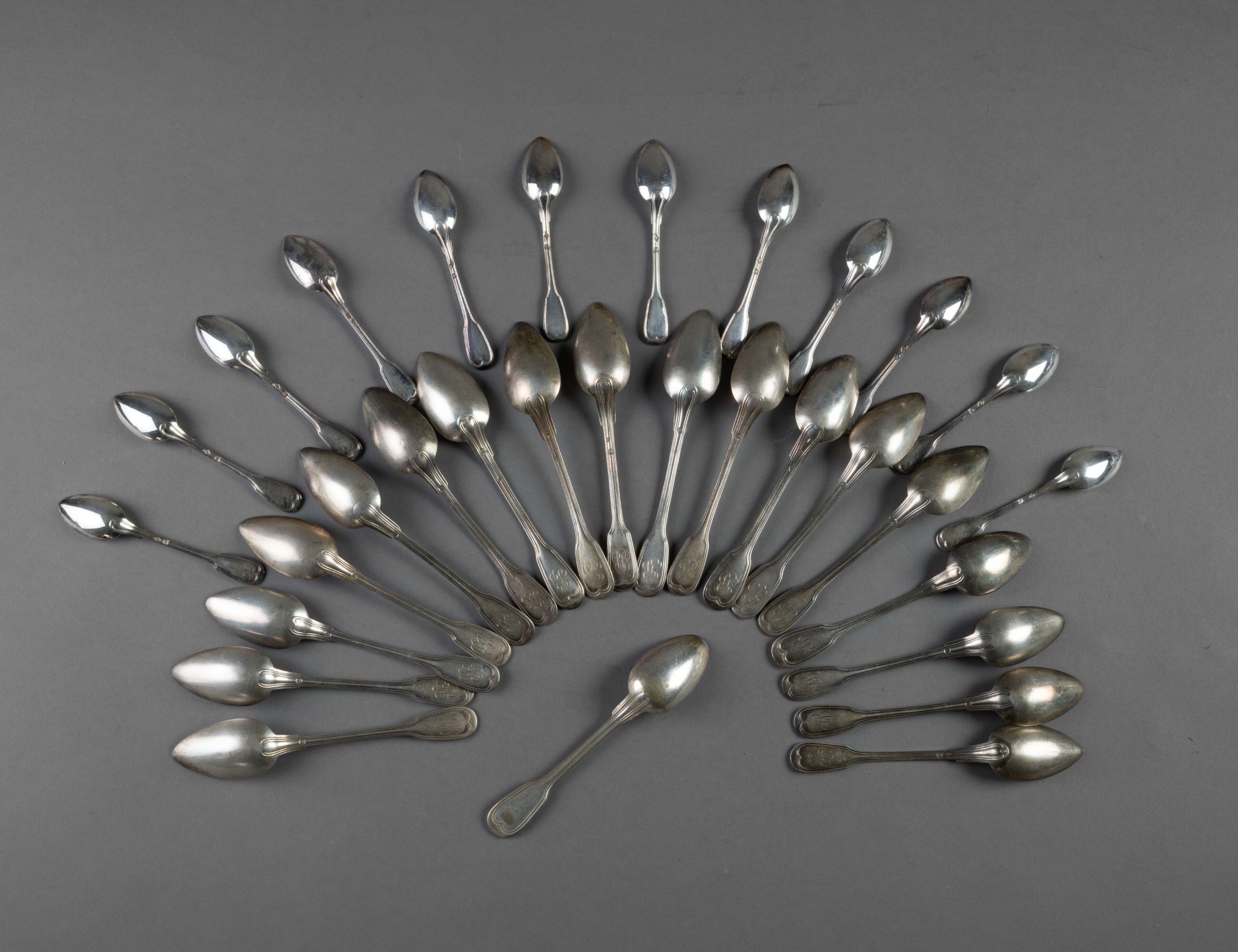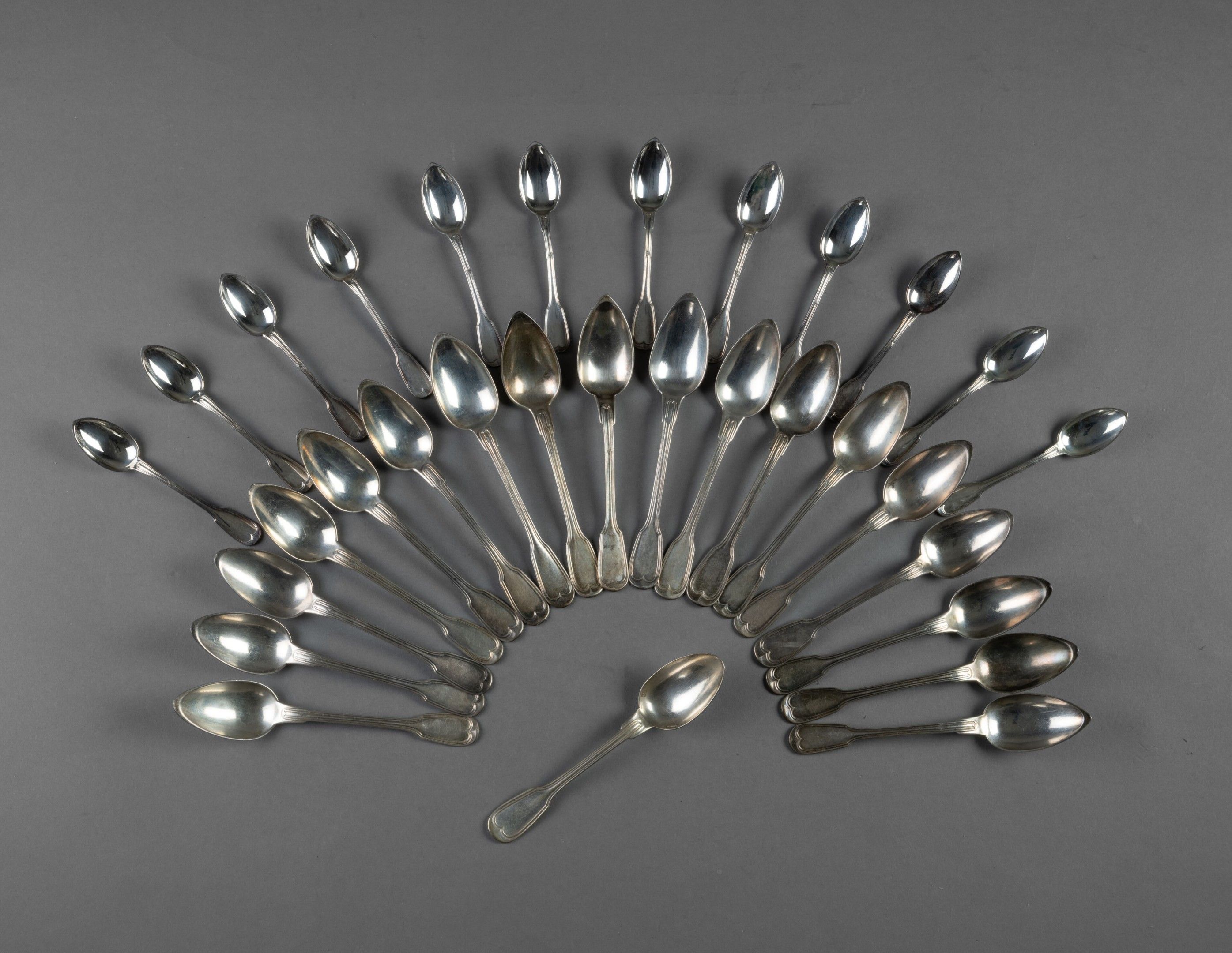 - Eighteen silver teaspoons or coffee spoons of the filet model with shoulder, some differences, figured.