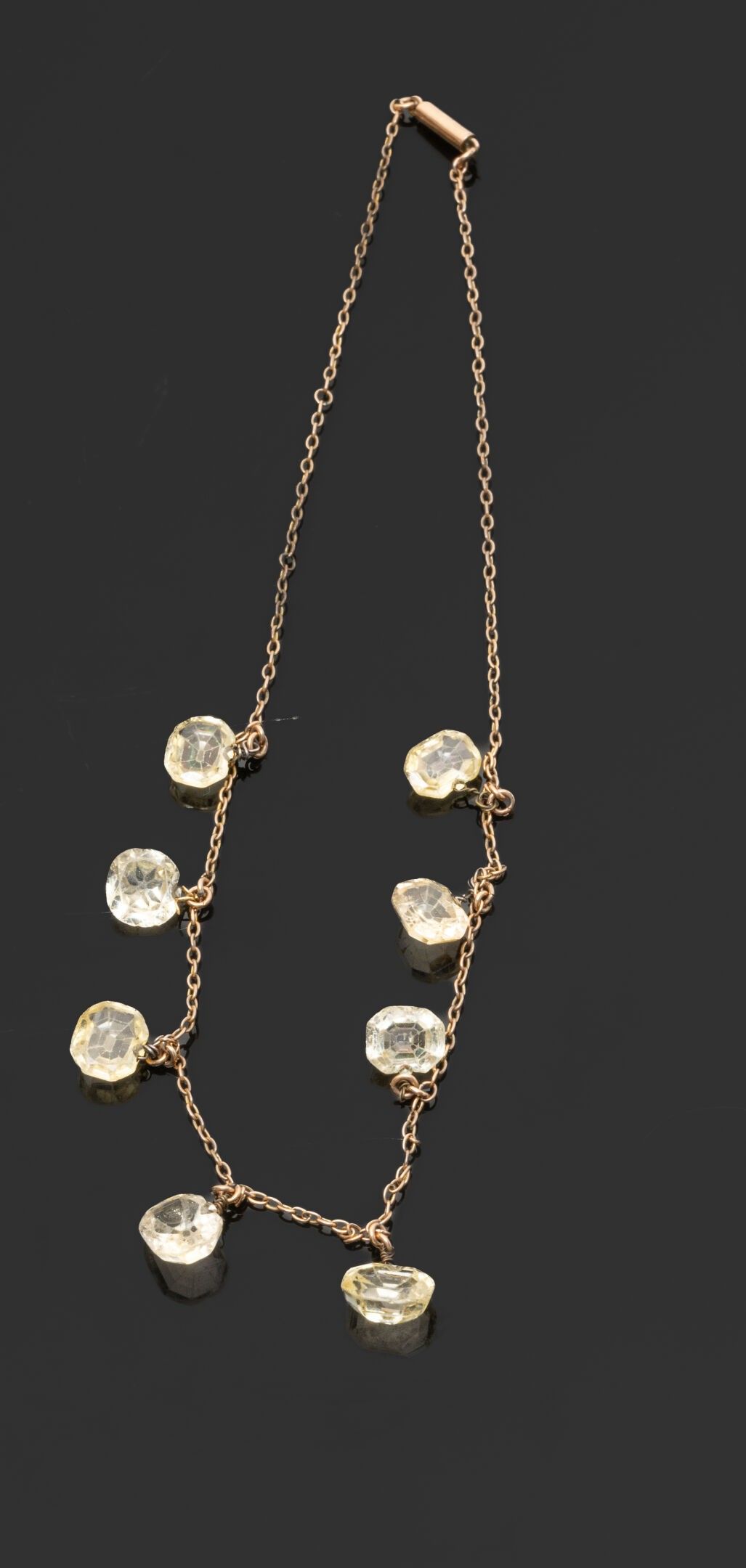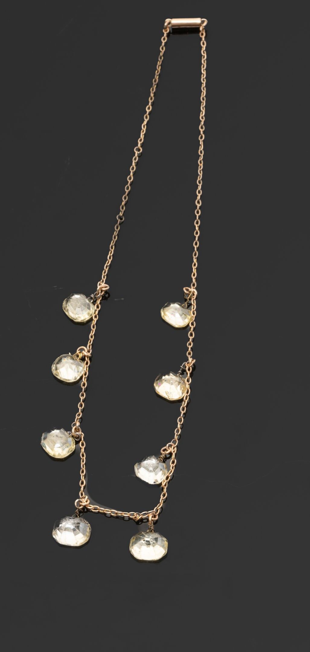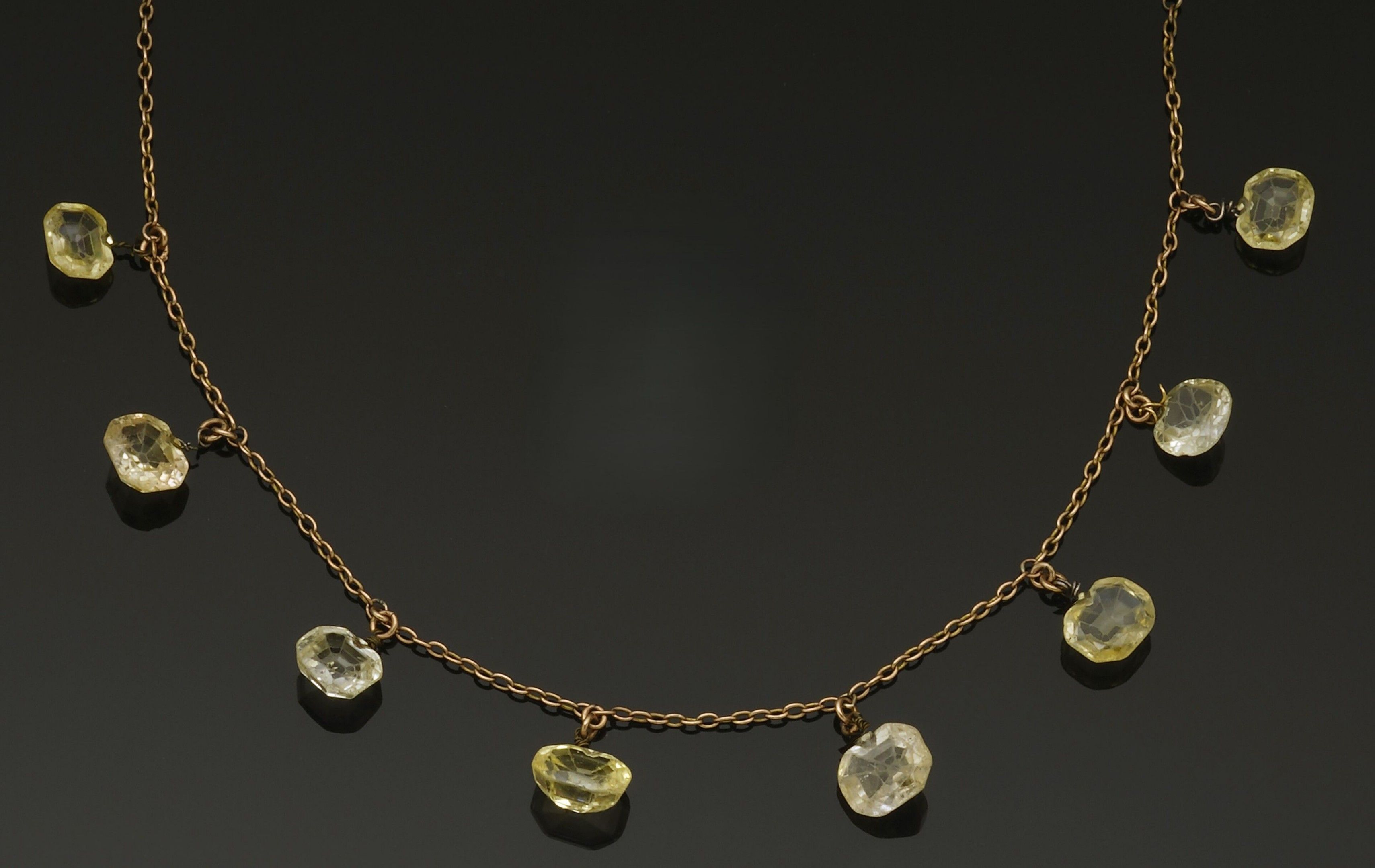 Necklace in 14K (585°/°°) yellow gold with oval and round links set with pendants of eight rectangular cut and cushion yellow sapphires (edges worn, slightly chipped and chipped, holes for wire-setting), the main one approx. 4.70 carats and the smallest approx. 2.30 carats.