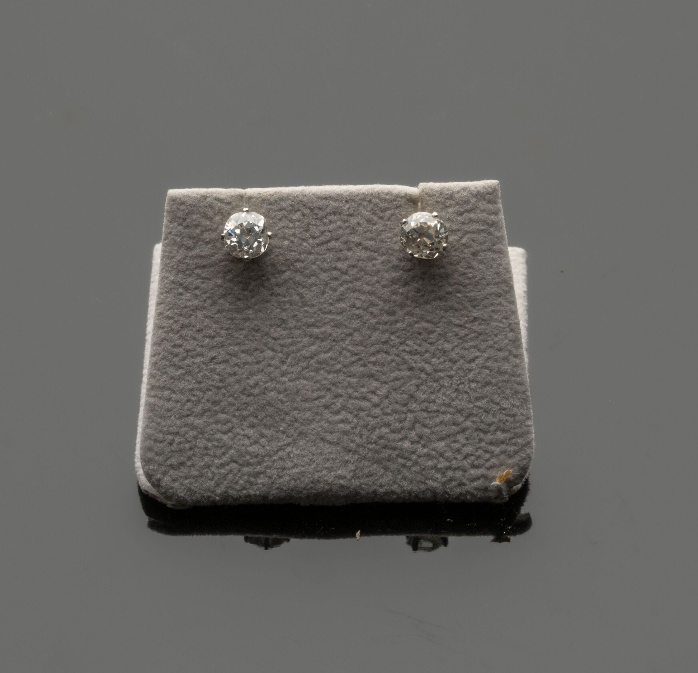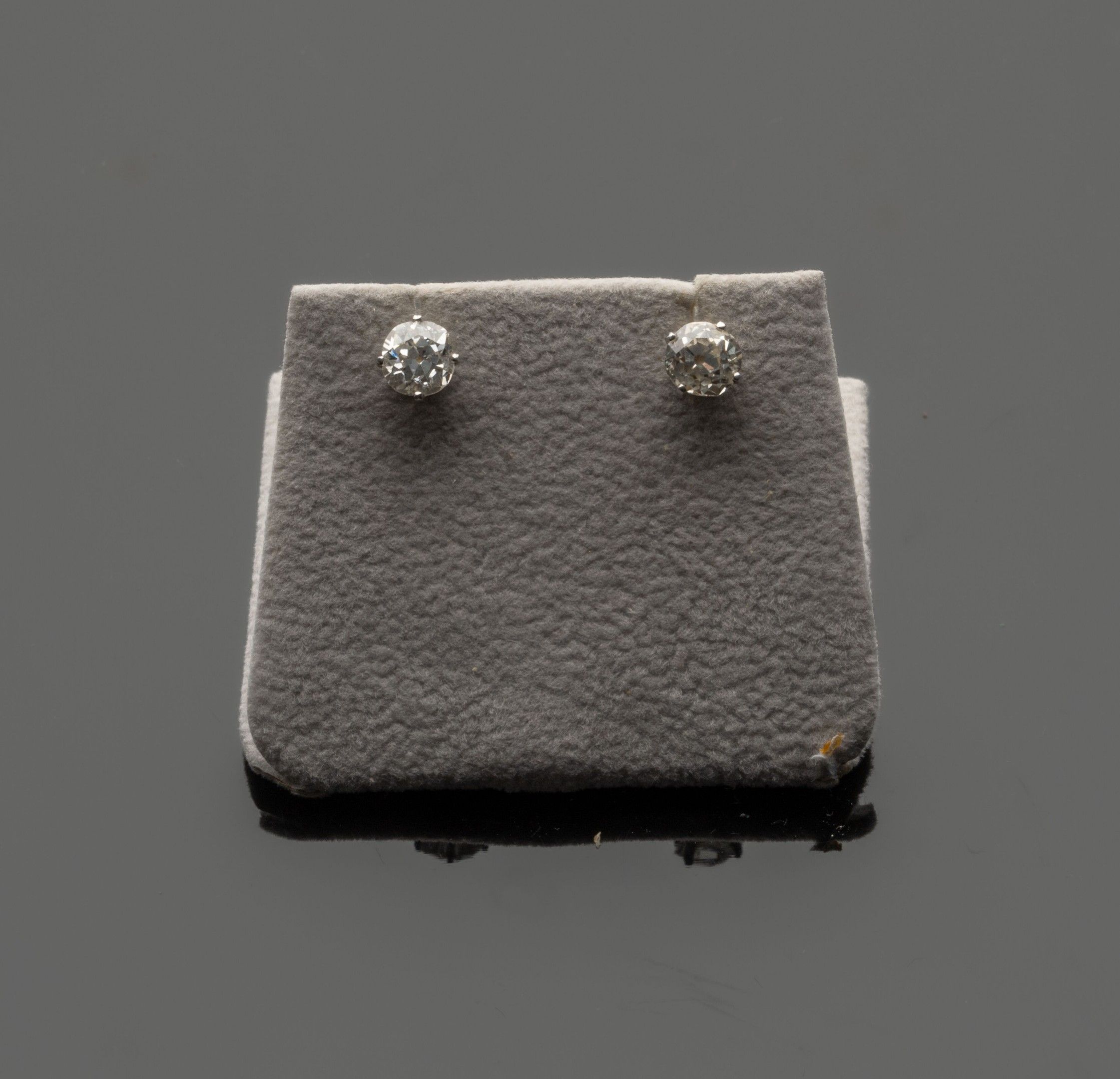 Pair of 18K (750°/°°) white gold stud earrings each set with a slightly cushion-shaped old-cut diamond, approx. 0.60 ct, in a 4-prong setting. ALPA clasp system