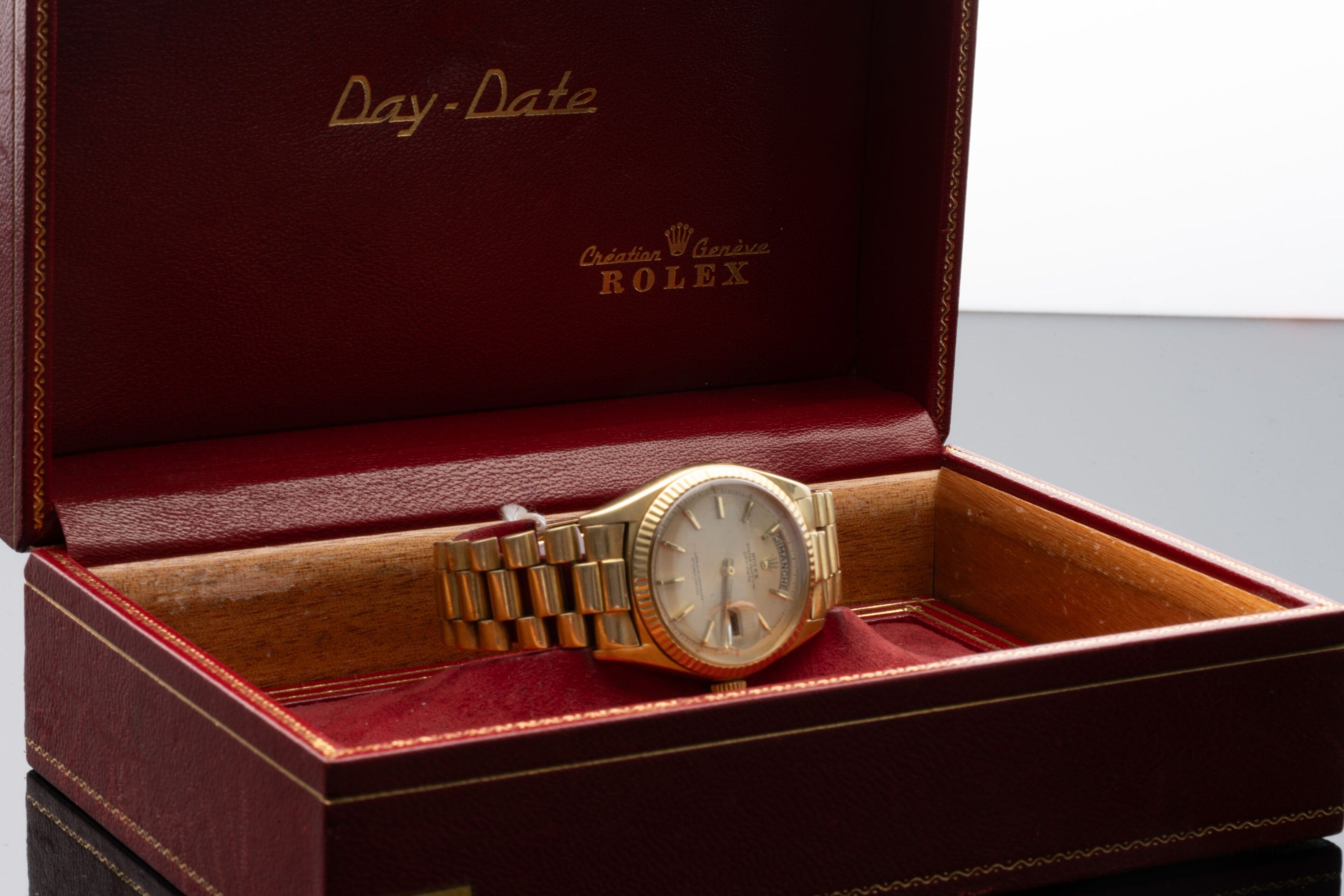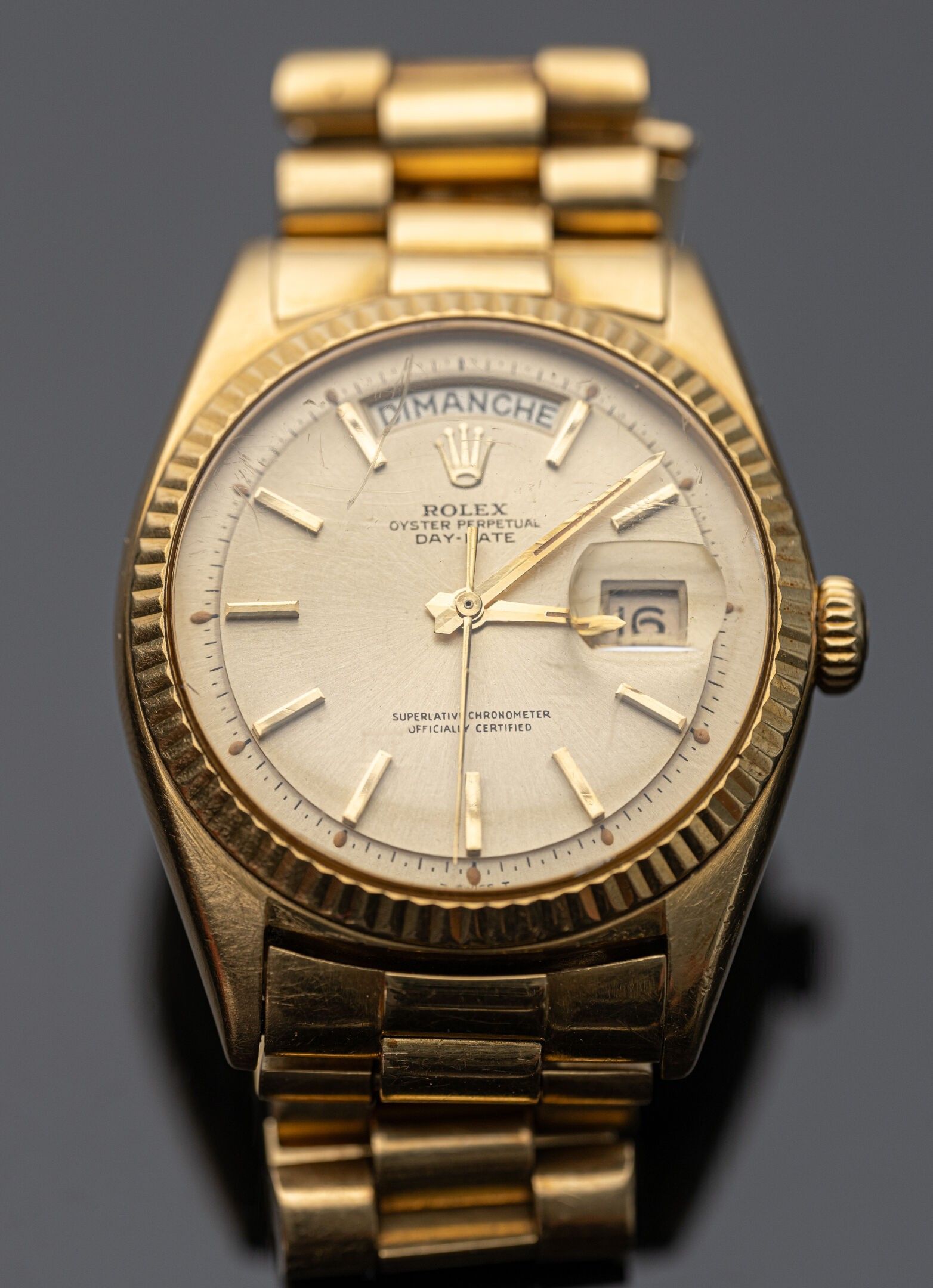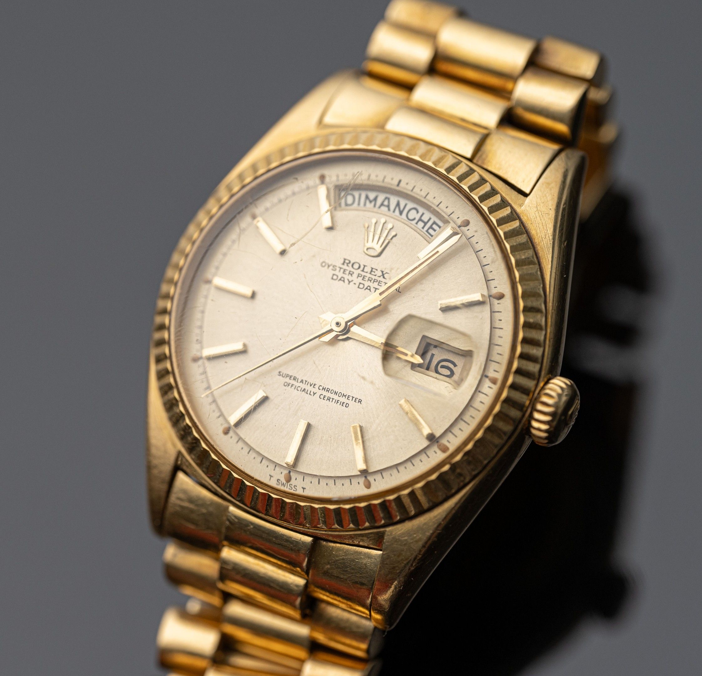 Watch in 18K (750°/°°) yellow gold, "Oyster Perpetual Day-Date" collection, reference 1803, crenellated bezel, round dial with gilded background (slight pitting), applied baton hour markers, central second hand, day of the week aperture at 12 o'clock and day of the month aperture at 3 o'clock, self-winding mechanical movement (calibre 1555: signed and numbered). Back signed and numbered (water-resistance needs to be checked as the gasket has dried). President" bracelet with 3 rows of articulated links in 18K (750°/°°) yellow gold and 18K (750°/°°) yellow gold folding clasp. Scratched glass, folding clasp personalised with the name of the first owner.