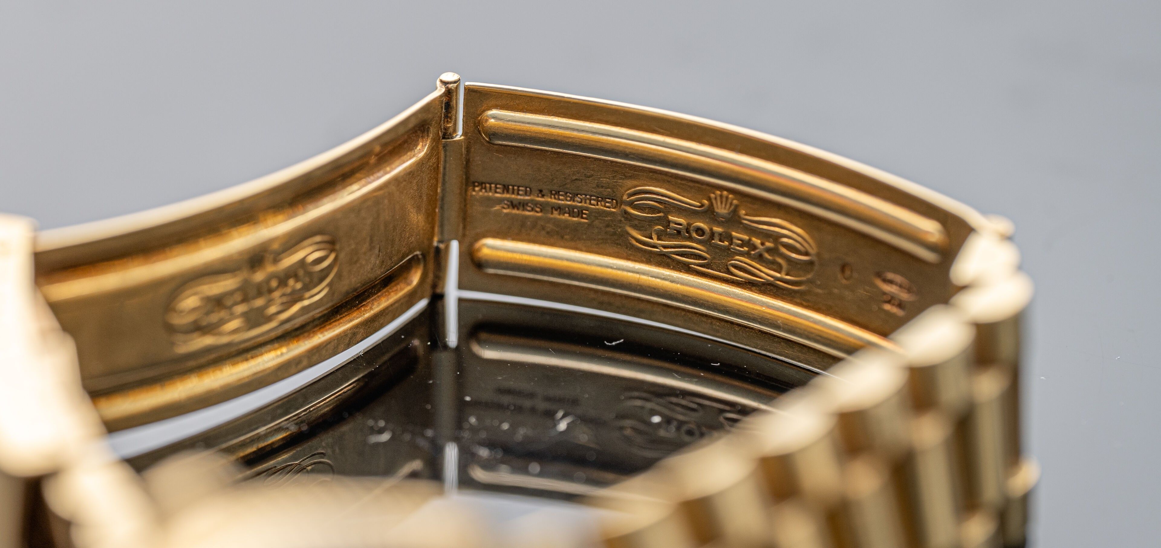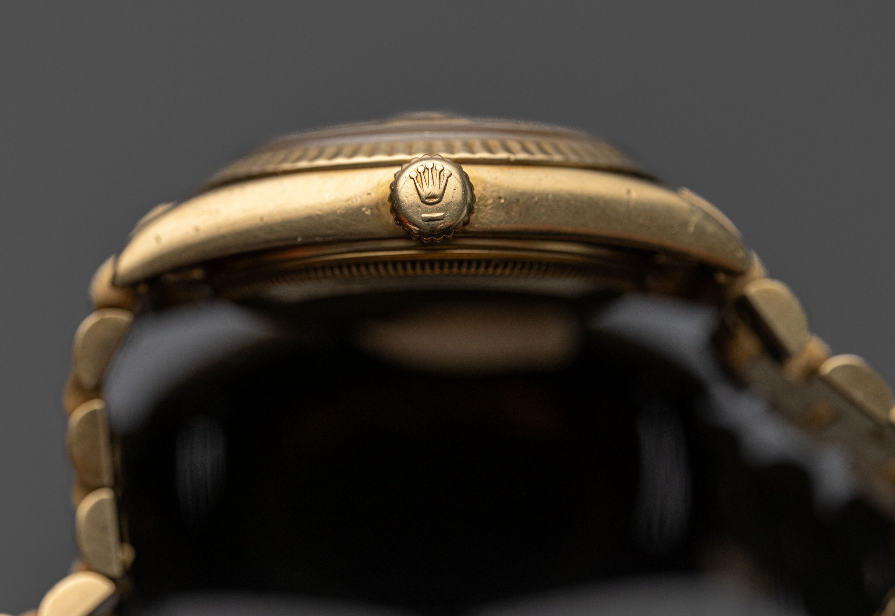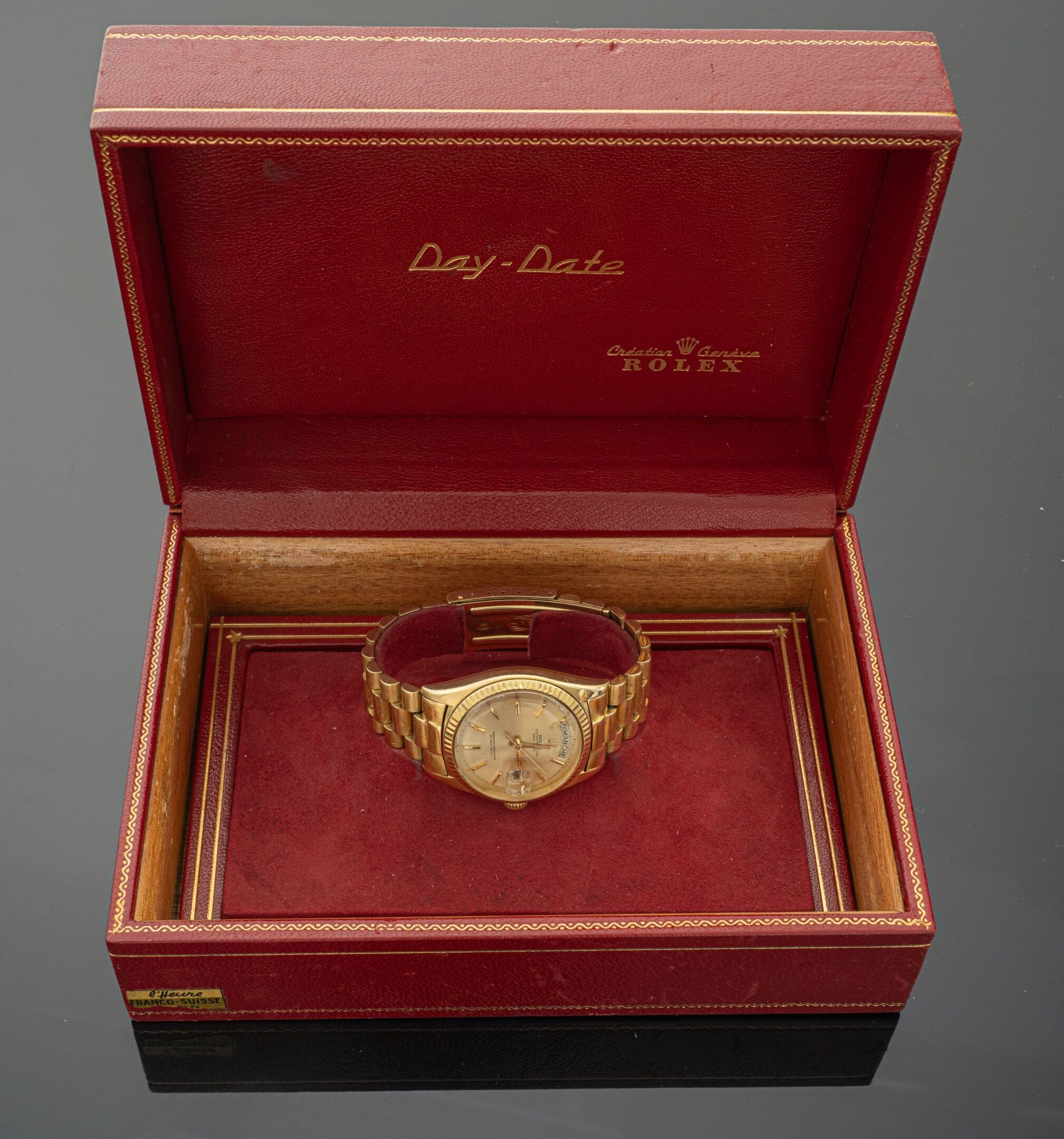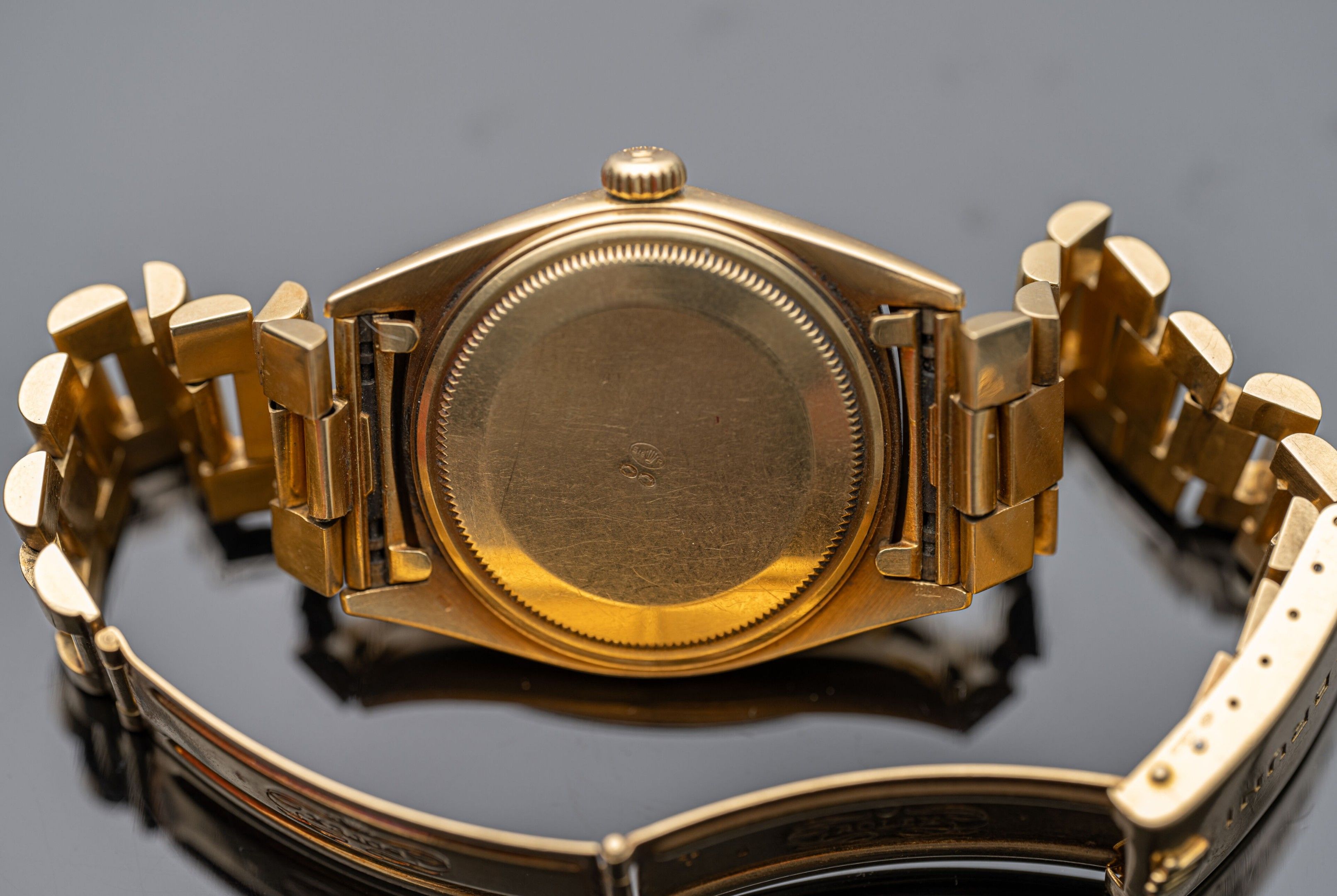 Watch in 18K (750°/°°) yellow gold, "Oyster Perpetual Day-Date" collection, reference 1803, crenellated bezel, round dial with gilded background (slight pitting), applied baton hour markers, central second hand, day of the week aperture at 12 o'clock and day of the month aperture at 3 o'clock, self-winding mechanical movement (calibre 1555: signed and numbered). Back signed and numbered (water-resistance needs to be checked as the gasket has dried). President" bracelet with 3 rows of articulated links in 18K (750°/°°) yellow gold and 18K (750°/°°) yellow gold folding clasp. Scratched glass, folding clasp personalised with the name of the first owner.