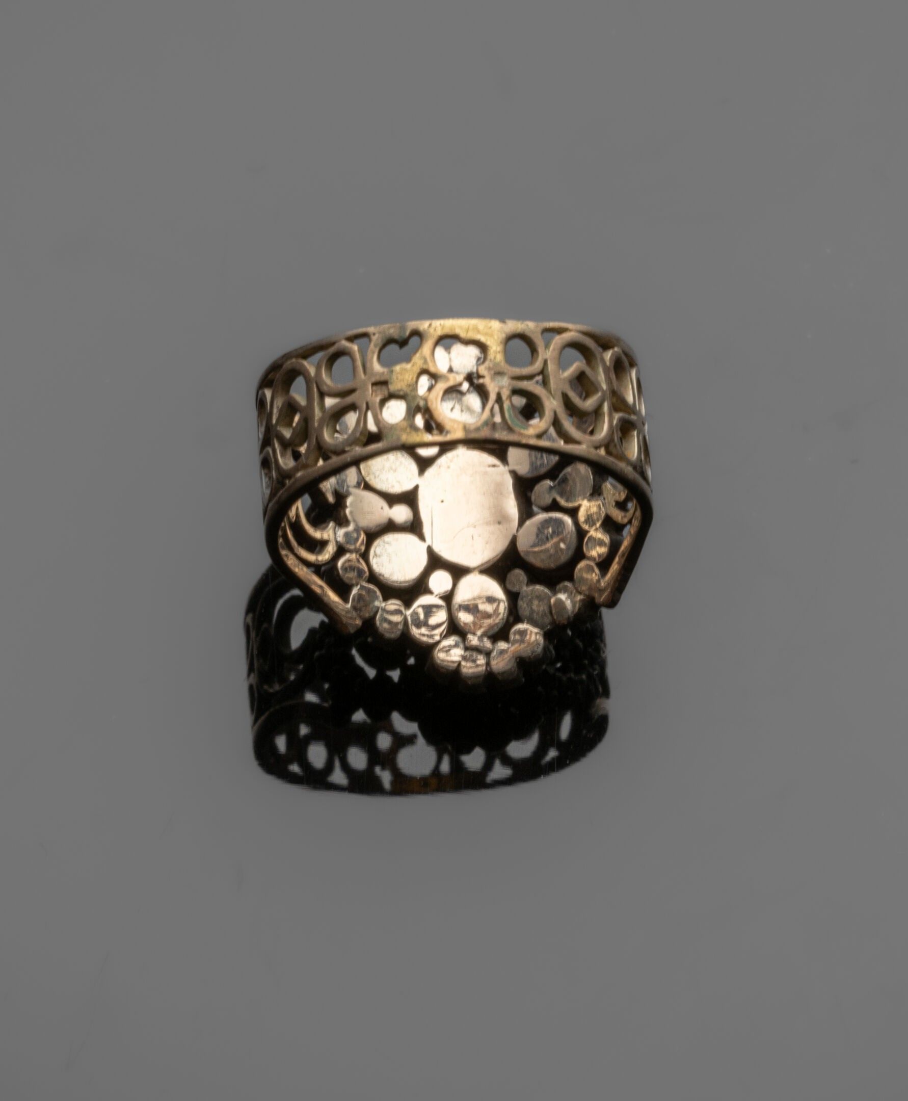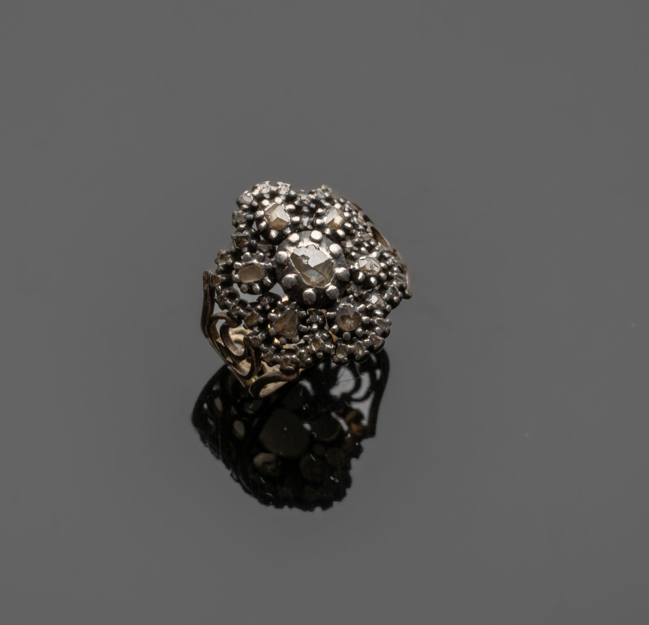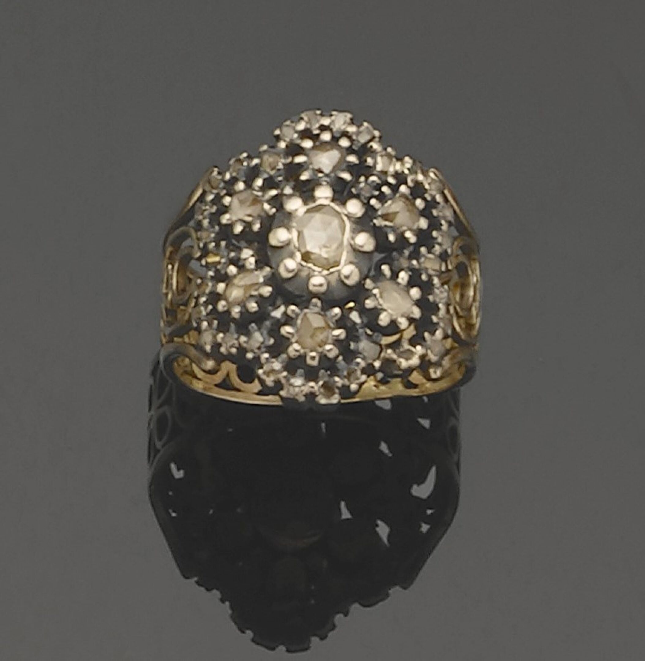 Antique ring in low-titanium gold (hallmarked "E.T"), the wide ring finely openworked with interlacing (minor accidents, worn), holds a plate, forming an openwork rosette, set in silver (800°/°°), with rose-cut diamonds, including crowned diamonds (minor accidents, one missing).