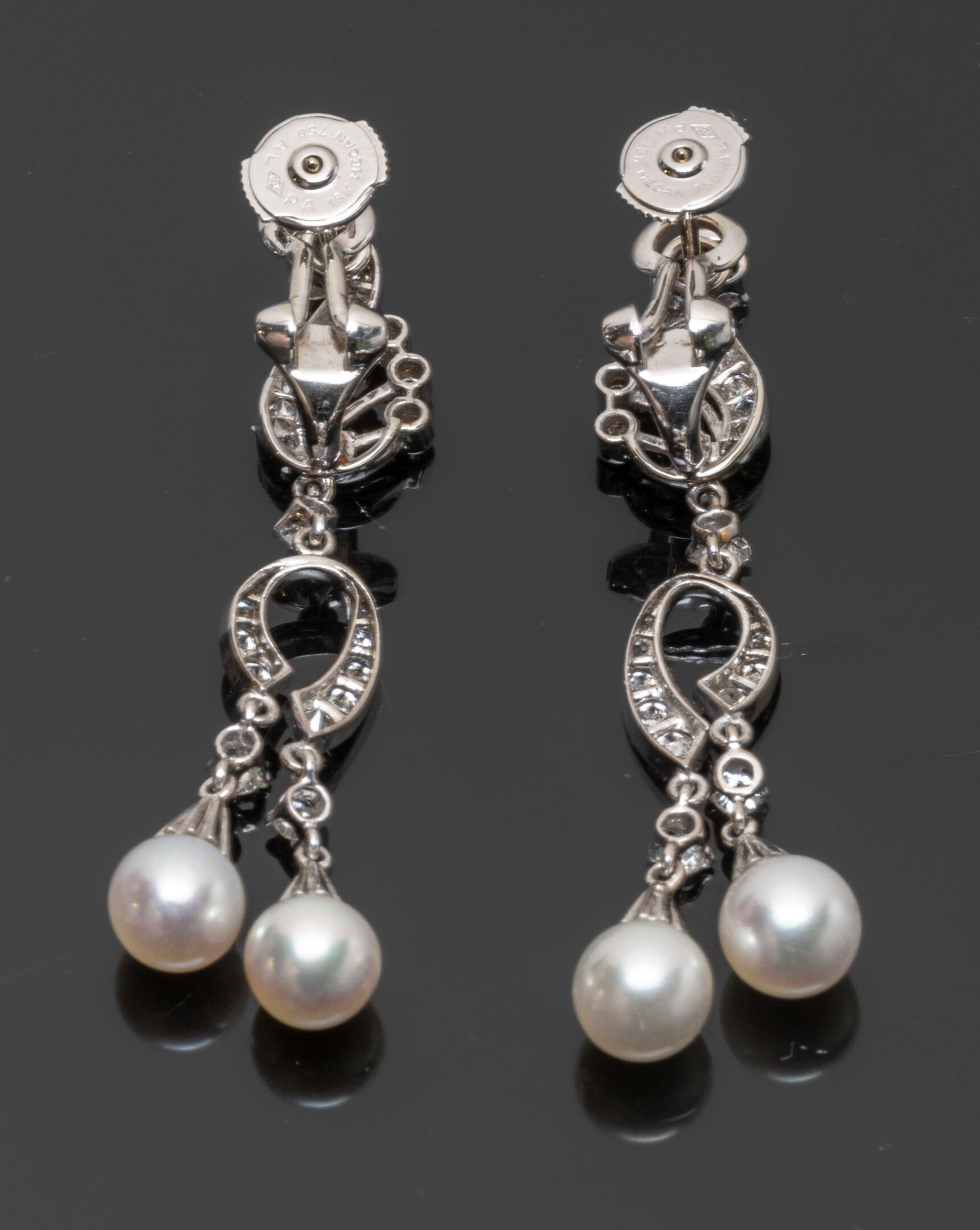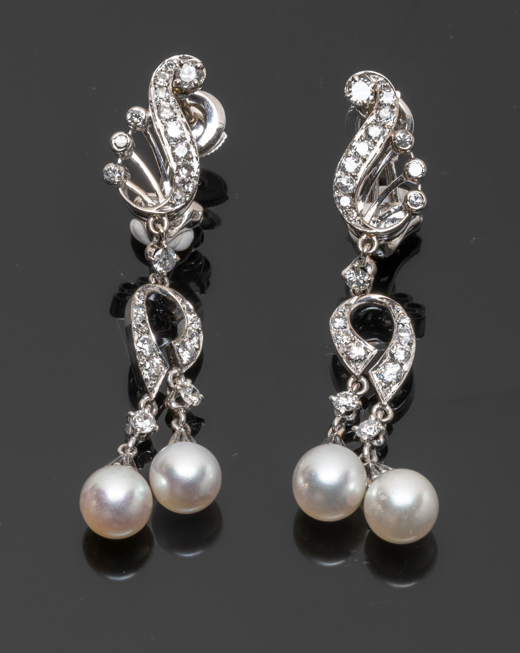 Pair of 18K (750°/°°) white gold earrings forming ear clips with stems ending in an ALPA clasp, decorated with articulated volutes, set with brilliant-cut and 8x8-cut diamonds, each ending in two pendants holding a cultured pearl (diameters: approx. 7.2 to 7.5 mm).