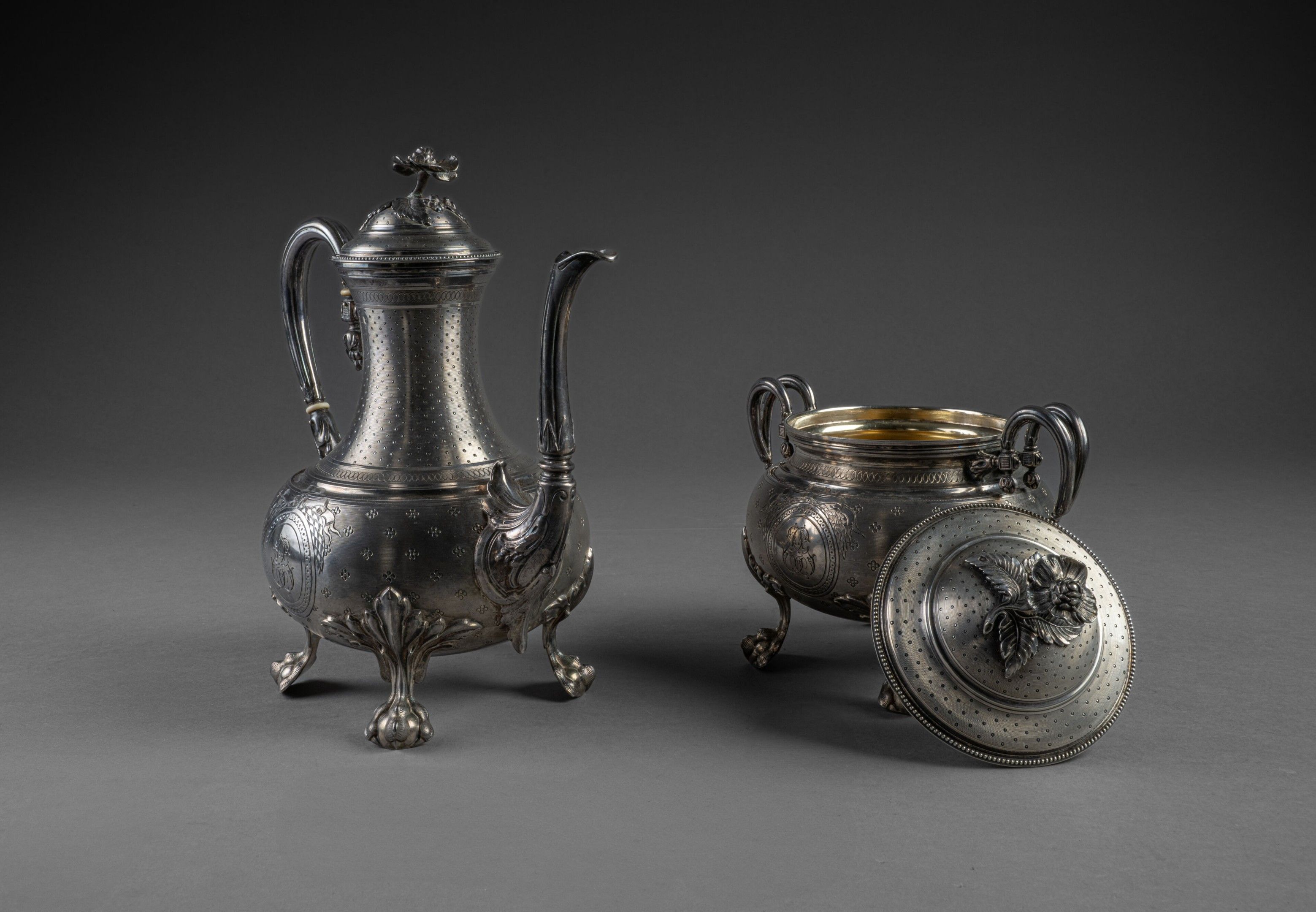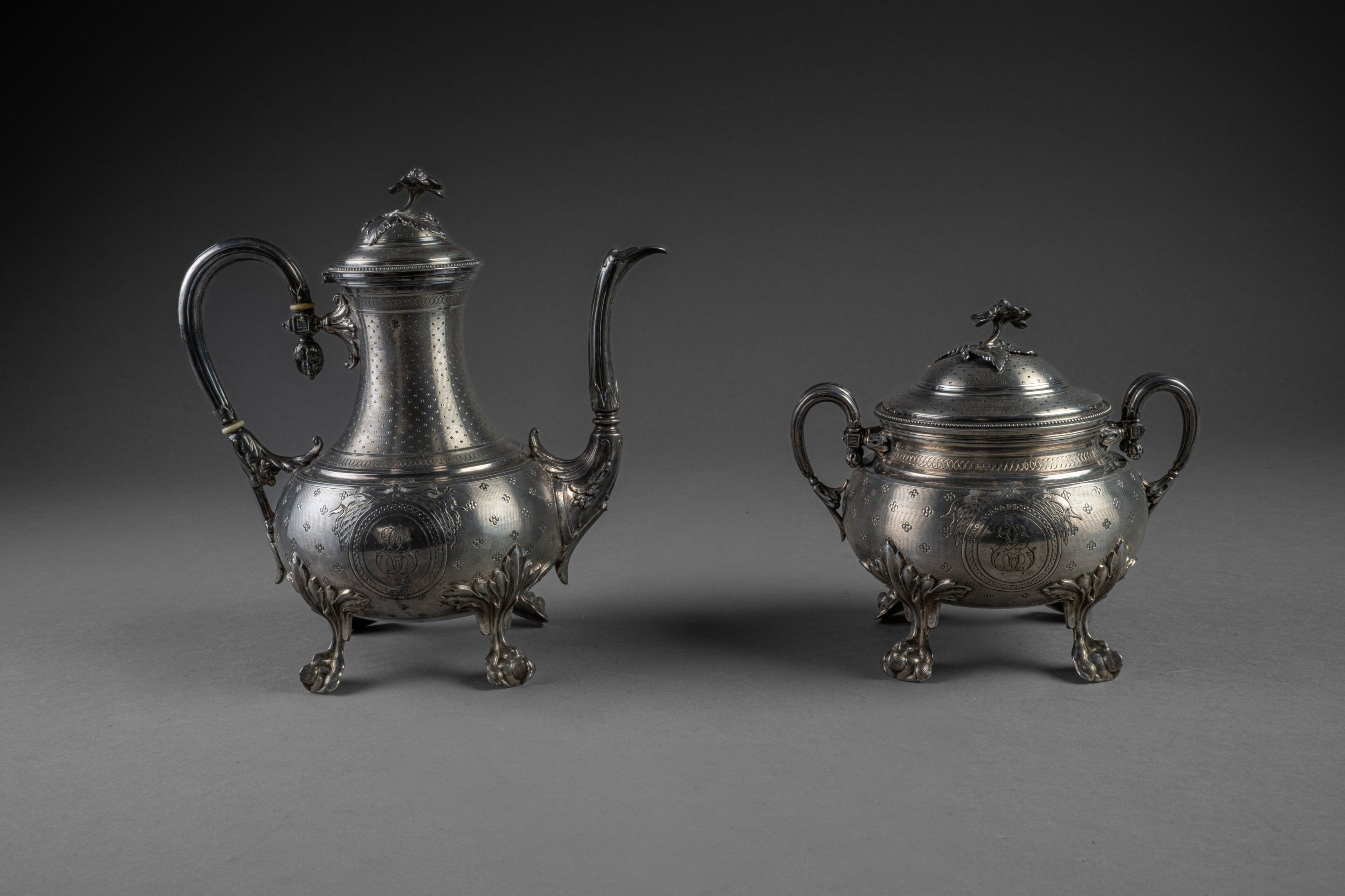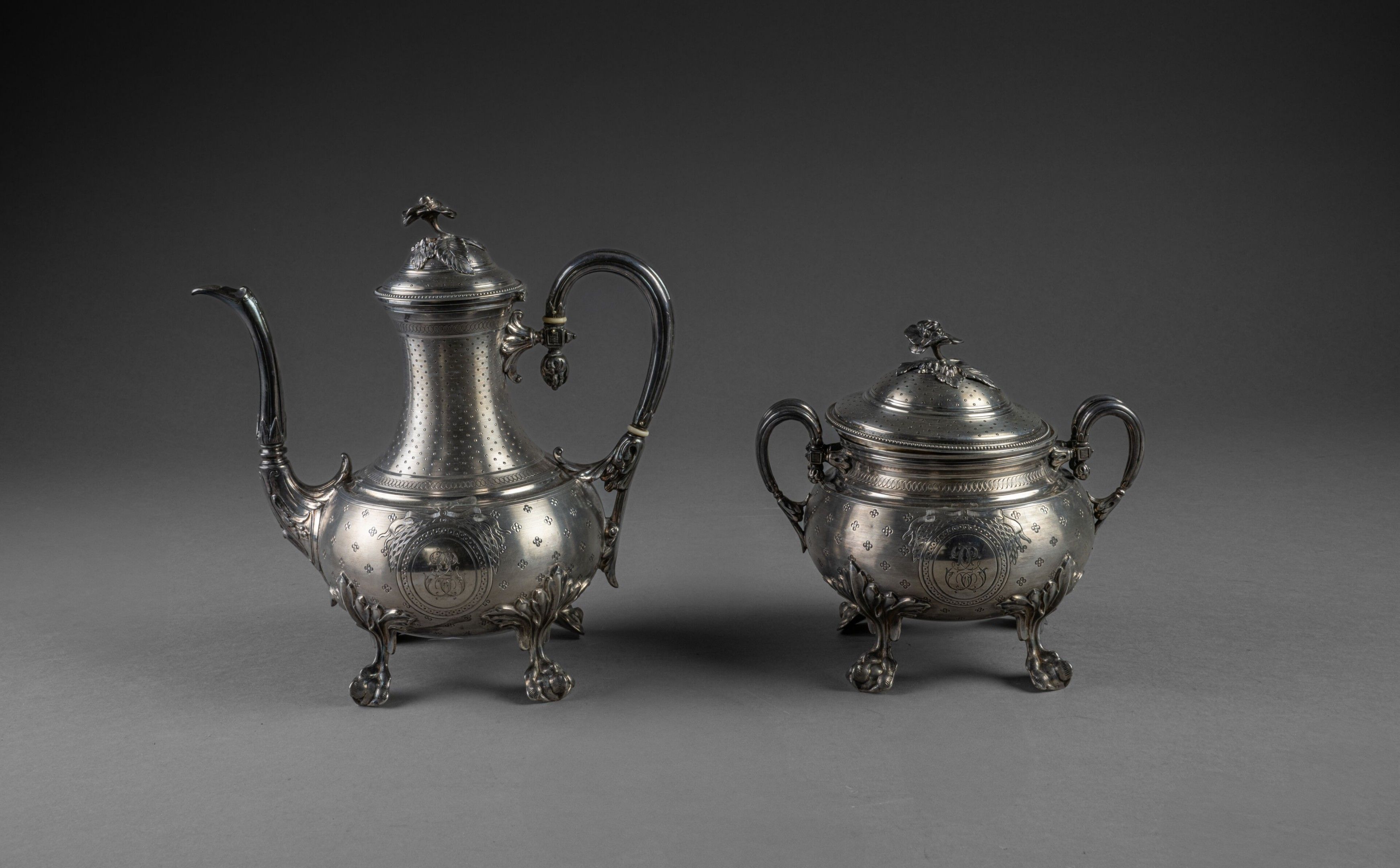 Part of a coffee service, the body with guilloché decoration of a semis of florets centred on a double cartouche with numerals, the lids decorated with a semis of pearls, fretel in the form of a flower in full bloom with foliage, the handles with acanthus leaf attachments, resting on four claw feet with foliate attachments, consisting of a coffee pot and a covered sugar bowl.