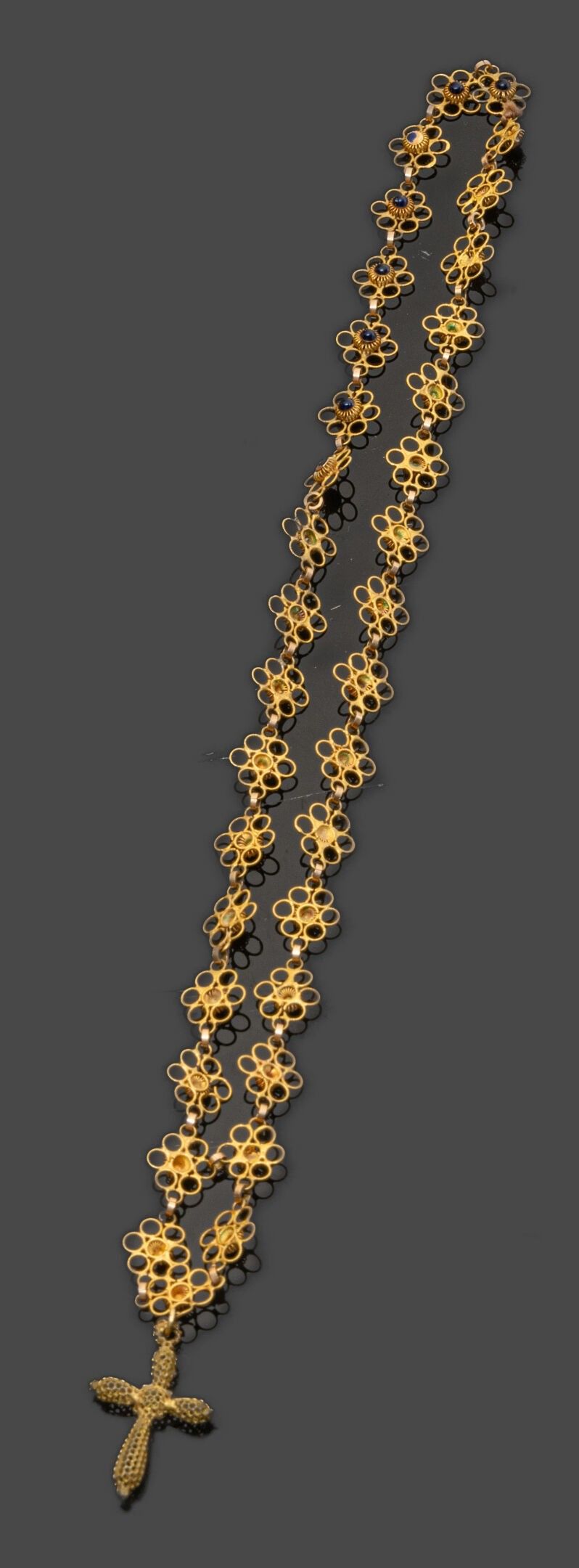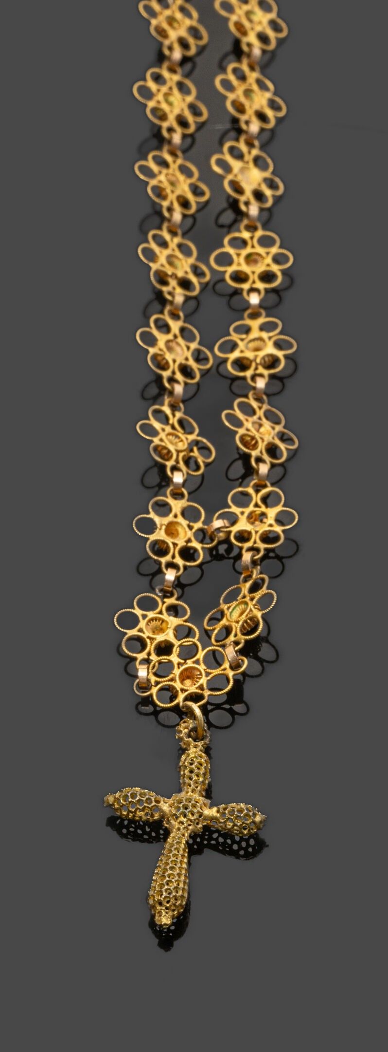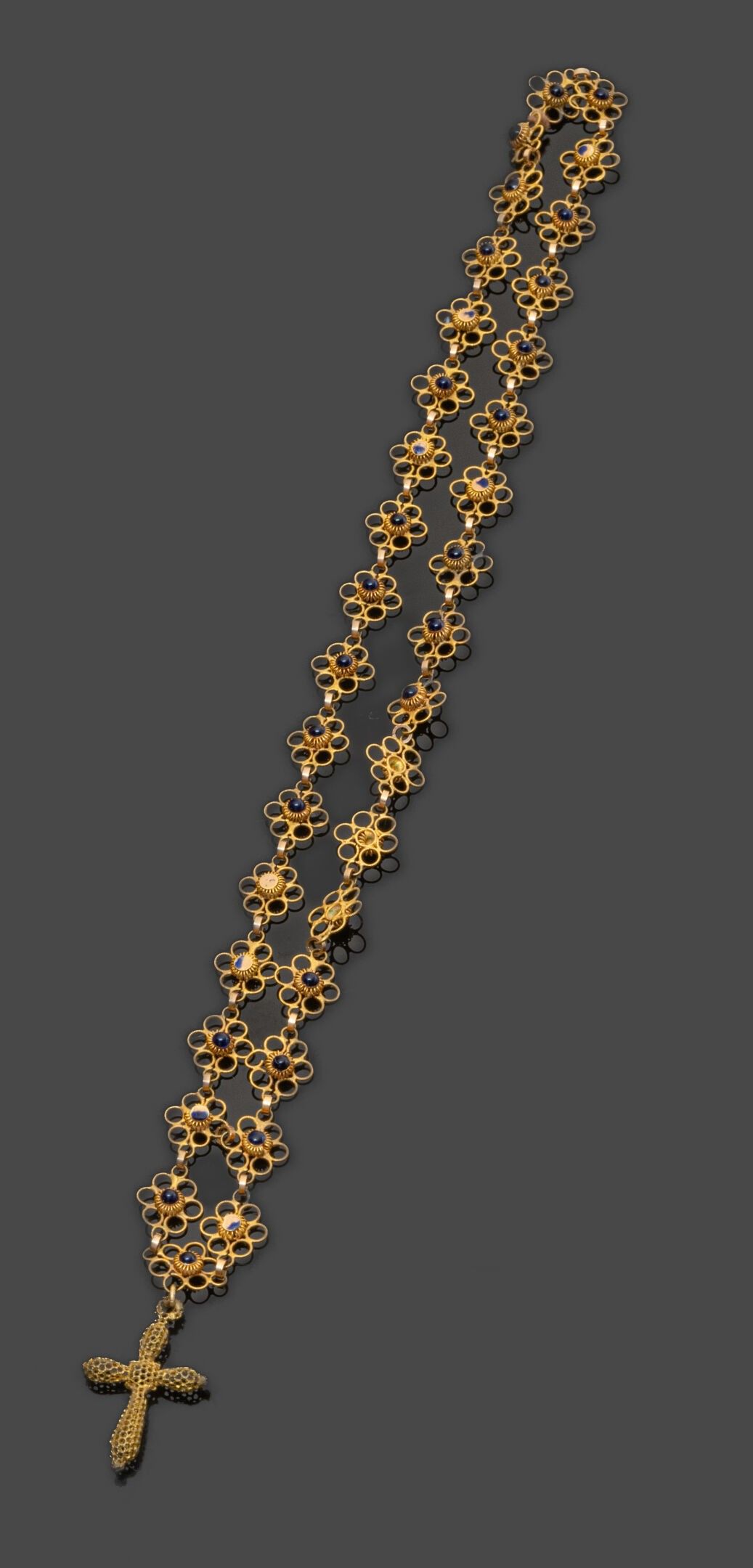 Necklace in 18K (750°/°°) yellow gold with openwork links forming flowers (accidents) centred on blue enamelled domes (many missing links), the linked central links suspend a Latin cross in pompom net (minor accidents). Missing links and clasp, fastened with cotton thread.