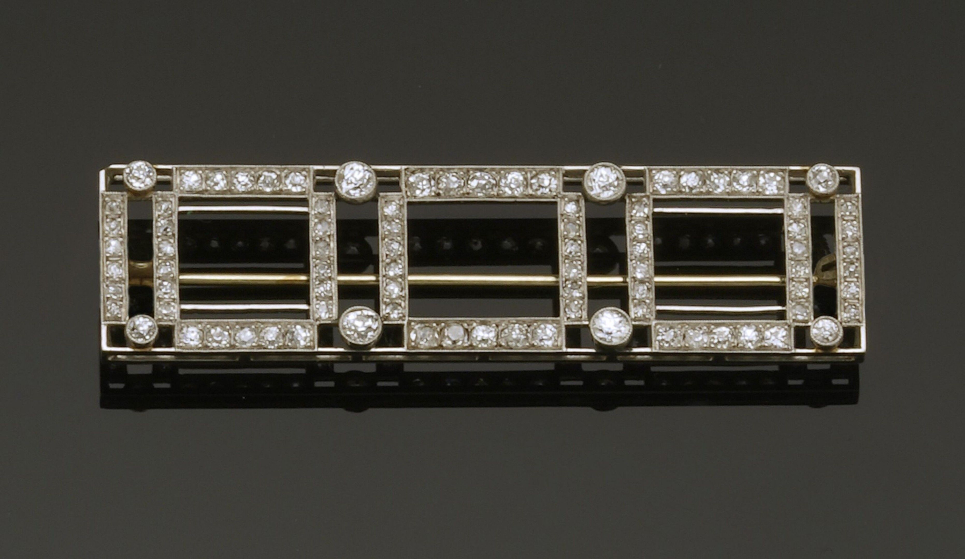 Rectangular brooch in platinum (850°/°°), the geometric decoration set with lines of old-cut diamonds and larger diamonds (including 4 x 0.10 ct approx.) in closed setting (minor accidents to some stones). The pin in 18K (750°/°°) white gold Dimensions: approx. 60 x 16 mm - Gross weight: 8.7 g