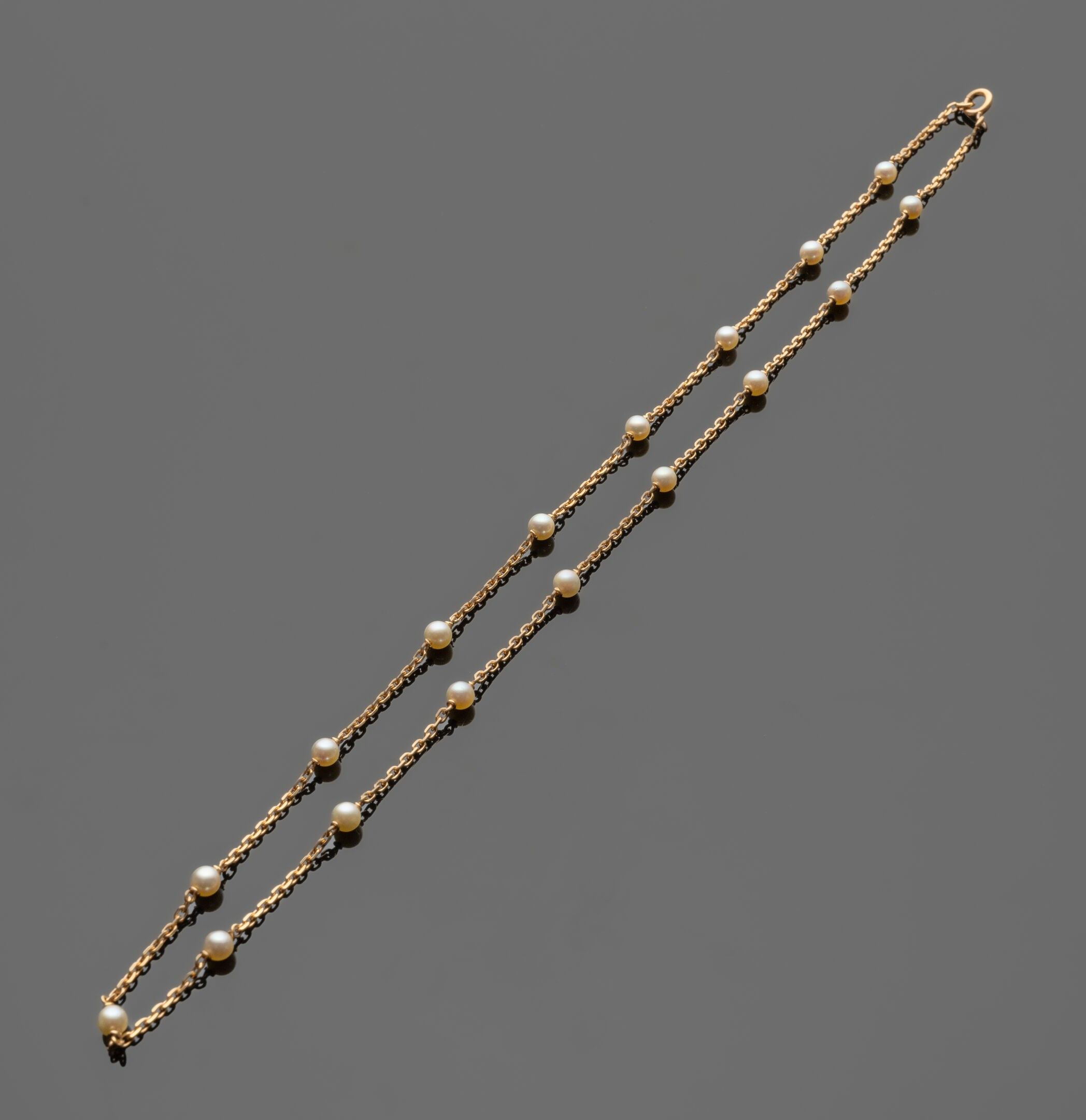 Necklace in 18K (750°/°°) yellow gold, with 17 cultured pearls (diameters: 4.2 to 4.4 mm approx.) Length: 51 cm approx. - Gross weight: 7.7 g