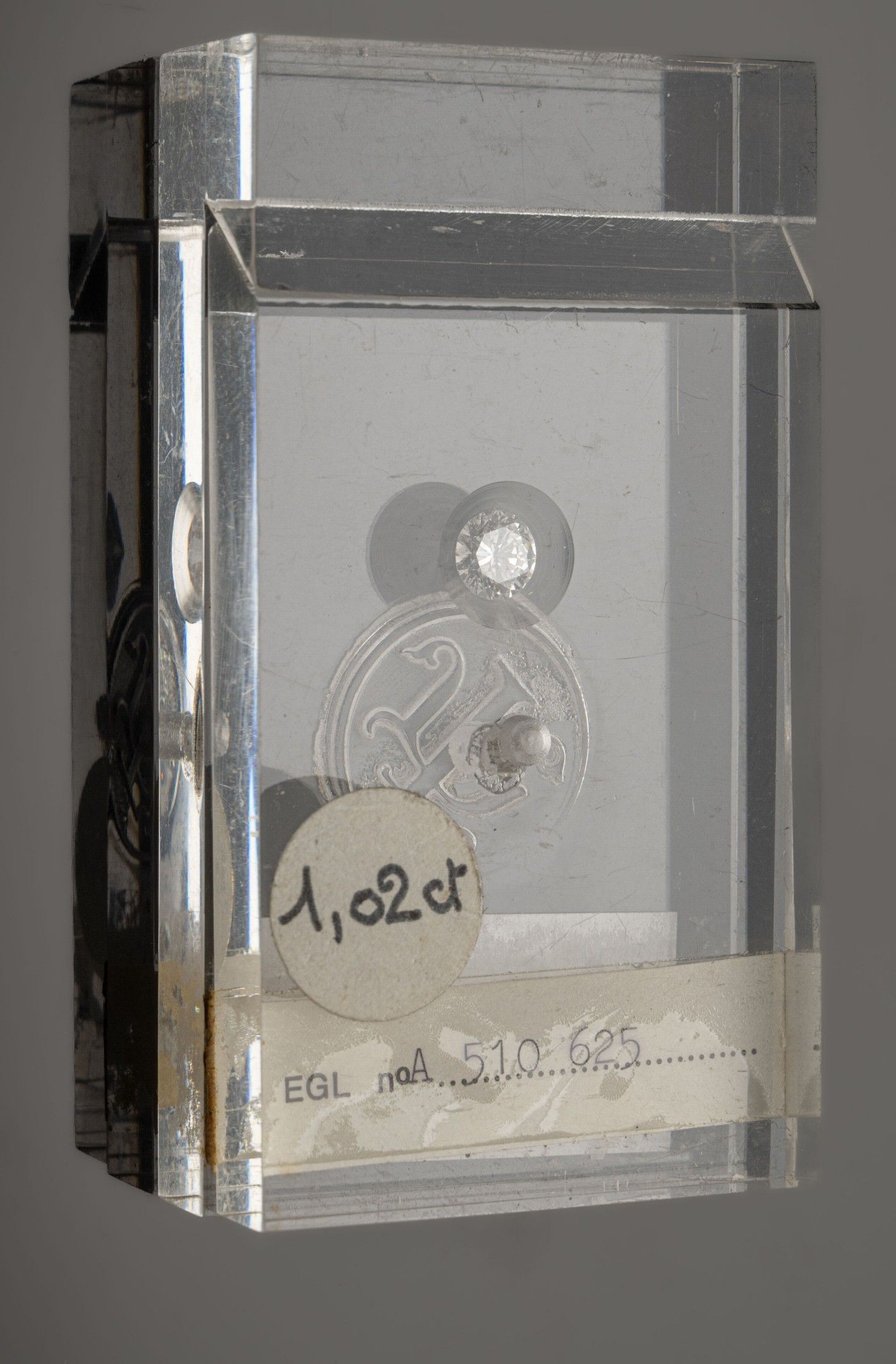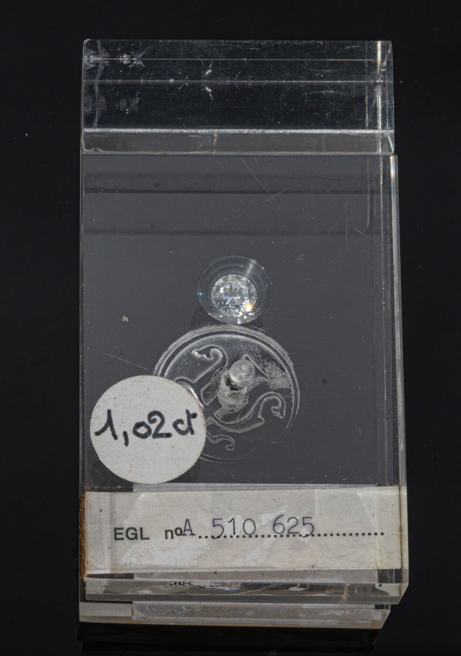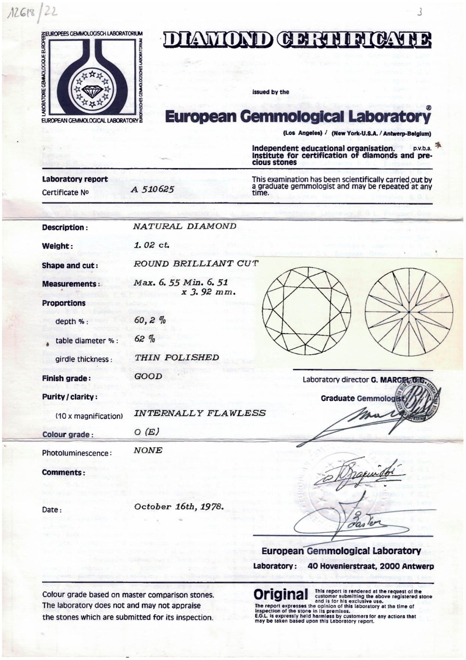 Unmounted brilliant-cut diamond, under plexiglass seal, weighing 1.02 carat, E colour, IF clarity, zero photoluminescence. The stone is accompanied by its EGL certificate dated 1978.