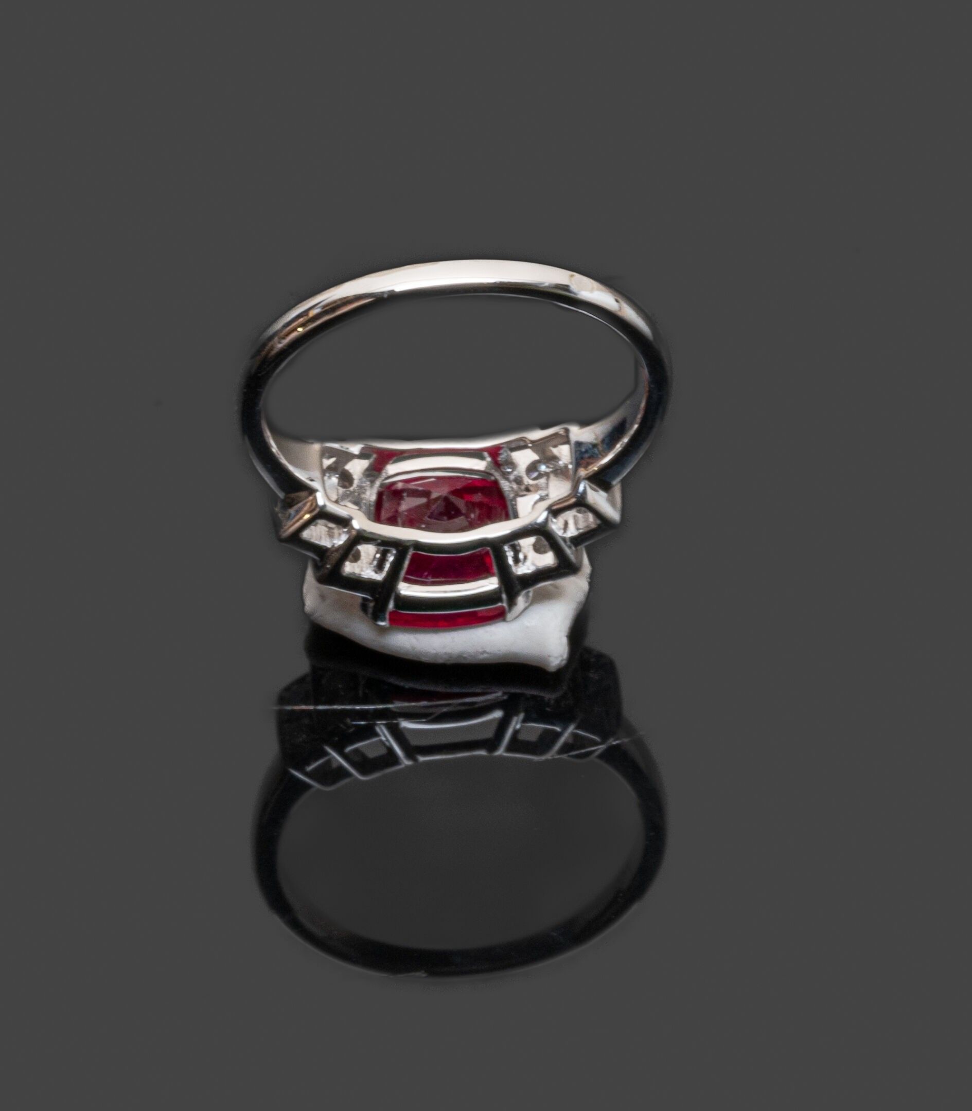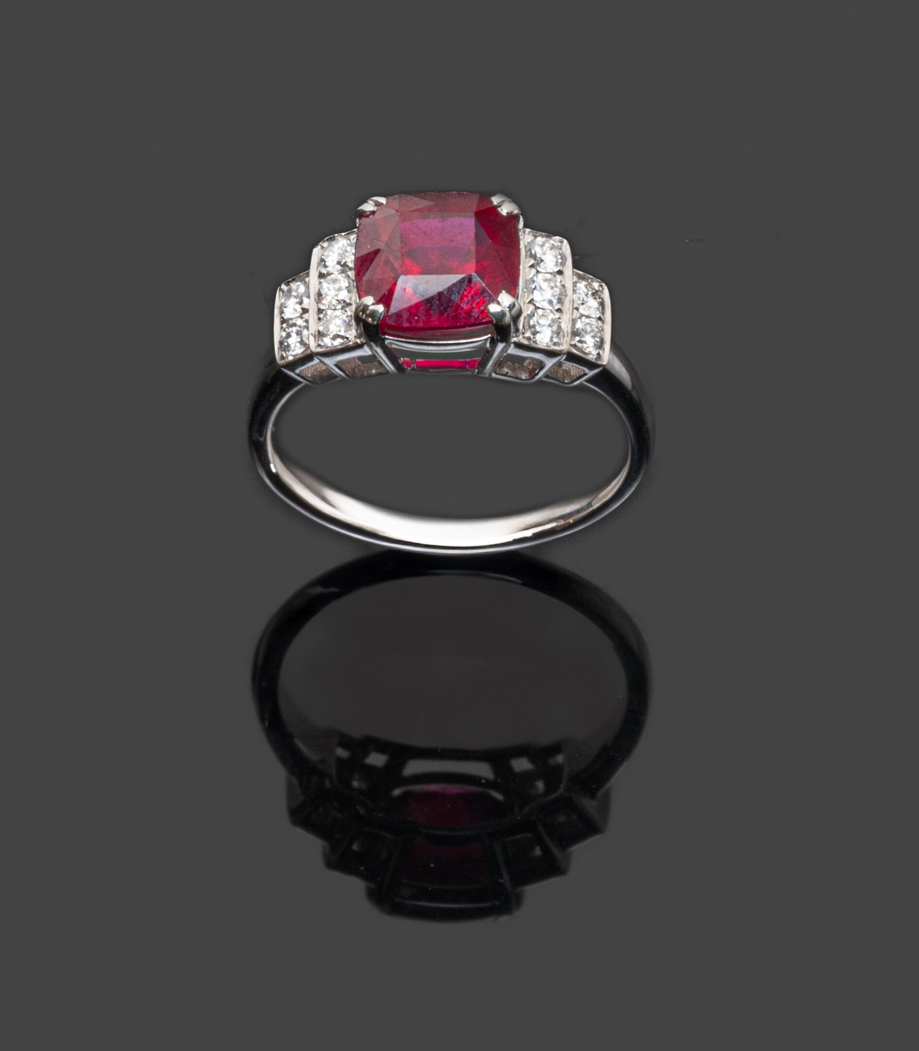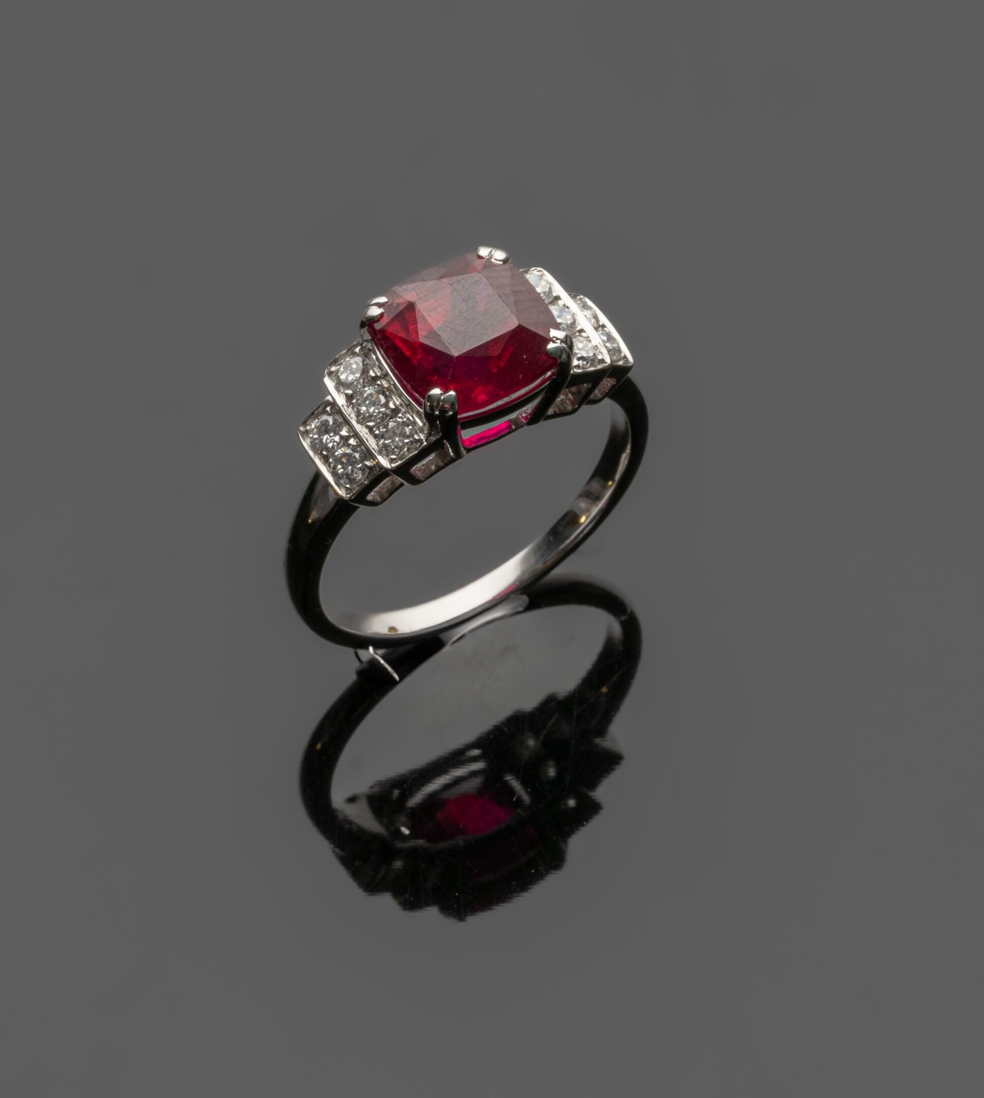Ring in 14K (585°/°°) white gold, centred on a cushion-shaped composite ruby (probably glass filled) weighing approximately 3.70 carats, set in tiers of brilliant-cut diamonds.
