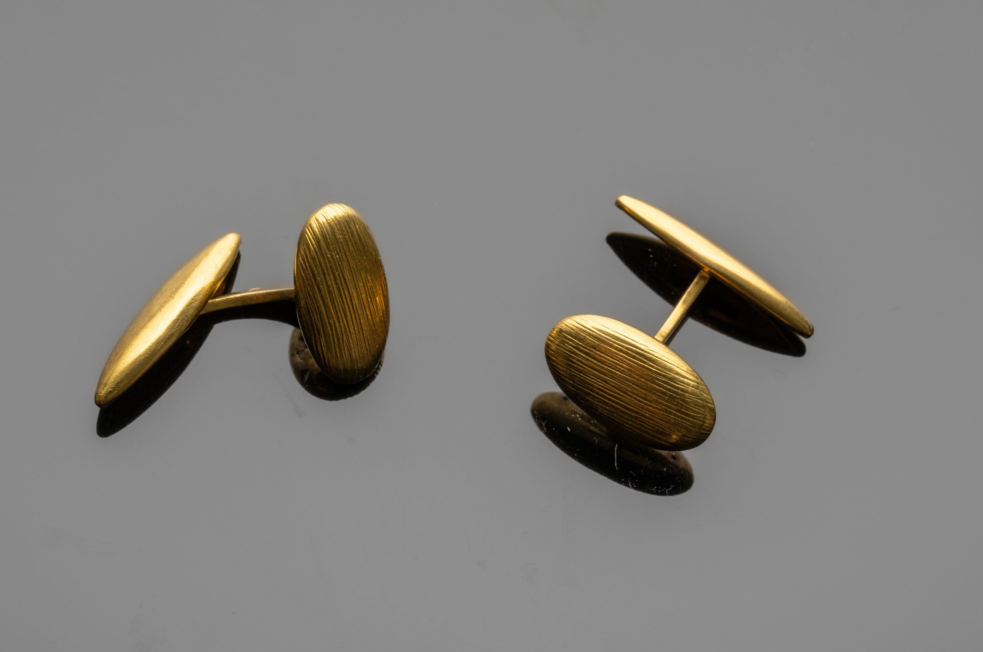 Pair of cufflinks in 18K (750°/°°) yellow gold, the oval motifs with a bark finish (weaknesses and rework to the clasp on one); the rocking systems (one spring defective: to be reworked) with smooth shuttle motifs.