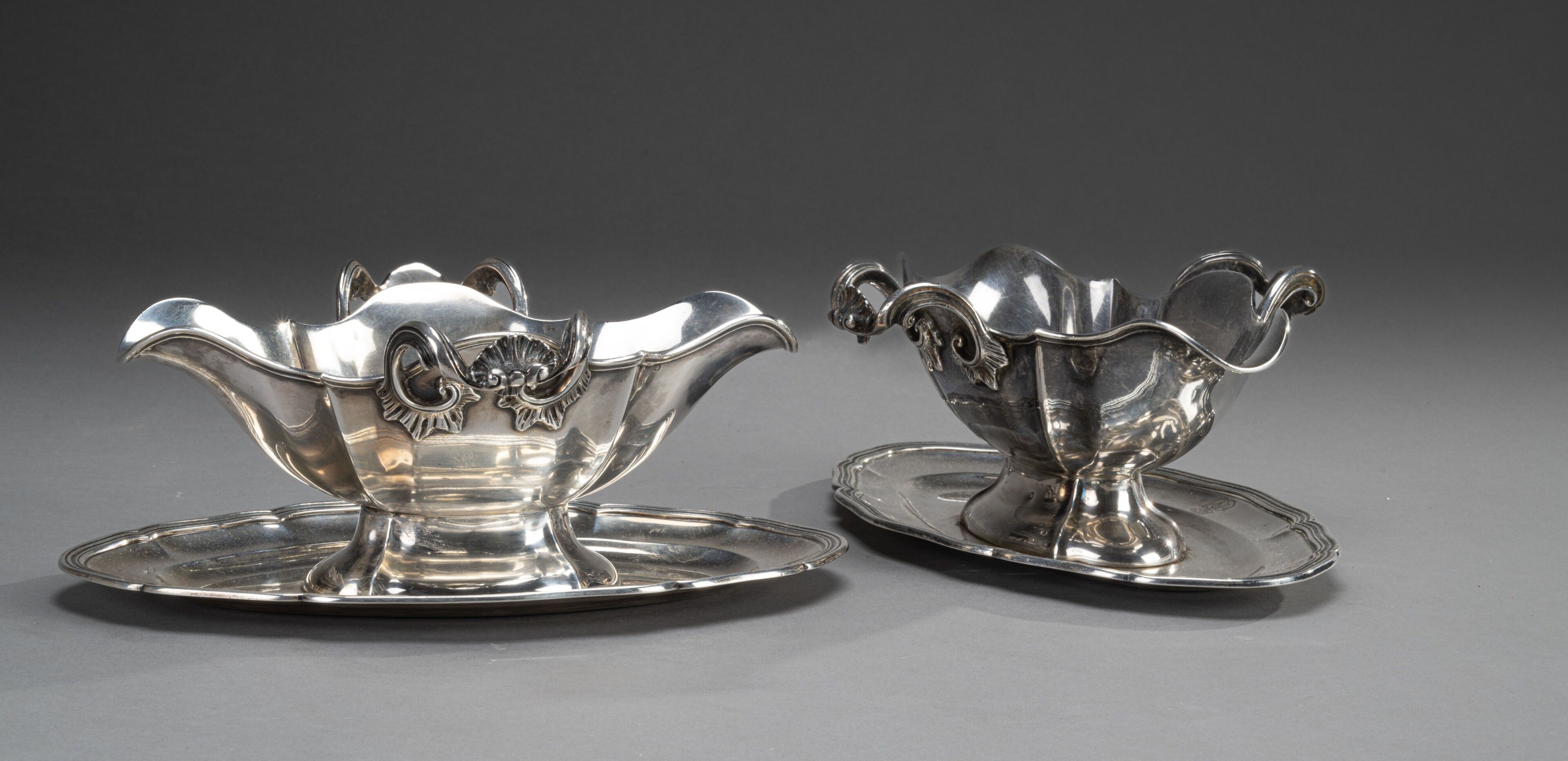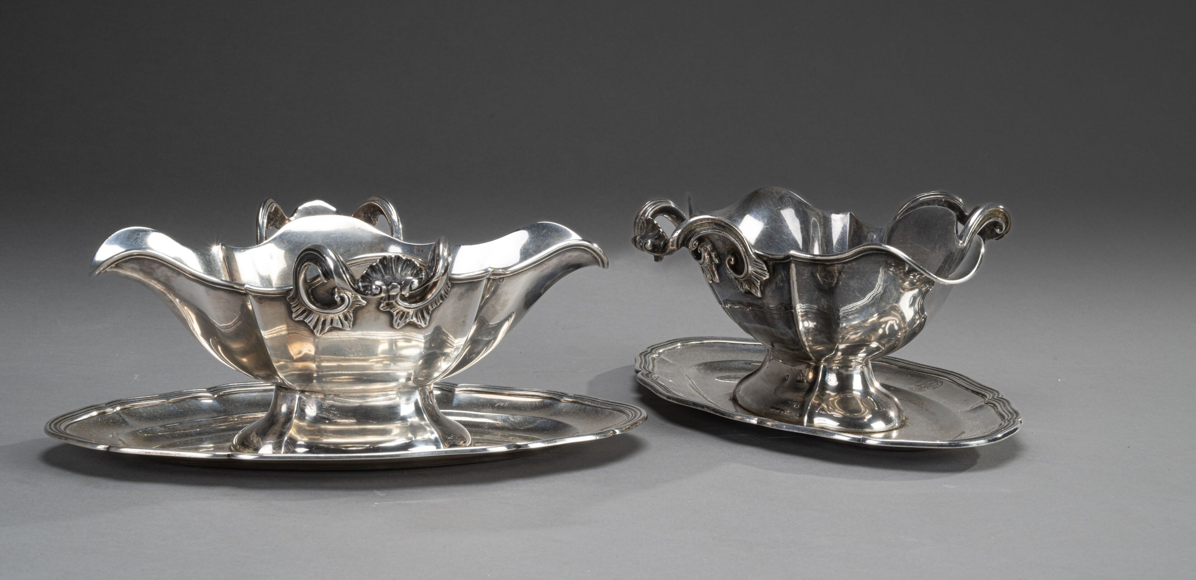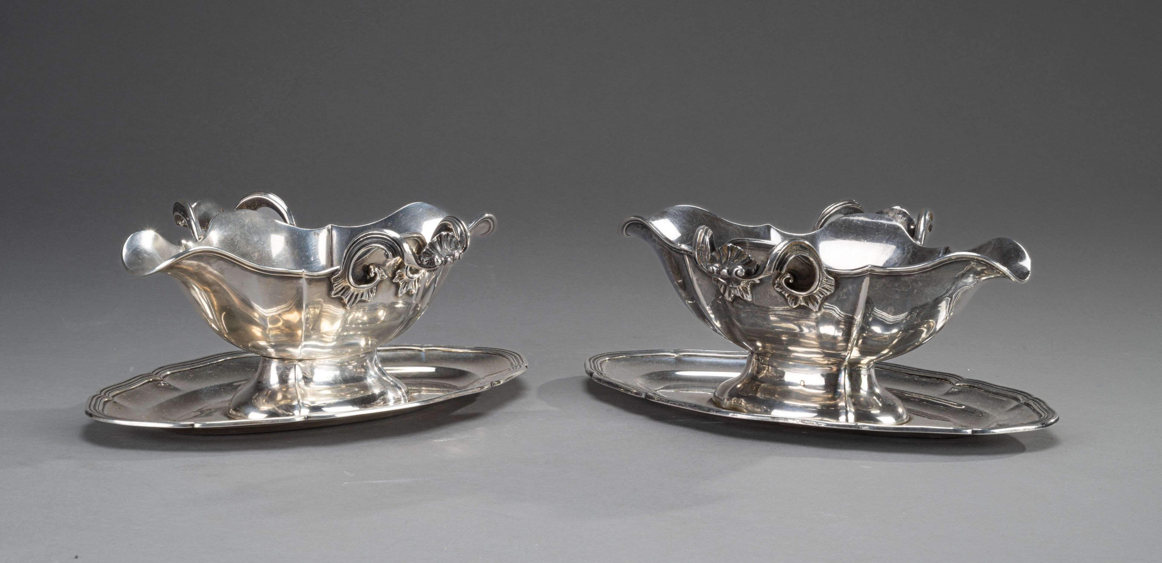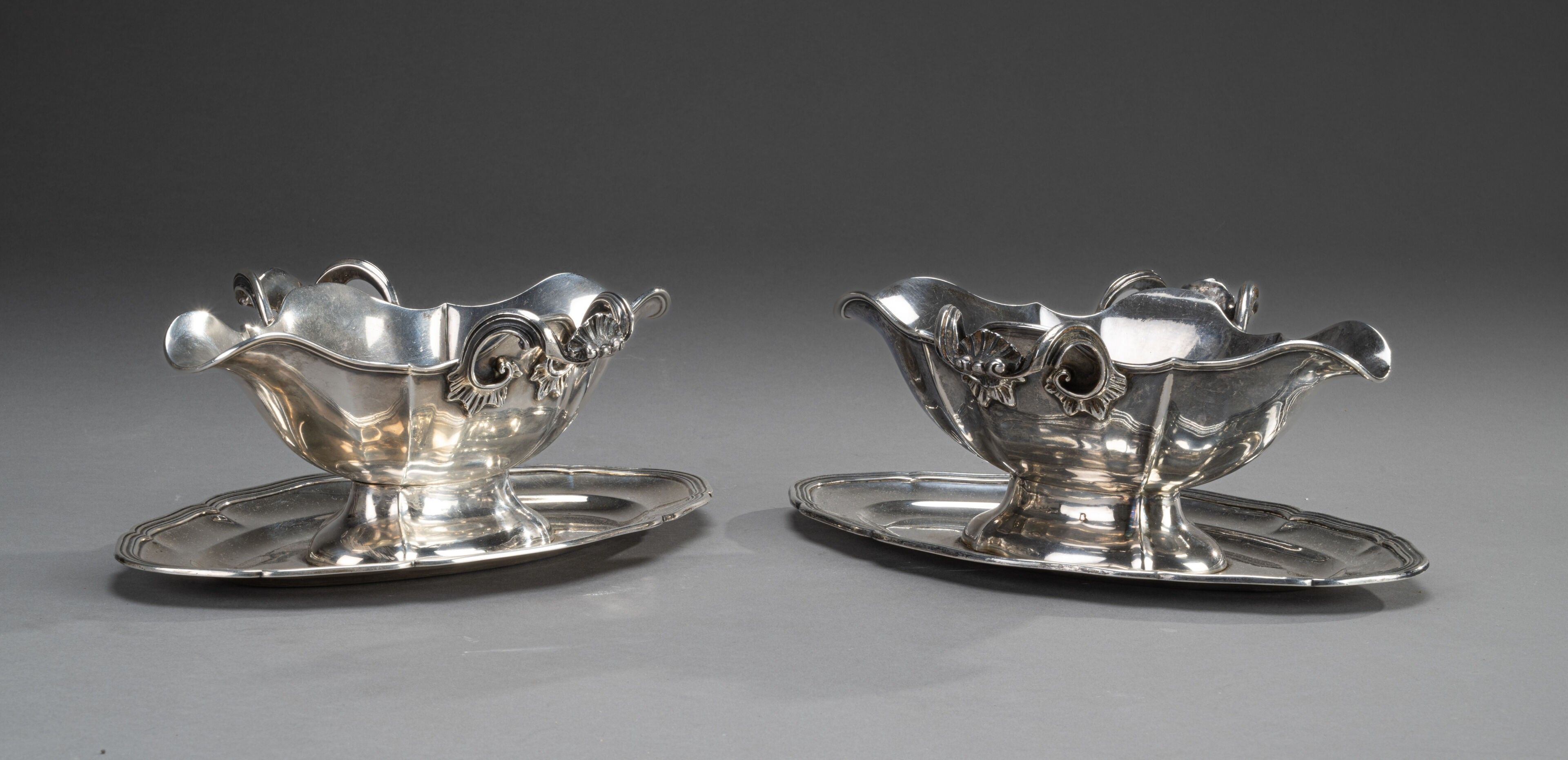 Saucières and their adhering trays, oval with eight contours with fillet, the wing figured, oval sauceboat on pedestal with double spout with four rounded ribs, fluted edges, handles with foliage centred on a shell with rocaille attachment.