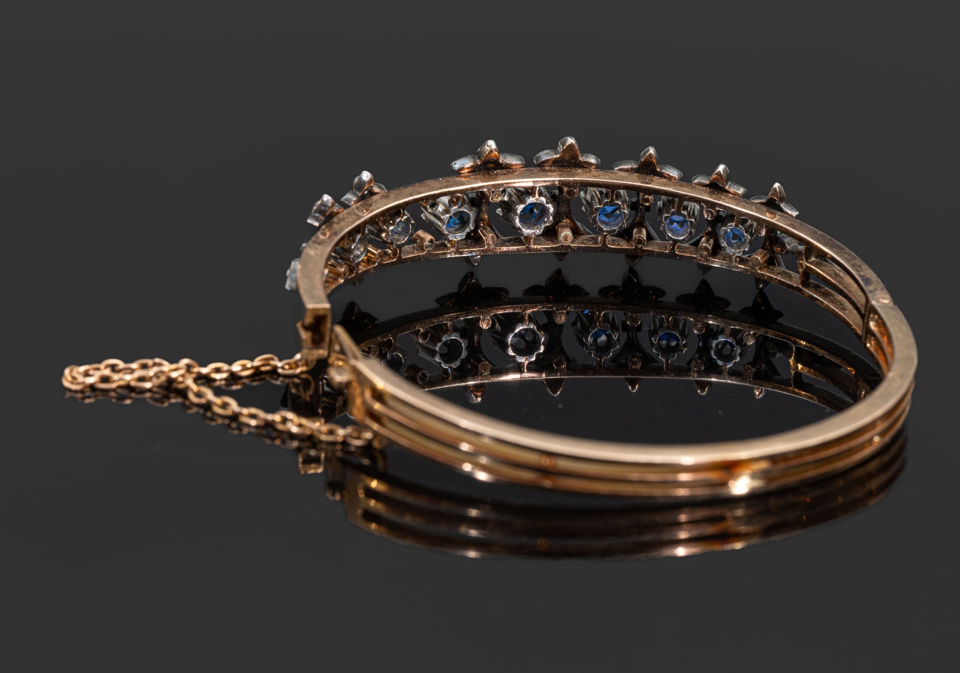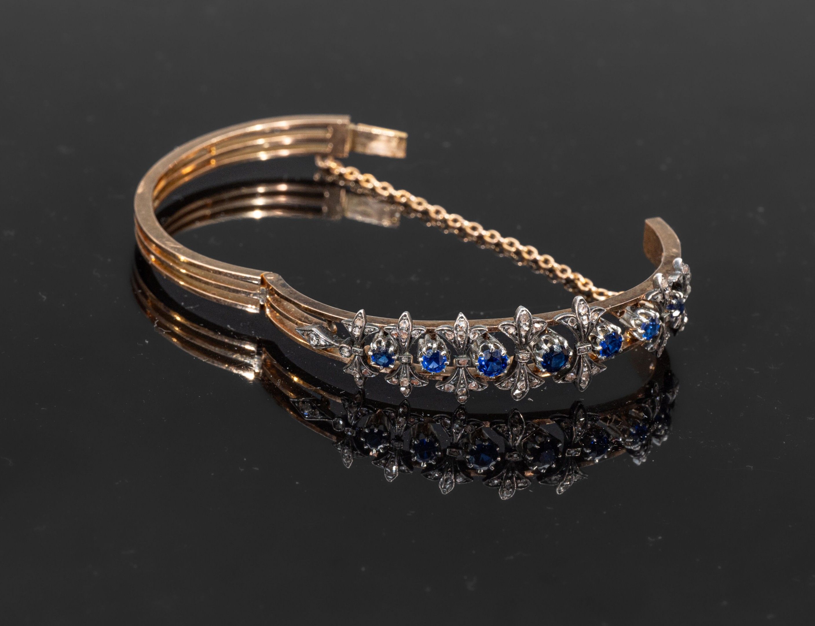 18K (750‰) yellow gold and silver (800°/°°) openwork rigid Jonc bracelet, the upper part adorned with double fleur-de-lys motifs (one missing) set with rose-cut diamonds alternating with round synthetic sapphires in drop (later added stones). With safety chain.
