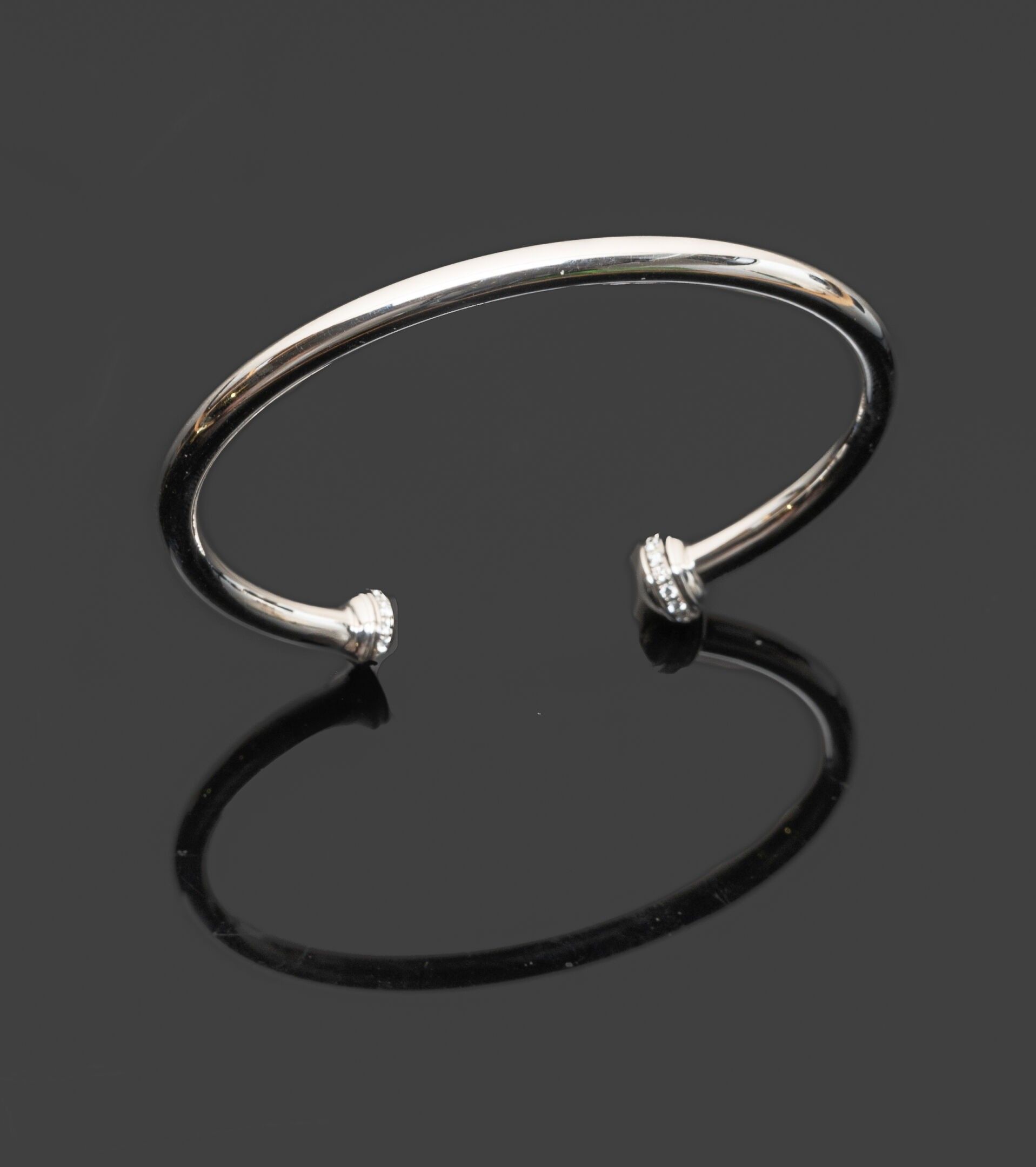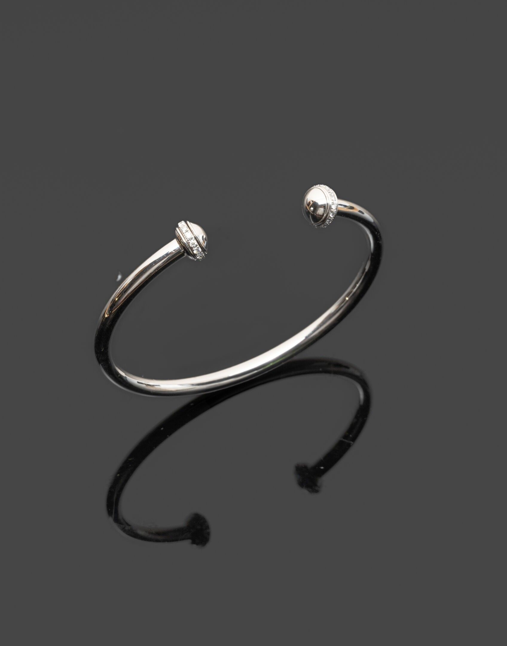 Open-worked semi-stiff bezel bracelet in 18K (750°/°°) white gold, "Possession" collection, the ends forming rotating ring motifs set with lines of brilliant-cut diamonds. Signed and numbered.