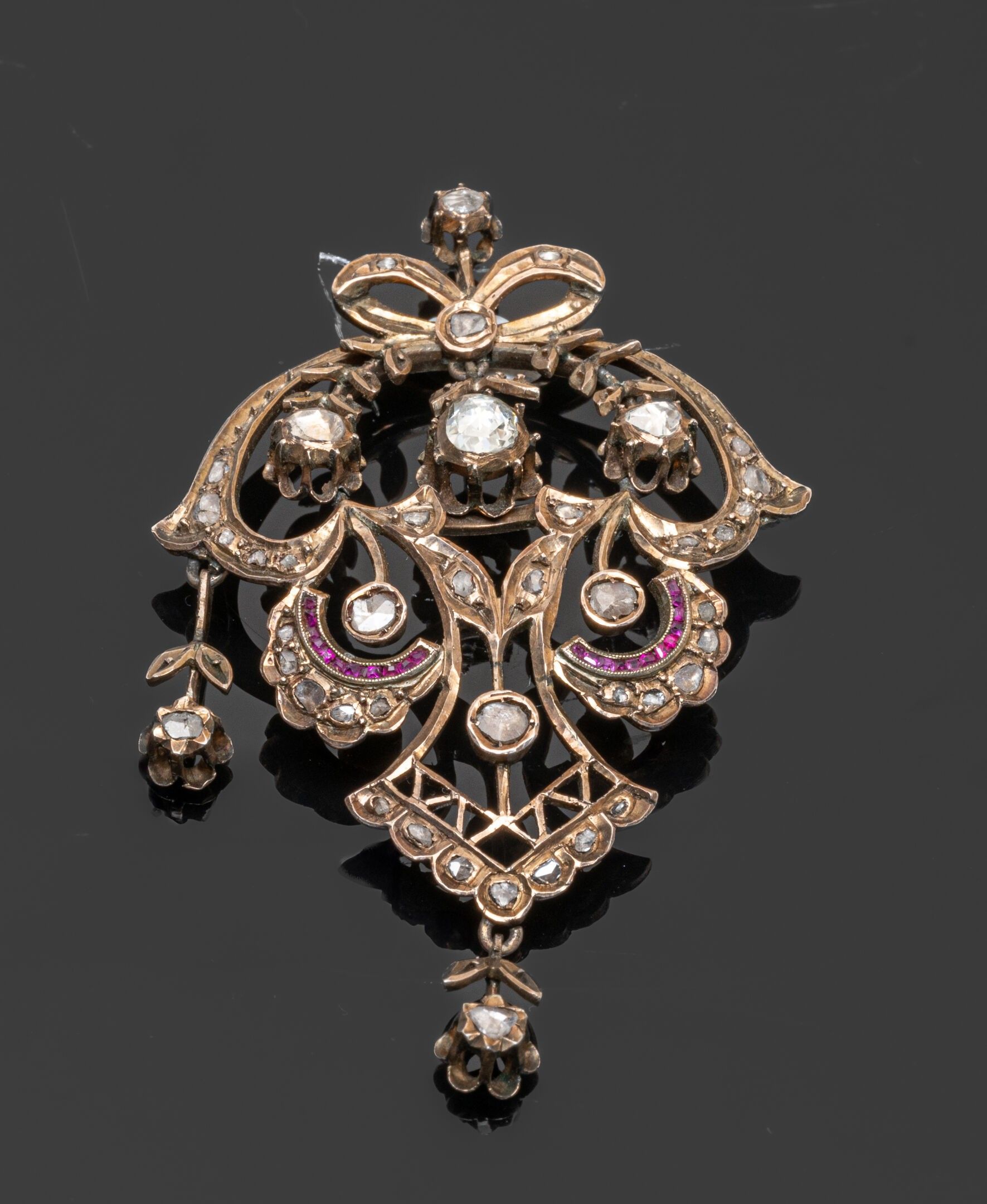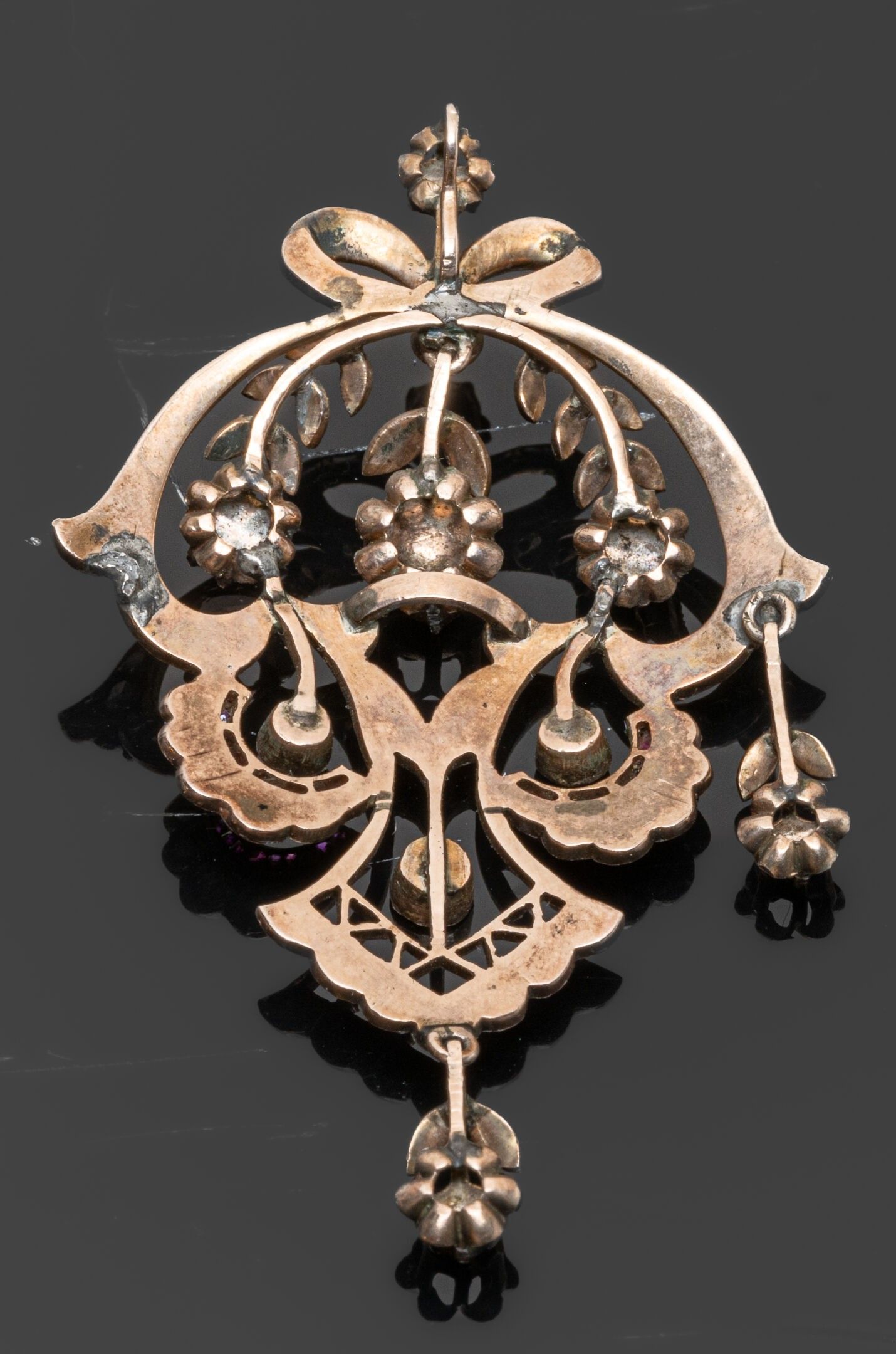 9K (375°/°°) gold and silver (800°/°°) pendant, with a plant motif of pendants and ribbon bows, set with rose-cut diamonds, the central one a crowned rose (size: approx. 6 x 4.4 mm), and calibrated synthetic rubies (one pendant missing, and minor accidents).