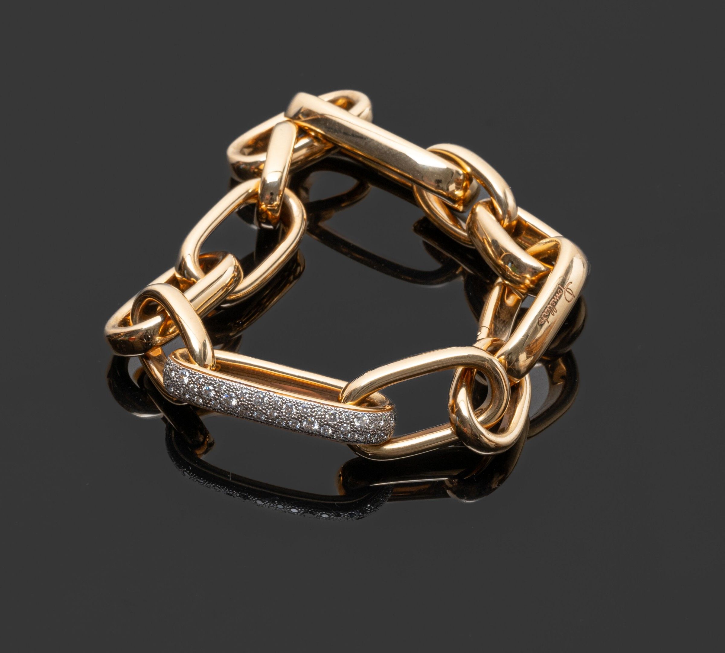 Bracelet in 18K (750°/°°) two-tone gold, "Iconica" collection, with large cartouche and oval links, a pavé of brilliant-cut diamonds, "mousqueton" clasp. Length approx. 20 cm. Signed and numbered