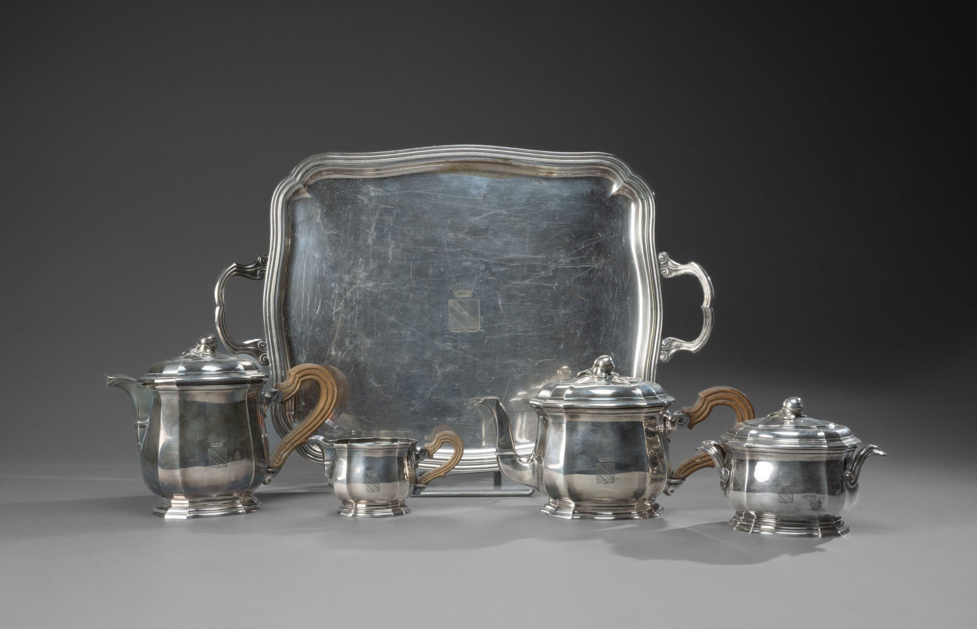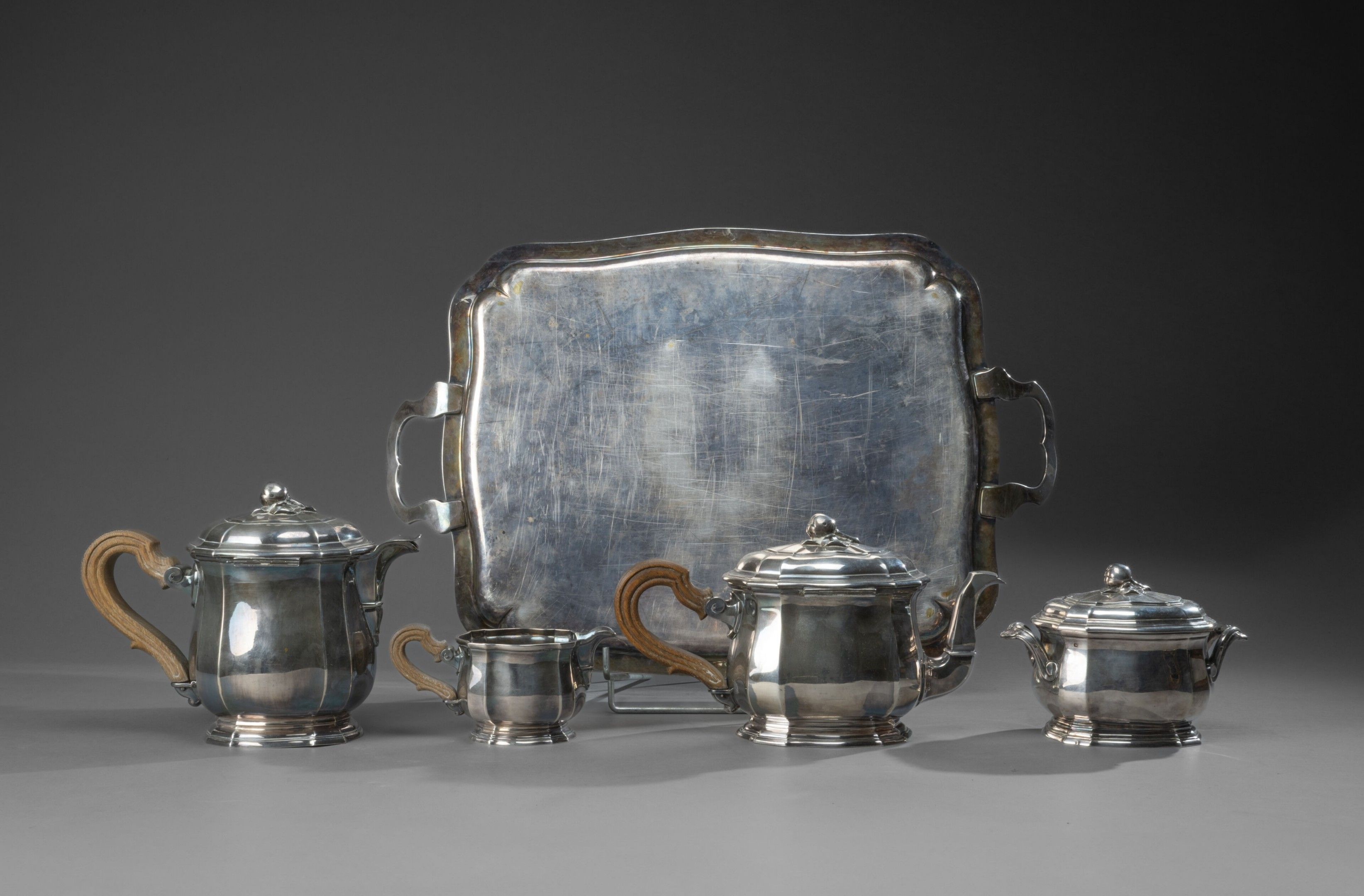 Plain silver tea and coffee service and silver-plated metal tray, rectangular in shape with four broad ribs with slightly convex contours alternating with small flat ribs on the foot and on the side-hinged lid, fretel in the form of a leafy wedge, wooden scrolled handle, the set engraved with a coat of arms under a count's crown, comprising: a teapot, a coffee pot, a sugar bowl with removable lid, a milk jug and a tray.