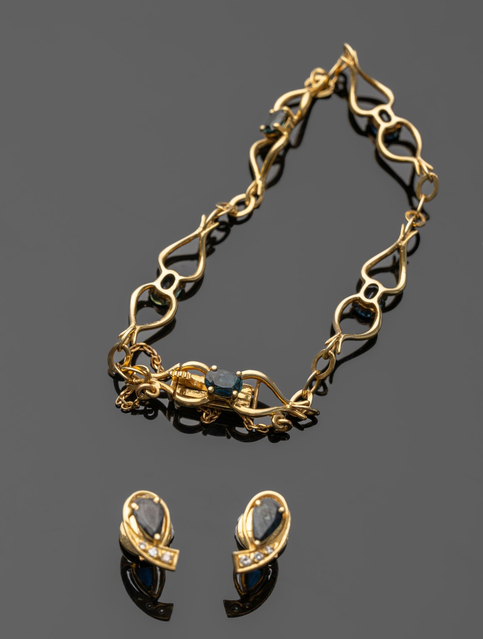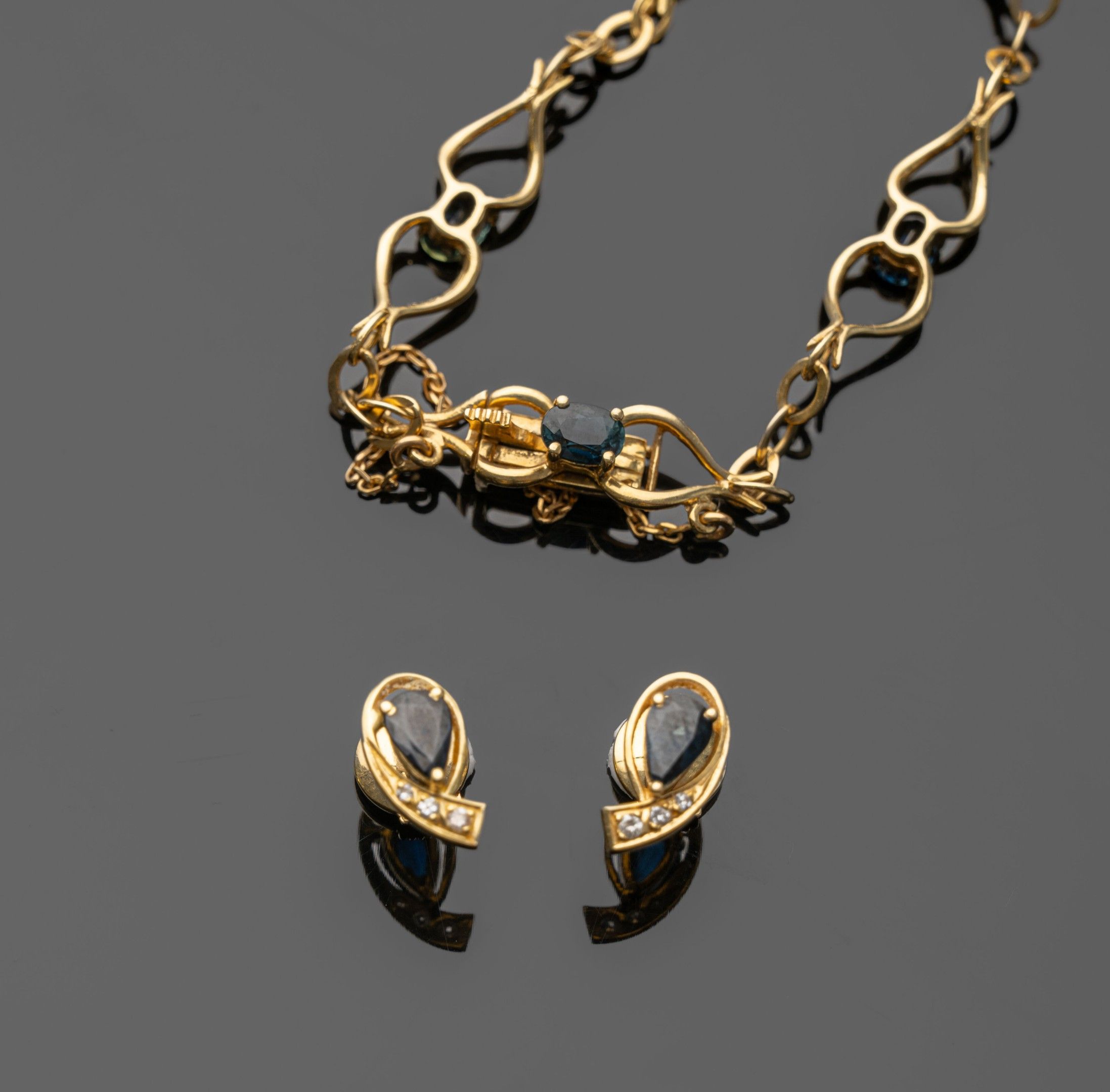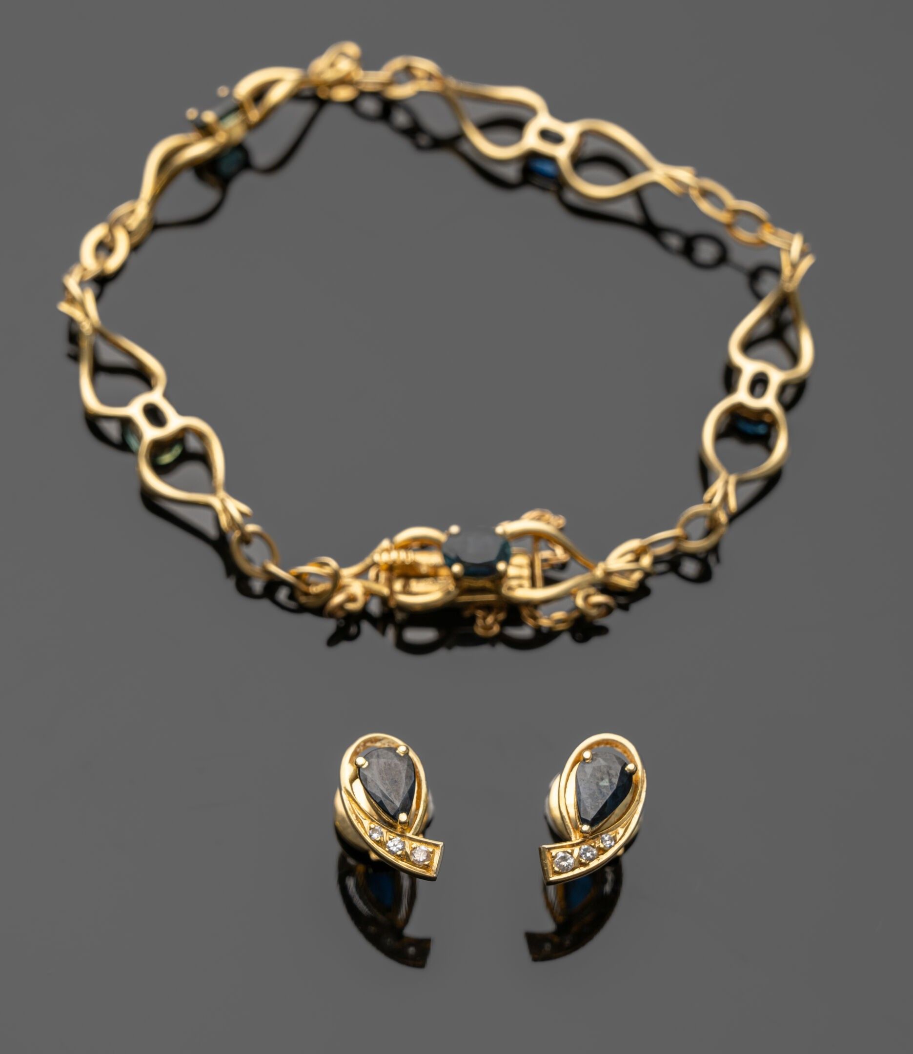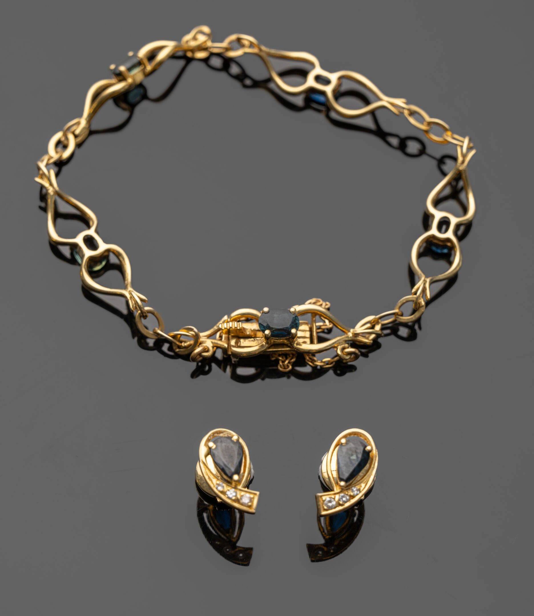 Set in 18K (750°/°°) yellow gold comprising a bracelet with fancy links, embellished with five oval sapphires, with its safety chain (length: approx. 17.5 cm) and a pair of ear studs each centred with a pear-cut sapphire highlighted by a line of three falling brilliant-cut diamonds (height: approx. 12 mm, ALPA clasp systems). The sapphires are probably heat-treated.