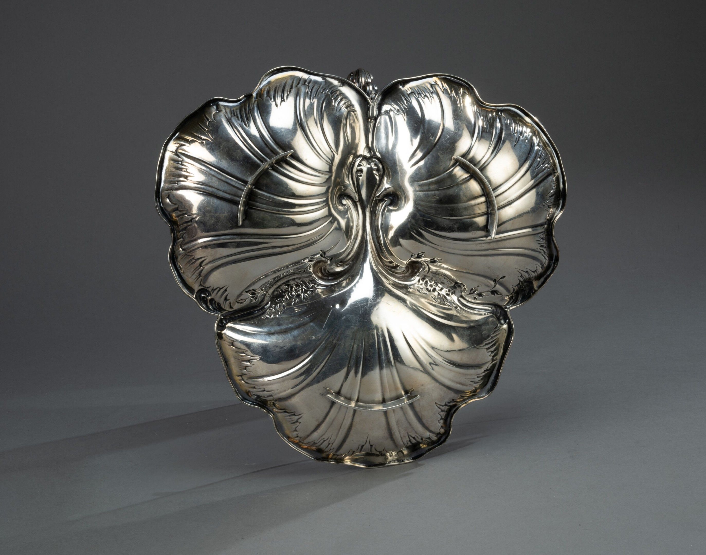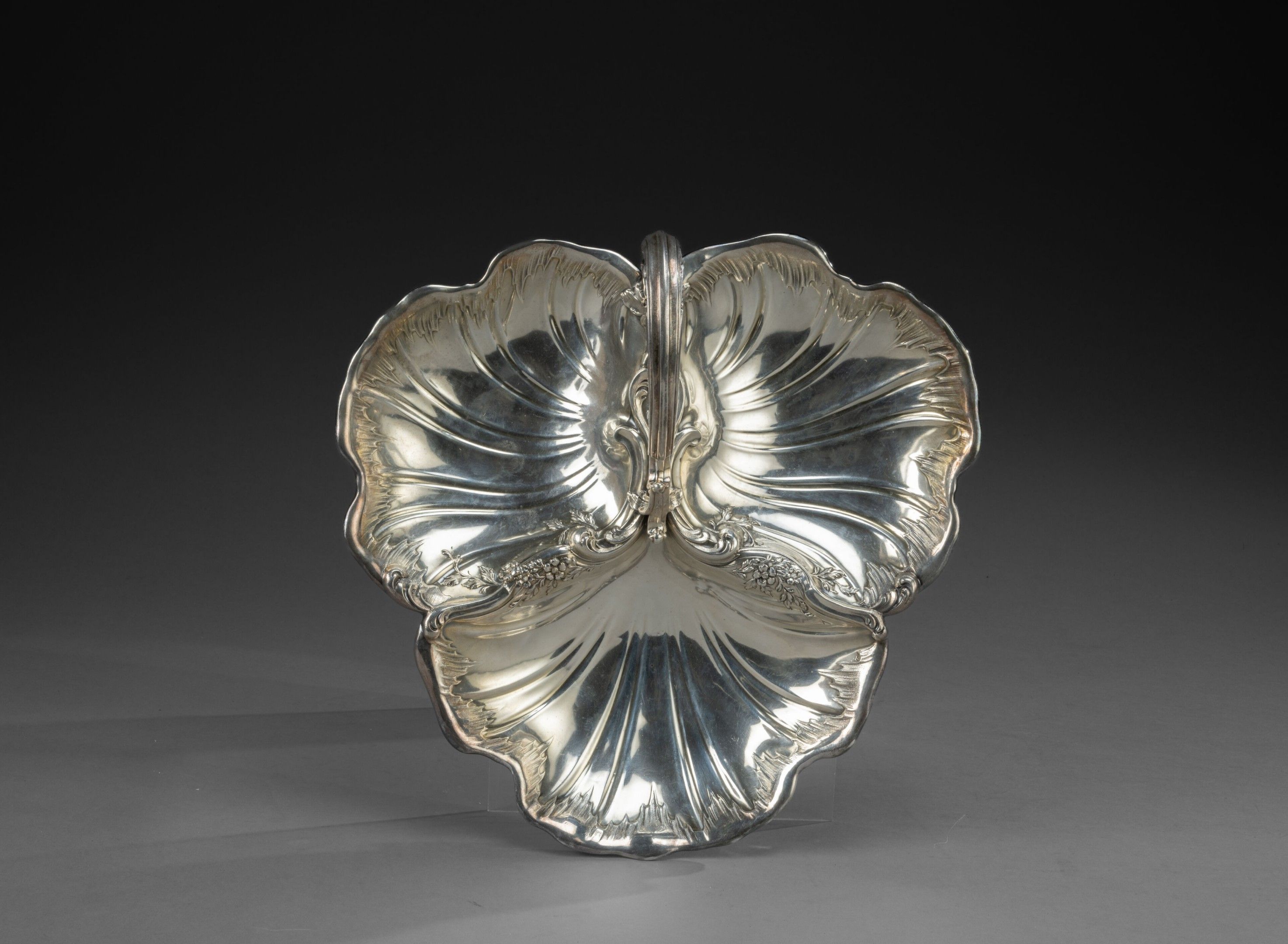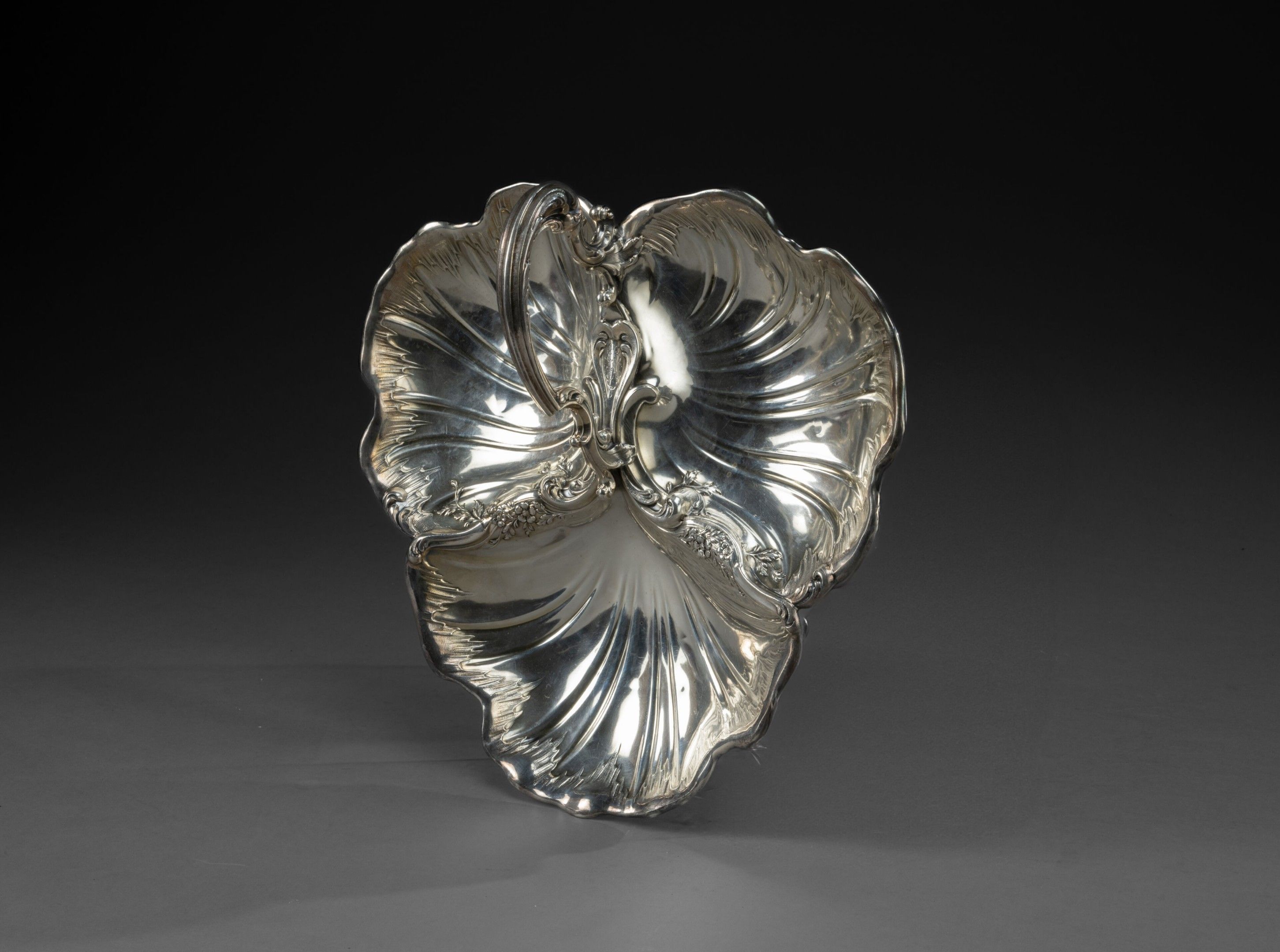 A silver beggar's bowl forming a centrepiece with three ribbed shells decorated with waves, separated by undulating stems of foliage and flowers, with a curved and counter-curved foliate grip, figured in a cartouche of leaf scrolls, standing on three rounded cane feet. Minerve First Title Master-smith : Probably Paul CANAUX & Compagnie L. 31 cm - Weight: 629 g ML Slight dents