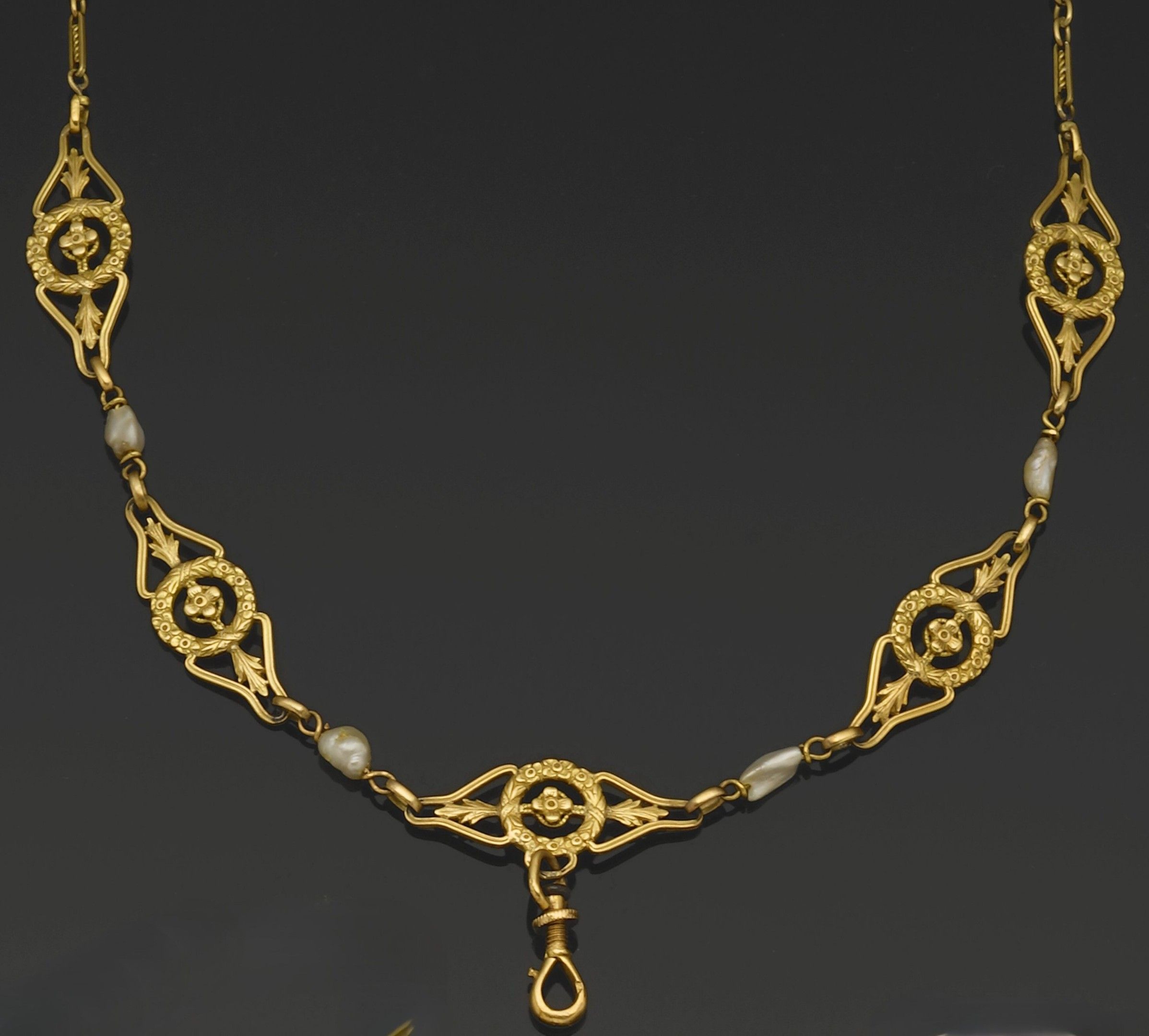 Necklace in 18K (750°/°°) yellow gold with oval mesh and cartouche links decorated with twists, the central openwork motifs forming plant crowns, interspersed with baroque mother-of-pearl, in the centre a "mousqueton" pendant clasp (attached). Silver (800°/°°) and 18K (750°/°°) yellow gold "buoy" clasp.