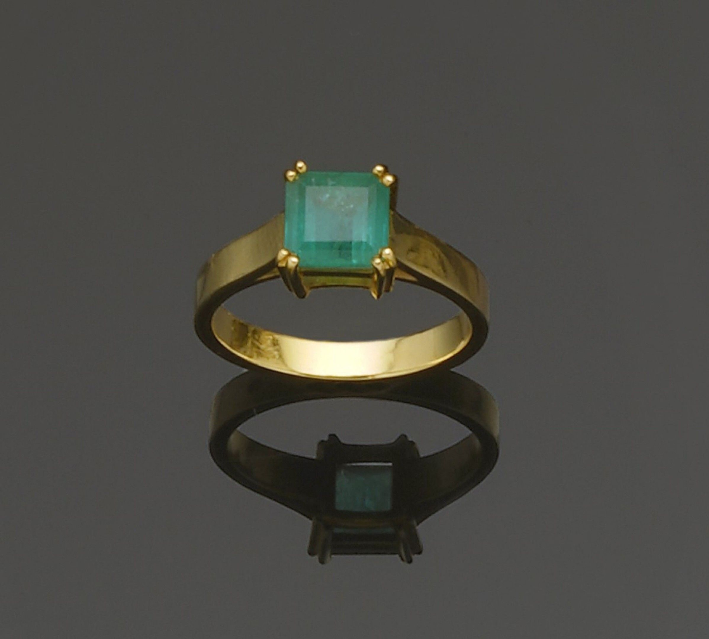 A smooth 18K (750°/°°) yellow gold ring, centred on a square cut emerald (possible traces of resin) weighing approximately 1.20 ct in a 4 double claw setting.