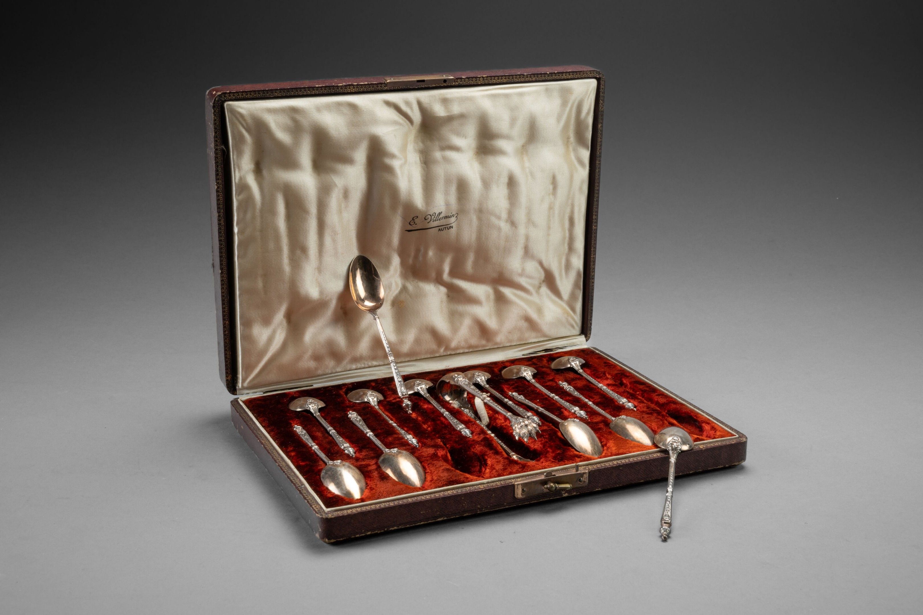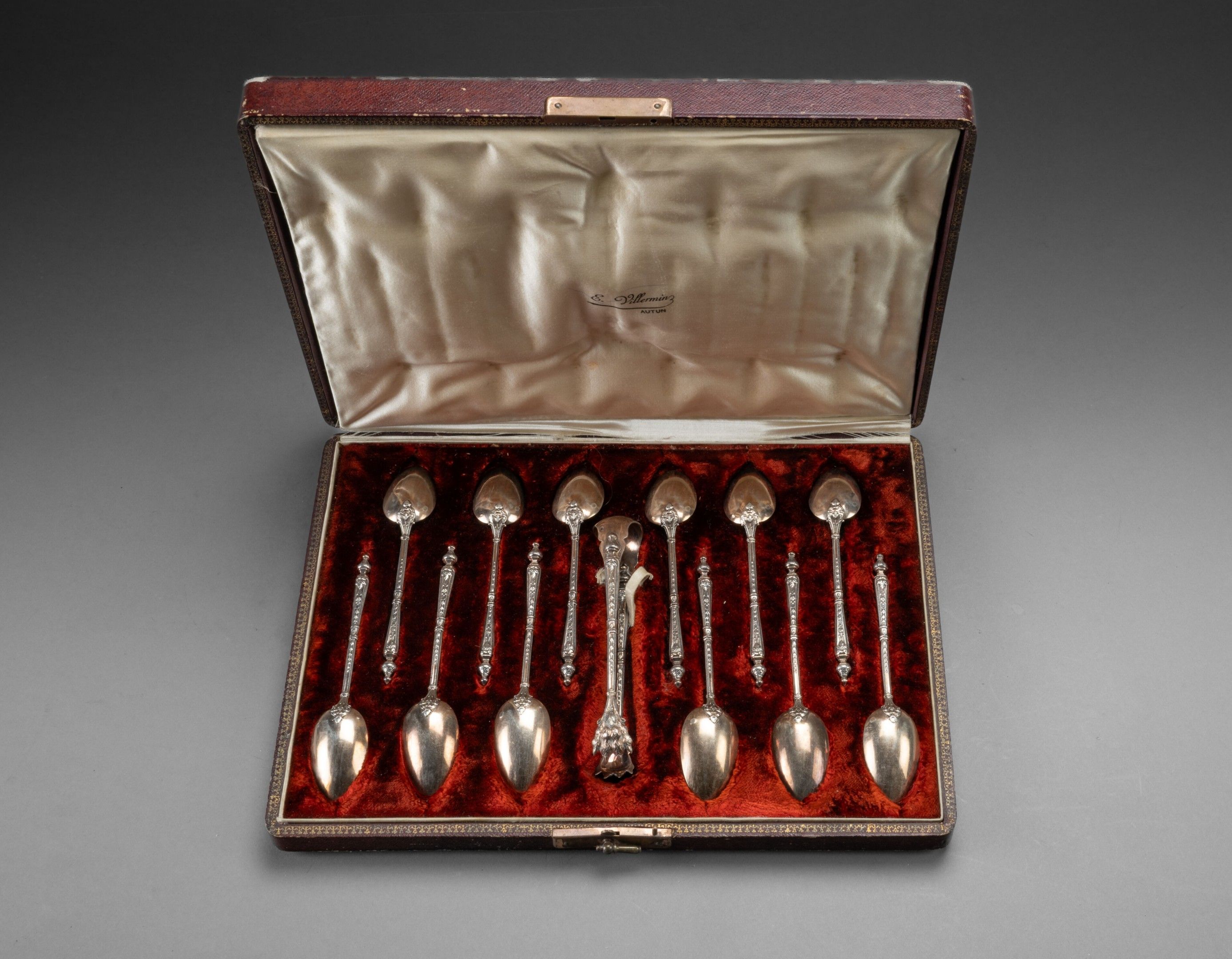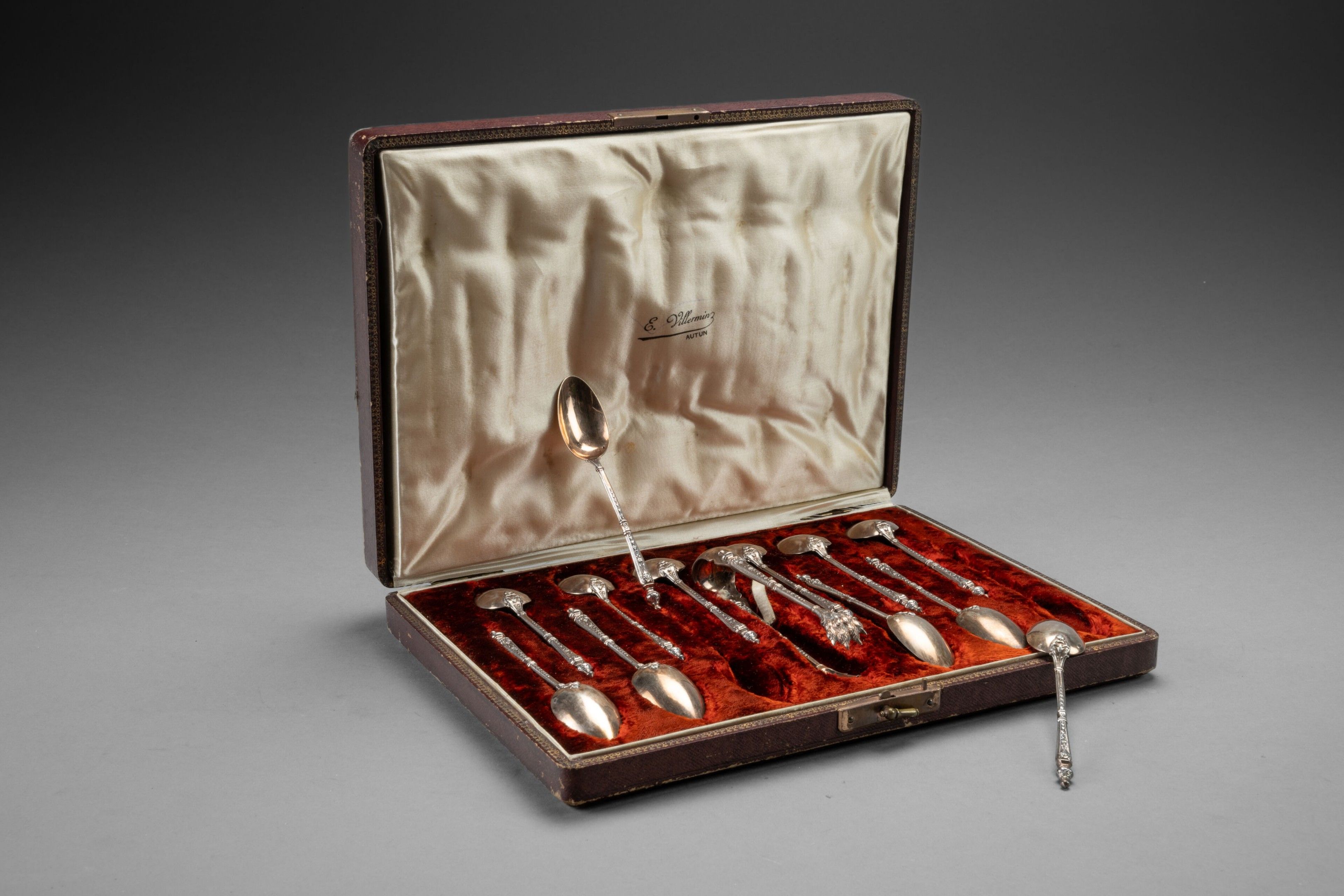 Twelve silver and vermeil tea and coffee spoons and matching sugar tongs, Russian-style handles decorated with acanthus leaves, foliate scrolls and fleurons, vermeil spoons in pink, sugar tongs with lion's paws. Boar's head Master-smith: Henri SOUFFLOT L: 12 cm - Weight 166 g ML Used condition, wear to the gilt under the spoon. Box made by E.VILLERMIN Autun (accidents and missing pieces) 13 pieces