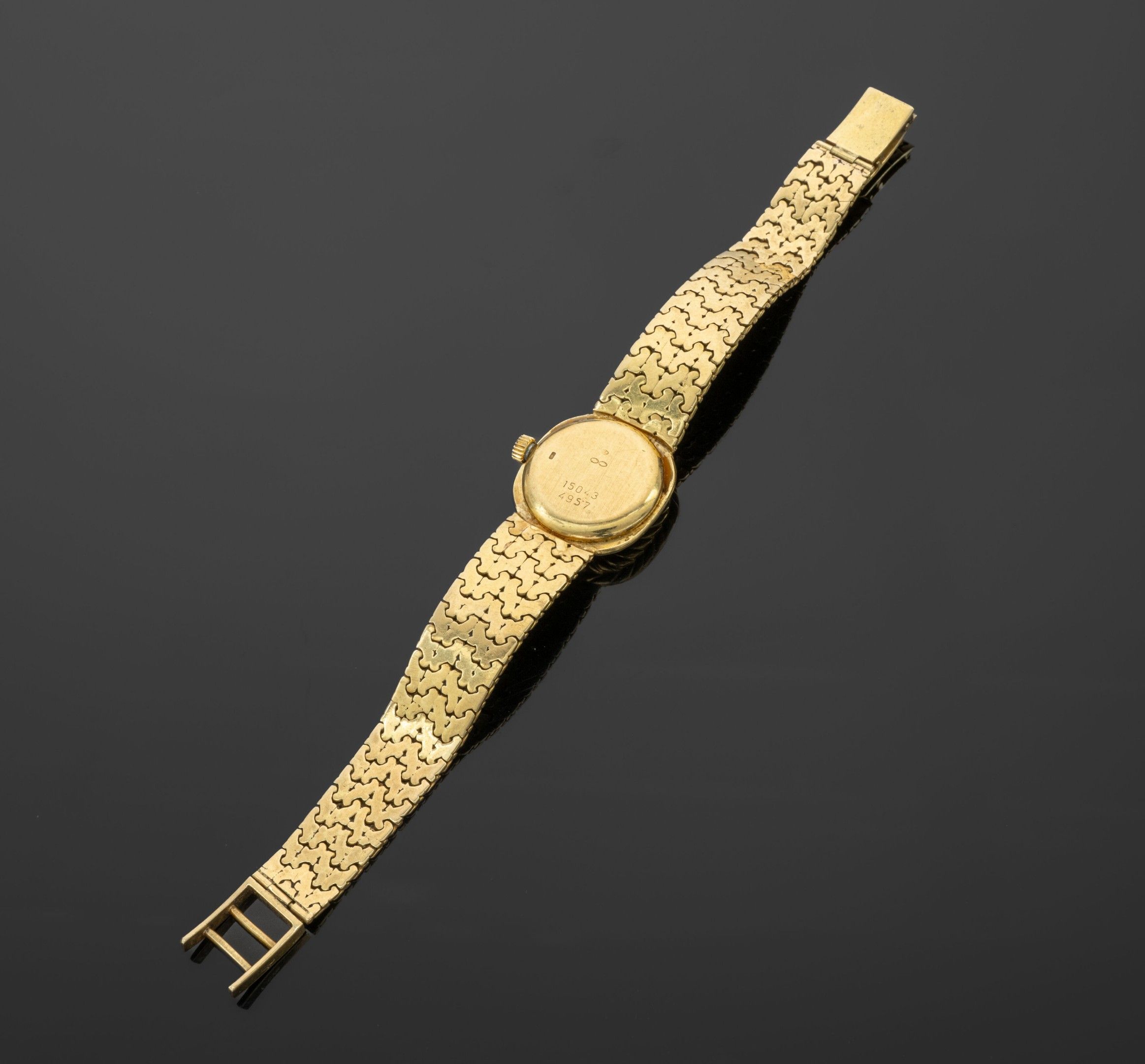 Watch in 18K (750°/°°) yellow gold, cushion-shaped dial with orange-brown background (slightly dirty), no index, hand-wound mechanical movement (ETA 2512 base calibre: signed). The numbered back bears the hallmark of master goldsmith Georges LOHAC in Paris. The bracelet, incorporated into the case, is in 18K (750°/°°) yellow gold with satin-finish articulated links.