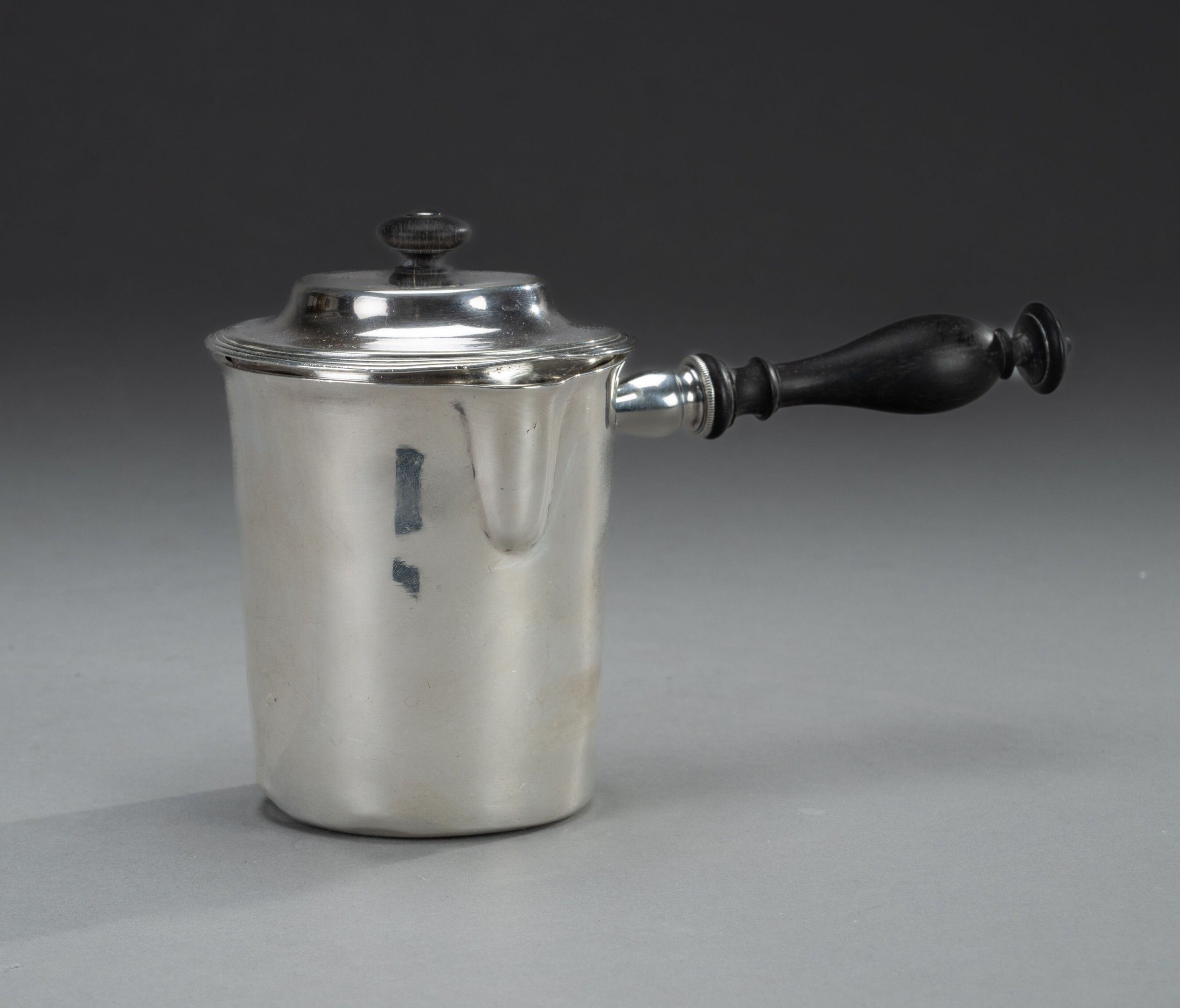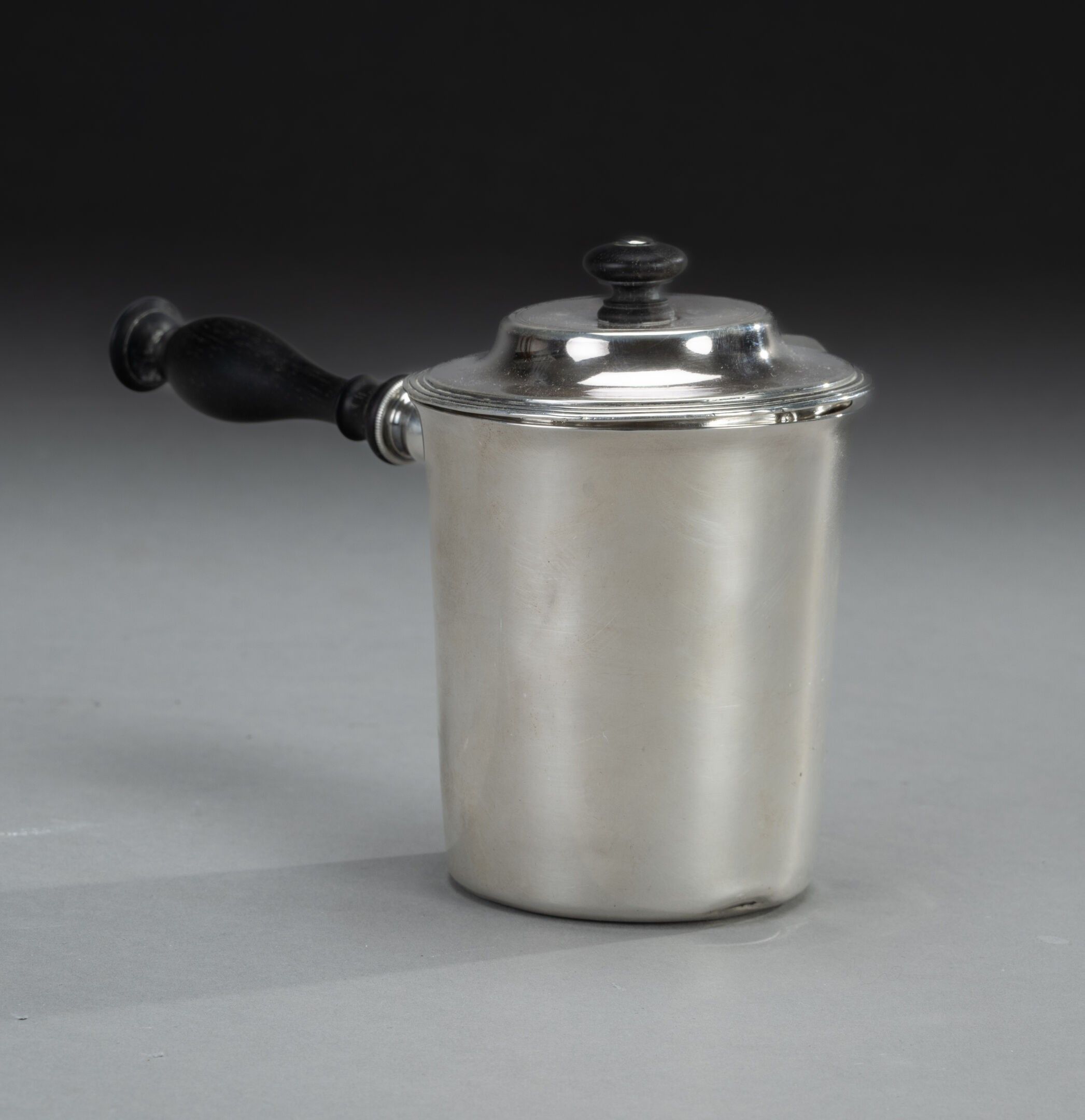 Covered cylindrical jug in plain silver, with plain spout and straight turned wooden handle