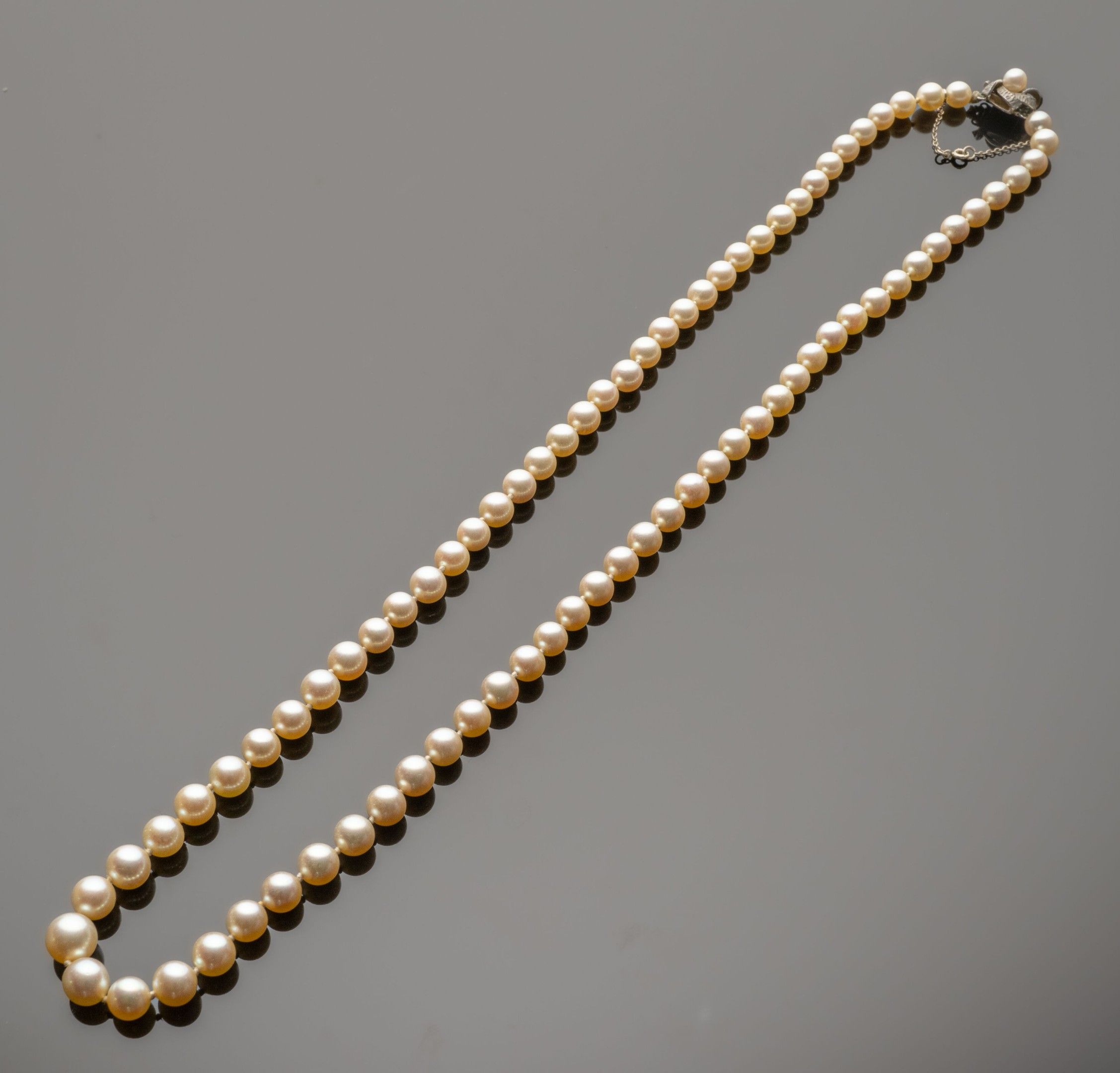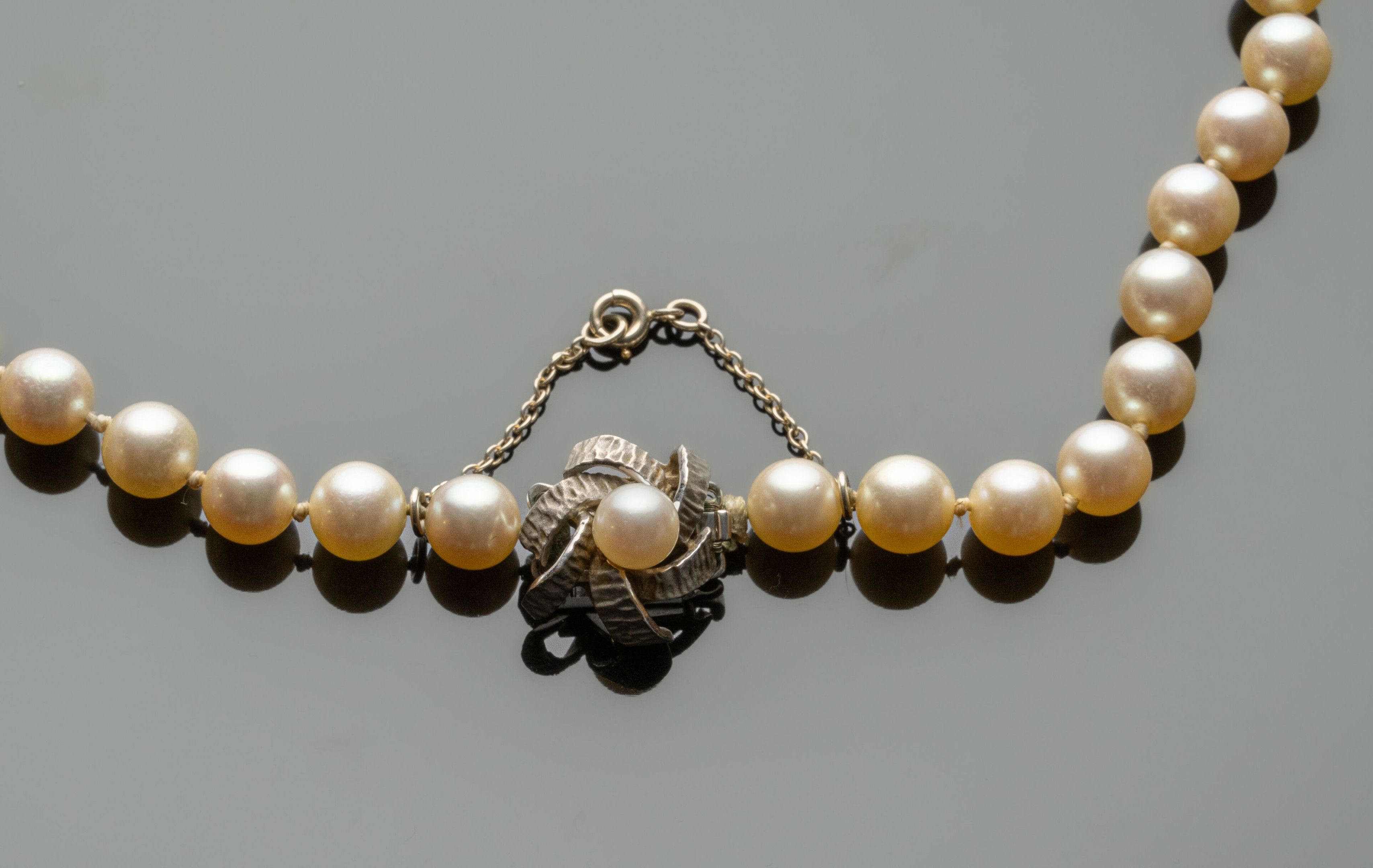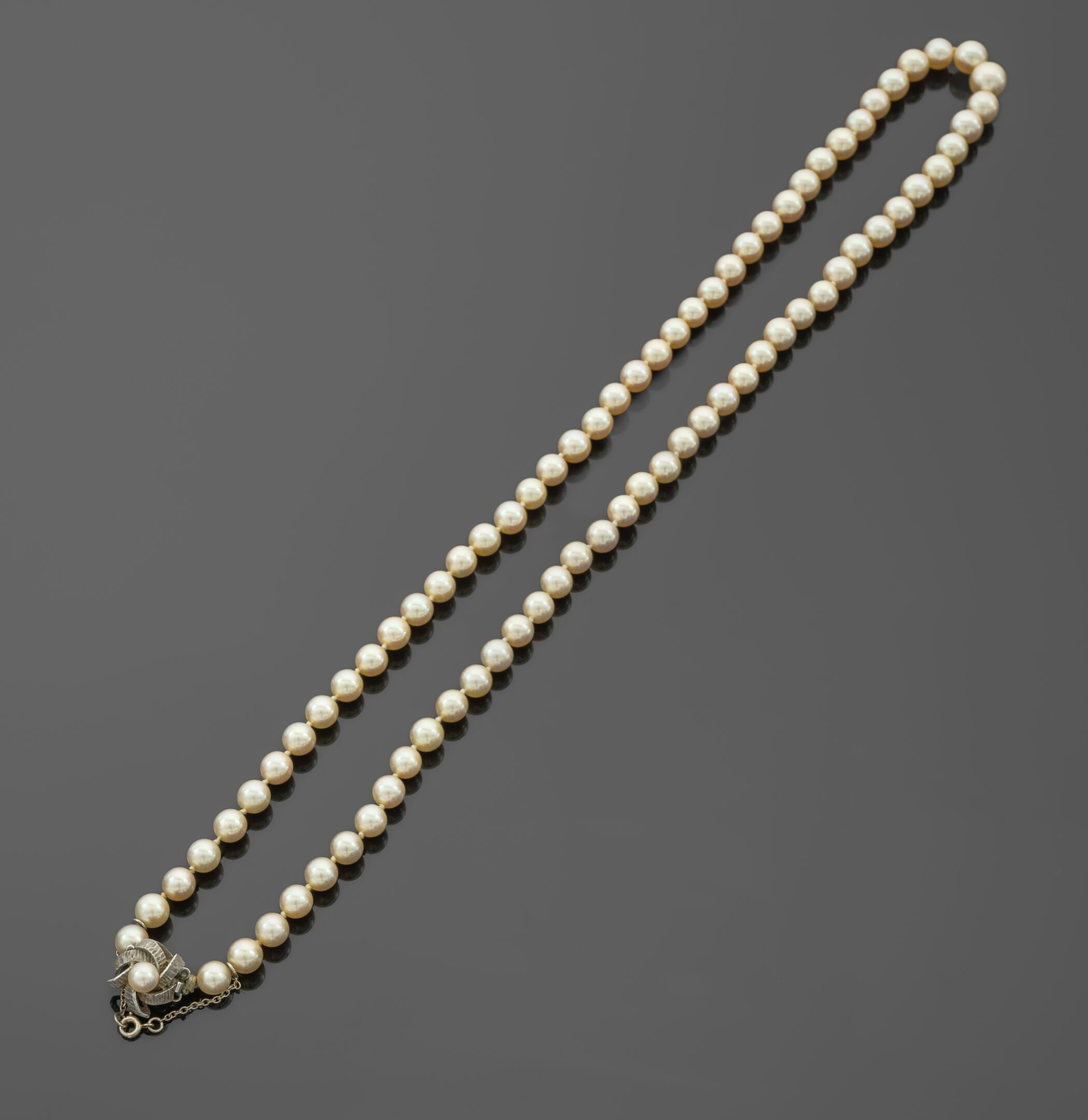 A necklace of tumbling cultured pearls (diameters: 6.3 to 9 mm approx.), the rosette clasp adorned with a cultured pearl, and the safety chain in 18K (750°/°°) white gold.