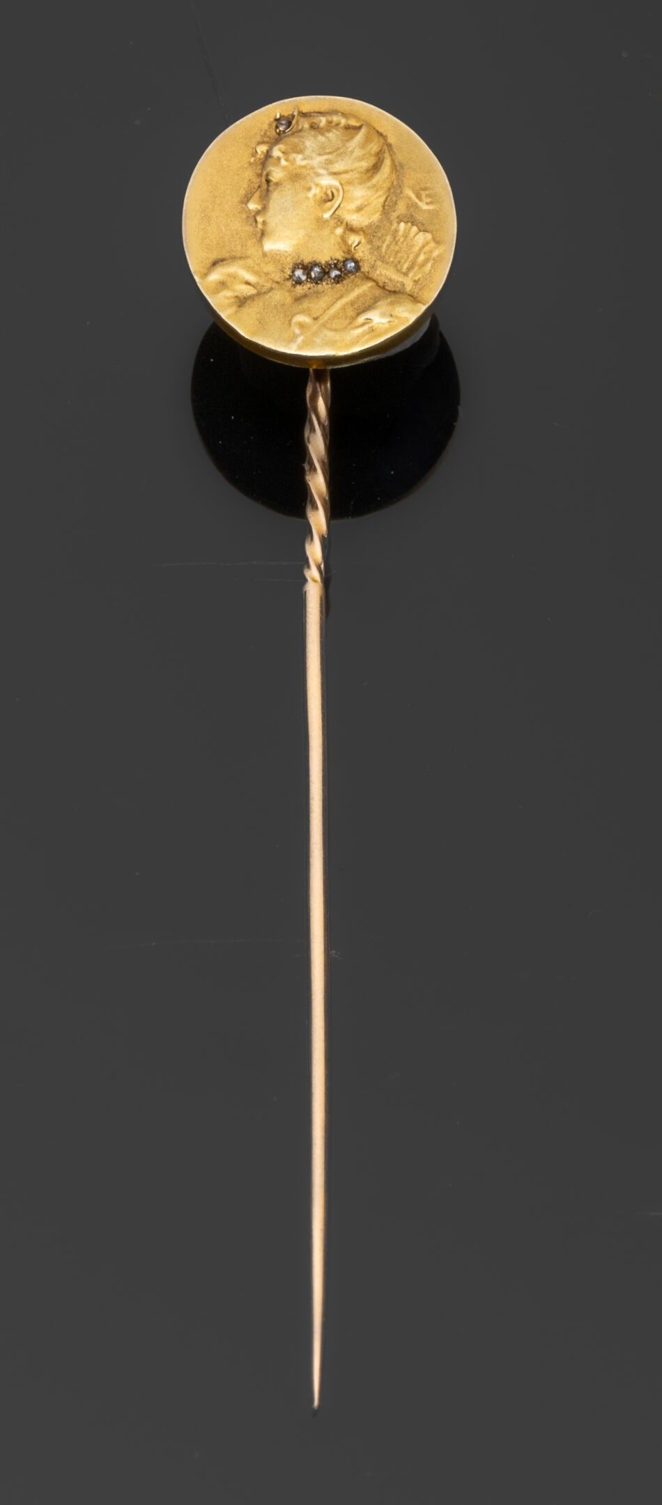Art Nouveau tie pin in 18K (750°/°°) yellow gold, the round motif (diameter approx. 14 mm) depicting an elegant woman in profile, the collar and cap set with small rose-cut diamonds, the shaft twisted.