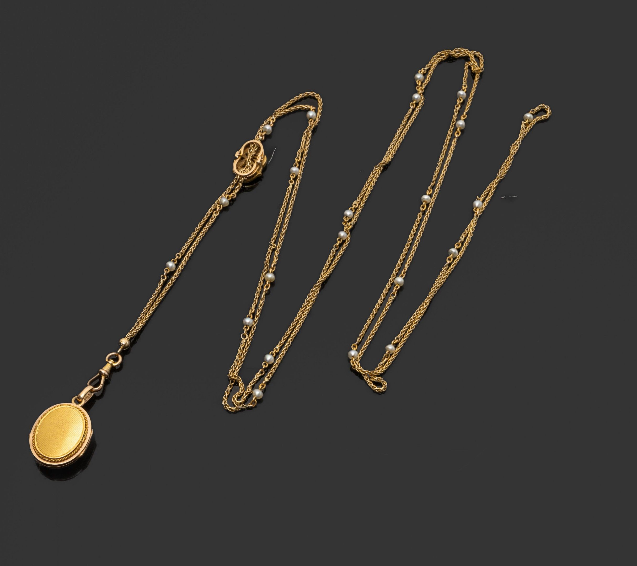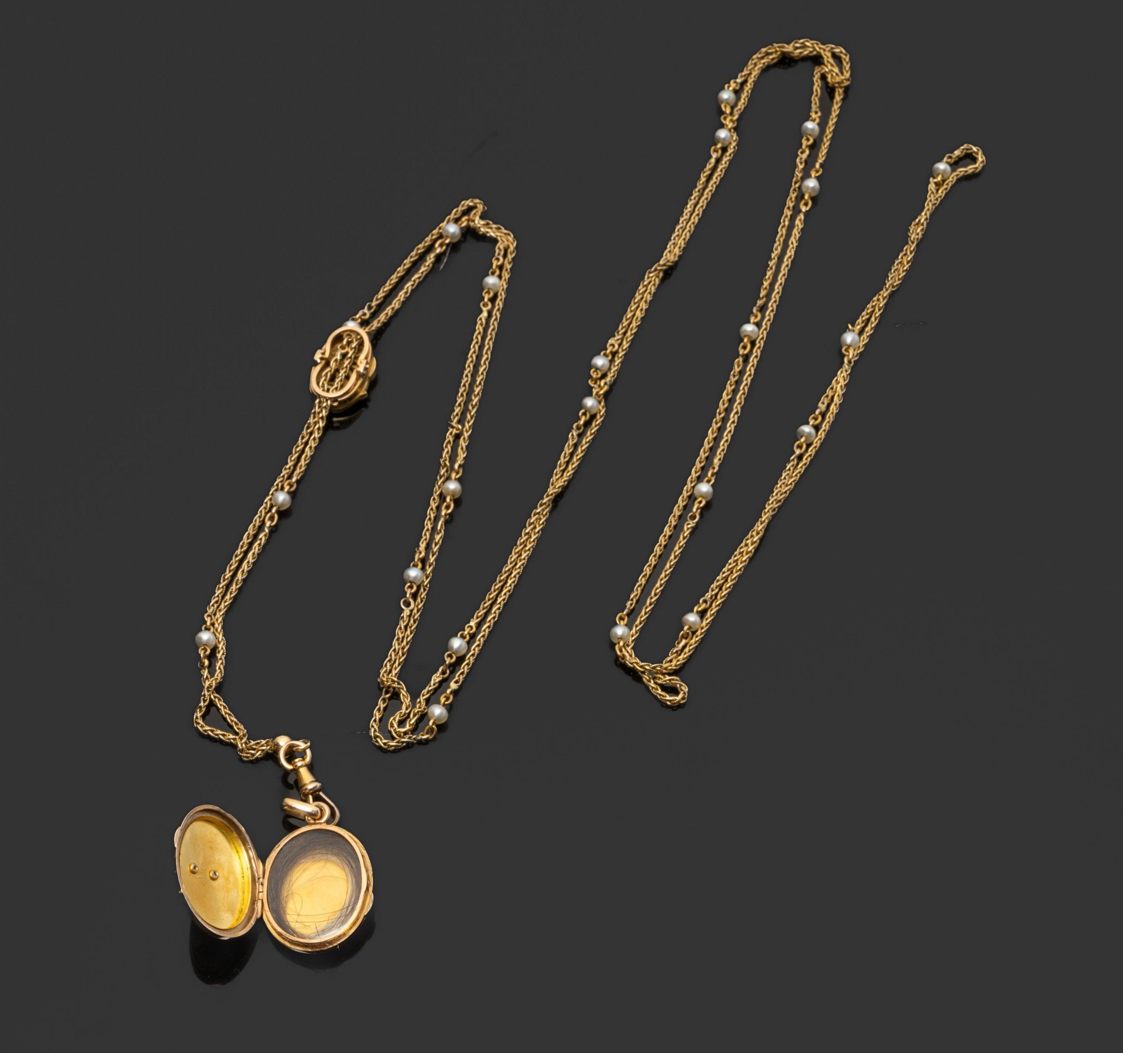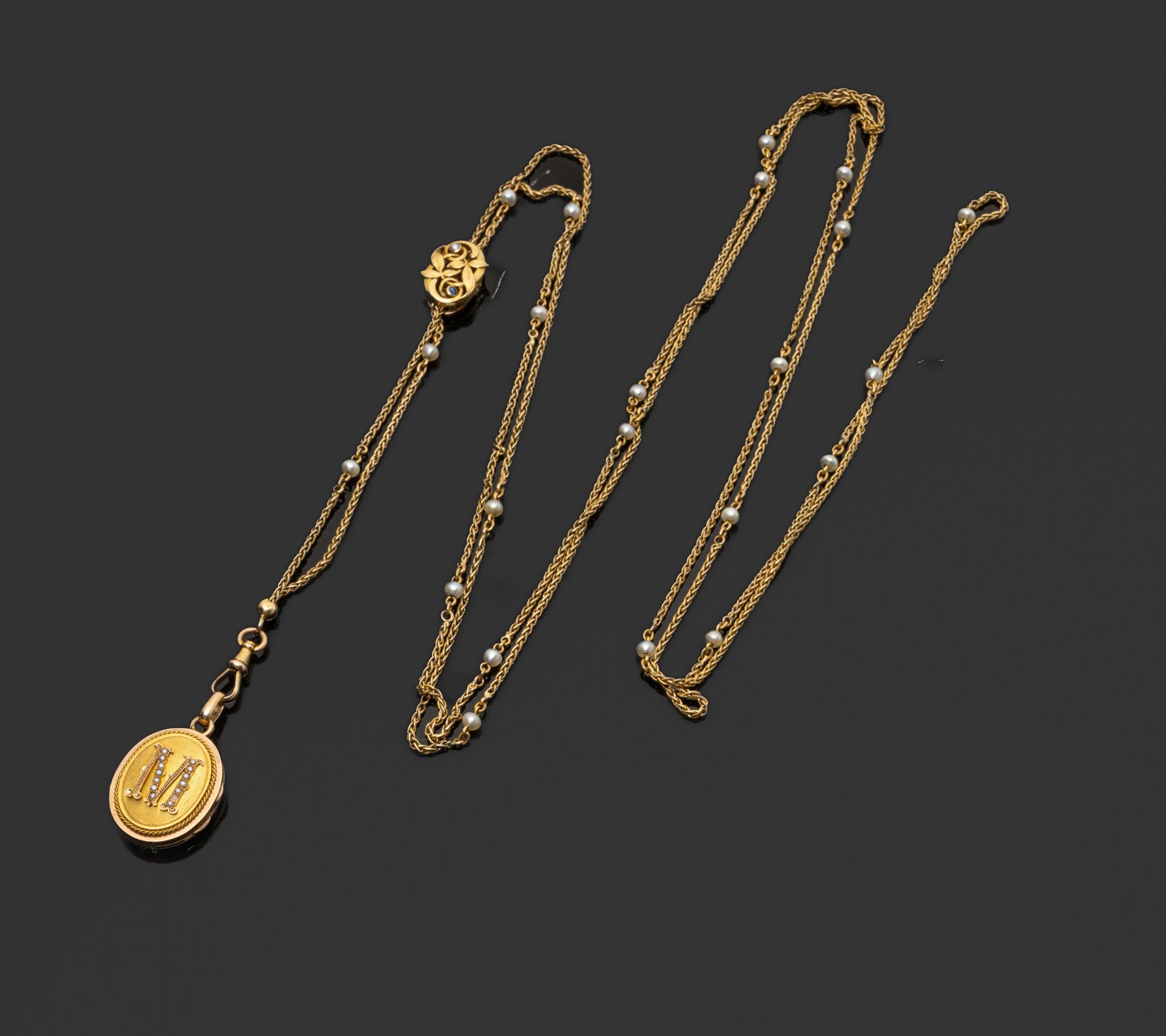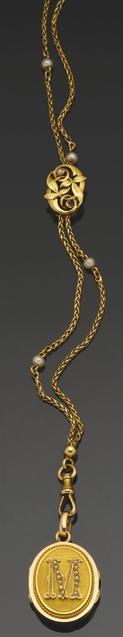 Long 18K (750°/°°) yellow gold waistcoat chain with smooth and twisted intertwined mesh (some weaknesses and twists) alternating with 22 small, slightly baroque, probably fine pearls (diameters: 4 to 4.3 mm, length of chain: approx. 95 cm double), and adorned with a runner with Art Nouveau plant decoration set with a half-pearl and a round sapphire (hallmarks "Tête de Cheval" and Master Silversmith: Broliquier et Rodet in Lyon), and an opening souvenir pendant (inner glass and lock of hair) with guilloché and twisted decoration, the face adorned with an "M" set with half-pearls (one damaged), height: approx. 33 mm.