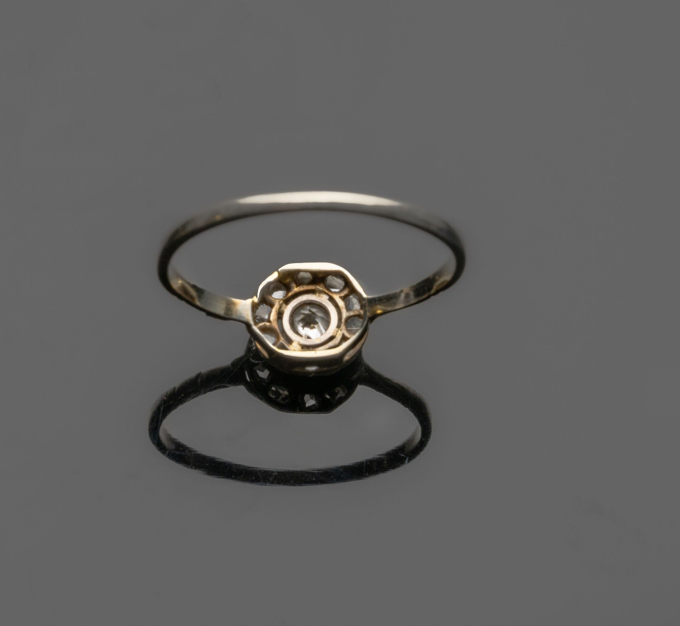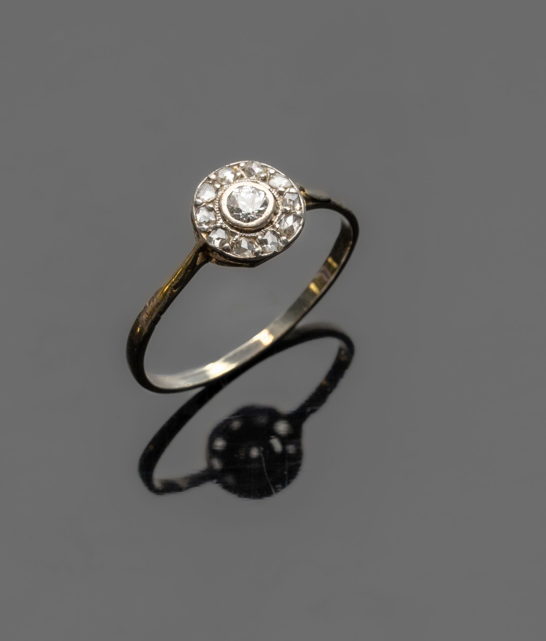 Ring in 18K (750°/°°) white gold, the plate, forming a daisy, centred on a brilliant-cut diamond measuring approximately 0.10 ct in a surround of small diamonds cut as crowned roses. Lateral wear due to rubbing: the yellow gold has been reworked, and the clasp is cracked.