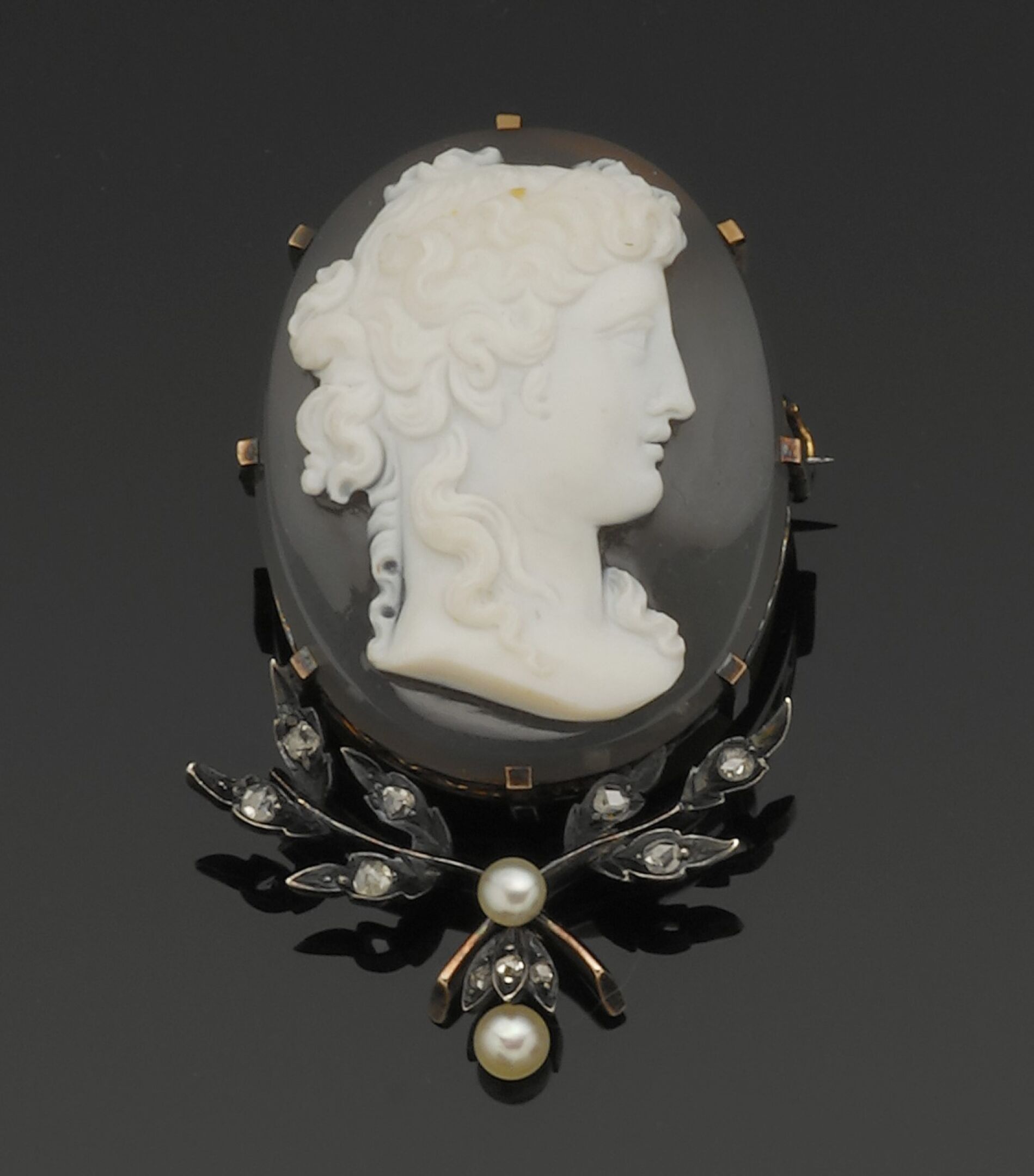 Brooch in 18K (750°/°°) yellow gold and silver (800°/°°), set with an oval cameo on two-tone agate depicting a woman's profile in the antique style, underlined by two crossed branches, set with rose-cut diamonds (one old-cut), centred on a button pearl and holding a second pearl in a pendant. Metal pin, later pearls added?