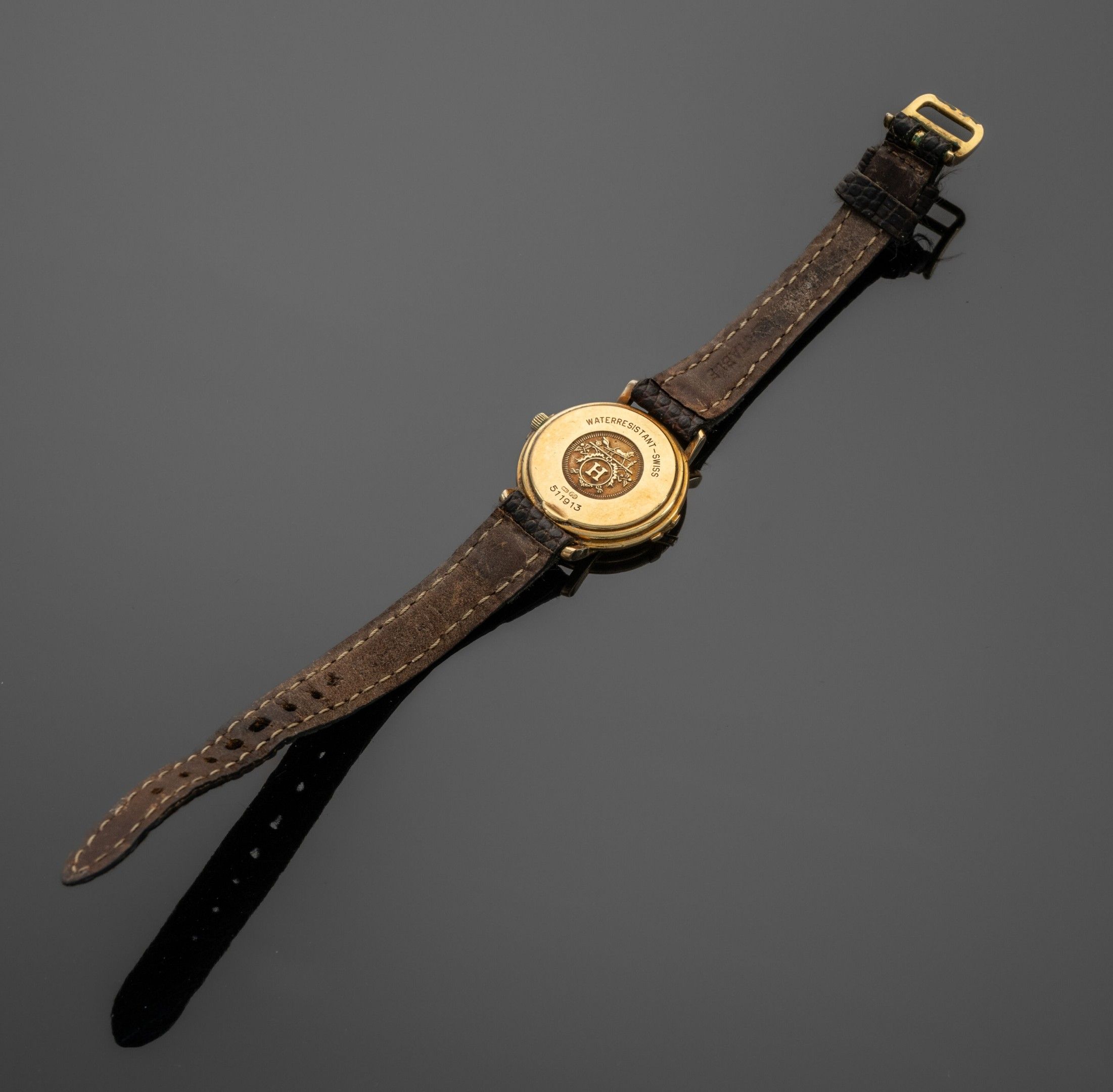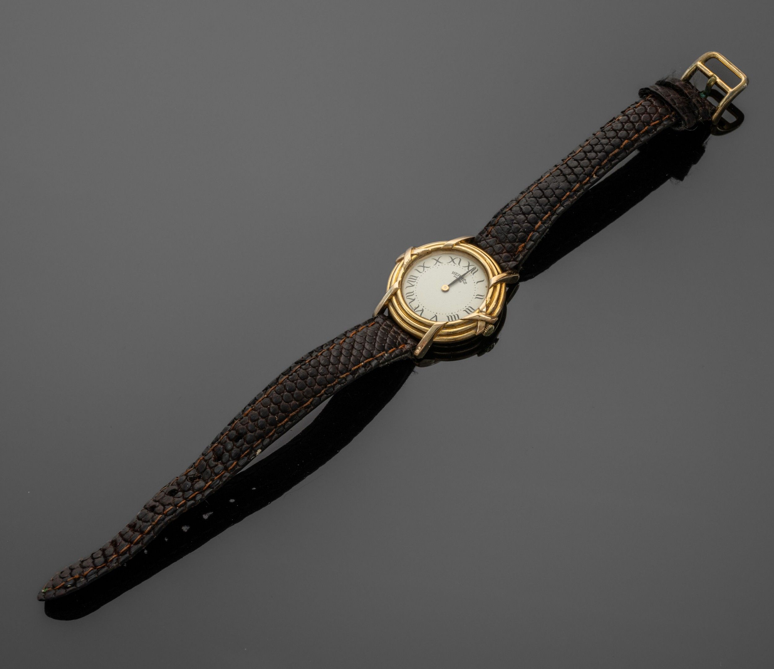 Watch in 18K (750°/°°) yellow gold, "Ruban" collection, round dial with white background (slight dust), black stylised Roman numerals, quartz movement (ETA 976.001 base calibre). Back stamped and numbered, Swiss guarantee marks, gold-plated metal winding crown (worn) stamped. Chocolate leather strap with gold-plated metal buckle (worn).
